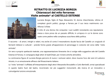 RITRATTO DI LUCREZIA BORGIA Chiaroscuri del mito ferrarese Visite animate® al CASTELLO ESTENSE Lucrezia Borgia, figlia di Papa Alessandro VI, donna chiacchierata, vittima di complessi giochi politici, giunge a Ferrara per il suo terzo matrimonio con Alfonso I d’Este. Il mito di una donna che conquista i suoi sudditi nonostante una reputazione messa a dura prova da un passato difficile, in un’epoca in cui le donne sono usate come pedine nella complessa scacchiera della politica. Il racconto – di amori, intrighi e veleni, ma anche di come il mecenatismo ducale faccia del Castello un crogiuolo di fermenti letterari e culturali – prende forma grazie all’apparizione di personaggi in costume nel corso della “visita animata”. Un vero e proprio spettacolo teatrale, una rappresentazione itinerante che si svolge nelle suggestive sale del Castello Estense di Ferrara, in compagnia degli attori di teatrOrtaet, per rivivere antiche atmosfere. La controversa figura di Lucrezia Borgia percorre di nuovo i sontuosi saloni, dove risuona l’eco dei versi di Ludovico Ariosto, in un emozionante affresco del Rinascimento italiano. La ”visita “animata” è affidata all’interpretazione degli attori Alessandra Brocadello e Carlo Bertinelli, ormai specializzati in questo teatro fuori dal teatro, incorniciato nei più suggestivi monumenti, alla ricerca di un innovativo e coinvolgente turismo emozionale. Le nostre date ANNO 2016 Sabato 6 febbraio, ore 15.30 (Carnevale Rinascimentale) Domenica 20 marzo, ore 15.30 Domenica 24 aprile, ore 15.30 Domenica 29 maggio, ore 15.30 Domenica 30 ottobre, ore 15,30 Domenica 27 novembre, ore 15,30 Sabato 31 dicembre, ore 15,30 Contatti Tel: 324-6286197 E-mail: [email protected] Sito: www.teatrortaet.it www.visiteanimate.it Seguici su Facebook: teatrOrtaet – Visite animate Prezzi Biglietto intero: 12,00 euro Biglietto ridotto: 10,00 euro (gruppo min. 15 persone) Biglietto bambini: 8,00 euro (fino ai 12 anni) INGRESSO AL CASTELLO: Intero e gruppi: 5,00 euro Ridotto gruppi scolastici: - scuole secondarie 3,00 euro - scuole primarie 1,00 euro Family: gratis un minore di 18 anni con adulto pagante Prenota direttamente sul nostro sito www.visiteanimate.it