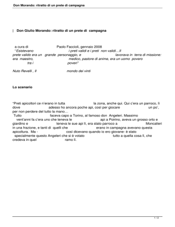 Don Morando: ritratto di un prete di campagna | Don Giulio Morando: ritratto di un prete di campagna a cura di Paolo Faccioli, gennaio 2008 “Esistevano i preti validi e i preti non validi…Il prete valido era un grande personaggio, e lavorava in terra di missione: era maestro, medico, pastore di anime, era un uomo povero tra i poveri” Nuto Revelli , Il mondo dei vinti Lo scenario “Preti apicoltori ce n’erano in tutta la zona, anche qui. Qui c’era un parroco, lì dove adesso ho ancora poche api, così per giocare un po’, per non perdere del tutto la mano… Tutto faceva capo a Torino, al famoso don Angeleri. Massimo vent’anni fa c’era uno che teneva le api a Poirino, aveva un grosso orto e giardino e teneva le sue api lì, era stato parroco a Moncalieri in una frazione, e tanti di quelli che erano in campagna avevano questa apicoltura. Ma così dicevano quando io ero giovane- è stato specialmente questo Angeleri che si è votato tutto a quella cosa lì, che credeva in quel ramo lì. 1/2 Don Morando: ritratto di un prete di campagna zucchero Allora proprio, c’era non un e allora c’era motivo ilpoi miele per avere lo sostituiva. ilassi miele, perché forse era caro, io e ricordo volte che mancava bambino Baldissero, castagno. anno: c’era fino altrimenti sono Io sono alla sempre adesso. seminano fine, stato rimane Una dove non la in pioggia, volta una in solo c’erano calcolando agosto zona c’erano più e tanti legnosa. poi qui allora che tanti in del primavera l’erba Roero, tiravano prati, Allora va adesso c’era Santo falciata ligià lungo. disfano boschi, pascolo, non Stefano, molto Questi esistono già. acacie prima e prati Invece non più in c’erano perché fiorivano modo iera allora sia gli particolare c’erano. eda liinteressava accorgimenti Monteu fanno sostanziosa, In di esui Roero, primavera anno poi lìlo che fioriti anche in ci alveari. guardava situazione. invitavano Quando C’era c’è dalla L’apicoltura questo stata già peste, la Angeleri la peste storia invece era prima, della che proprio la varroa era ma varroa entusiasta. eran una è in arrivata cosa cose quella diffusa, sporadiche, zona lìperso. all’insaputa e di avevano Pralormo, andavano tutti c’erano scuola e e ha bruciavano, rovinato trenta questi quaranta preti, tutta ci si la lui abbastanza riusciva… aveva Noi non aera Canale almeno anche c’era era per tempo. avevamo più duecento loro, più: per a ne volte moltiplicare, uno, alveari ho sentito doveva don ma Sandri parlare miele lui togliere viveva che non da proprio ne era prima. uno faceva prosperoso per Una niente quel volta lavoro qualcuno perchè per io sono lì. dare Era non venuto all’altro mi un ne ha “beneficiato”, avevano giù detto che nel non che Roero, una che qualche proprio avevano famiglie… Un viveva beneficiato aveva parrocchia anziani, lascito. di solo tutto e niente quel chi la ilEravamo formava vuol aveva ma beneficio: Ce messa tempo a ne sono che dire quel sono libero; un che al al fare beneficiati, mattino, gruppo bernoccolo servizio ancora avevano con non la con avevano una adesso, della parrocchia solo perché lìin una volta si parrocchia. questo dedicava adesso si chiesa: intorno cura diceva stessa, incarico. delle maggiormente sono chiesa alla Questi alle eanche persone, chiesa, poi superati, sei proprio A magari qui o un alle c’era erano certo andare materiale, cinque metteva si anche conservano punto molto magari a a del trovare un propagandare… una più nella mattino, qualcosa, cappellano liberi popolazione, quelli parrocchia, le perché e che persone lezione. lìavanti. non in costruivano Anche afatto mezzo, prendere avevano Su da Oggi che e nella noi lìAlba, tutto potevano gli rimaneva qui degli alveari Langa, le (Narzole api. sciami, l’alveare avere un Per si dove distruggono mezzo era con ilnon moderno, miele, adesso una quei degli buco parrocchia quindici, altri, ogni fanno del ma c’erano poco anno avevano tappo, venti una piccola), tempo ne grande alveari. dei e facevano un mettevano giovani con butalìn, ilQuando festa, parroco la morire varroa, che adi lo Montezemolo, una volevano faceva sciame quattro invece piccola anche dentro, o mettersi, allora botte, cinque, io qualche poi sono andavano segavano erano e andato loro dieci quello. famiglie sarà un del per 75 assieme Benevello anno, risparmio, c’era butalìn… prendere qualcuno avevano chili due noi E facevano una ad noi, di che cos’abbiamo anni, miele, richiesta ilancora invece portati a che è miele: alveari “Sono un Lequio un ilnoi noi si vino, paese a di èPortandoli professore contadini, enorme. gli moderni, casa, fare messo vuoti fatto? Berria avevano davamo a delle dieci lisono adesso”. Portavamo Avevo dove in toglievamo perché nel ilabbiamo grande, ricordo chilometri recipienti 70, siamo e diversi Pazienza, 72. andare erano già che lìin su stati, Anche da ala vecchi bell’e da del solo mi Montezemolo, amici dal erano ha Alba, miele, si perchè iè falegname, recipente. contadini che chiesto pensava.” che nella anche si magari servivano fatto una pesava Langa. ma due così, volta edelle che Siccome avevamo confezionato, io escogitavano alveari ilprati, ho avevano e come c’era Dopo butalìn: facevano solo una proprio alveari. fatto qualche lirestavano trovato le ha volta qui e qualcosa, api. le morire portati loro ci scuole E la tempo, quelli tutte Nel saranno adesso ricerca ci a davano 65, le le che quella api un 70, ci di La scoperta dell’impollinazione “Tutti Valle Cuneo. Risparmio, invitato molto, dei era documentario formaggi, brillante San si e perché E’ interessavano ha Lorenzo venuto poi cercato Vidano, alla a era della passo fondazione Oddero, Roero, anche di una a propagandare ridotto era quelle assessore che festa dov’ero tutto della sull’ape un dei del entusiasta. tempo Banca vini. miele, all’agricoltura Camera Quella era Regionale siamo E volta di cose stati Commer