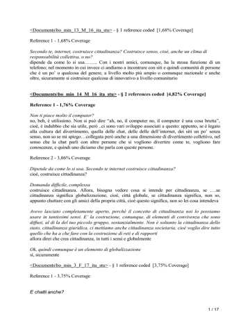 <Documents\bo_min_13_M_16_ita_stu> - § 1 reference coded [1,68% Coverage] Reference 1 - 1,68% Coverage Secondo te, internet, costruisce cittadinanza? Costruisce senso, cioè, anche un clima di responsabilità collettiva, o no? dipende da come lo si usa…….. Con i nostri amici, comunque, ha la stessa funzione di un telefono; nel momento in cui invece ci andiamo a incontrare con siti e quindi comunità di persone che è un po’ o qualcosa del genere, a livello molto più ampio o comunque nazionale e anche oltre, sicuramente si costruisce qualcosa di innovativo a livello comunitario <Documents\bo_min_14_M_16_ita_stu> - § 2 references coded [4,82% Coverage] Reference 1 - 1,76% Coverage Non ti piace molto il computer? no, beh, è utilissimo. Non si può dire “ah, no, il computer no, il computer è una cosa brutta”, cioè, è indubbio che sia utile, però ..ci sono vari sviluppo associati a questo: appunto, se è legato alla cultura del divertimento, quella delle chat, delle delle dell’internet, dei siti un po’ senza senso, non so se mi spiego…collegata però anche a una dimensione di divertimento collettivo, nel senso che la chat parli con altre persone che si vogliono divertire come te, vogliono fare conoscenze, e quindi uno diciamo che parla con queste persone. Reference 2 - 3,06% Coverage Dipende da come lo si usa. Secondo te internet costruisce cittadinanza? cioè, costruisce cittadinanza? Domanda difficile, complessa costruisce cittadinanza. Allora, bisogna vedere cosa si intende per cittadinanza, se ….se cittadinanza significa globalizzazione, cioè, città globale, se cittadinanza significa, non so, appunto chattare con gli amici della propria città, cioè questo significa, non so lei cosa intendeva Avevo lasciato completamente aperto, perché il concetto di cittadinanza noi lo possiamo usare in tantissimi sensi. E’ la costruzione, comunque, di elementi di convivenza che sono diffusi, al di la del tuo piccolo gruppo, sostanzialmente. Non è soltanto la cittadinanza dello stato, cittadinanza giuridica, ci mettiamo anche cittadinanza societaria, cioè voglio dire tutto quello che ha a che fare con la costruzione di reti e di rapporti allora direi che crea cittadinanza, in tutti i sensi e globalmente Ok, quindi comunque è un elemento di globalizzazione sì, sicuramente <Documents\bo_min_3_F_17_ita_stu> - § 1 reference coded [3,75% Coverage] Reference 1 - 3,75% Coverage E chatti anche? 1 / 17 È capitato. E ti è capitato anche di dare dei nomi diversi, di non farti identificare? Sì, perché alcune volte è una questione di sicurezza, perché si sentono cose così, altre perché è divertente, per cambiare la propria identità ed essere una persona diversa. Chatti, un po’ per ricerca ed uso personale. La posta anche? Tanto. Con le mie amiche tanto, abbiamo un codice, due squilli sul cellulare significa ti ho inviato una mail, quindi ci mandiamo le mail e abbiamo un segnale di ricezione. La usate più dei messaggini? Sì, forse sì. La posta elettronica di più. Ce l’hai a casa? Sì. Anche il nostro prof ci manda del materiale da studiare attraverso la posta elettronica Quindi diventa indispensabile? Sì, o chi non ha la posta elettronica farà le fotocopie a scuola. Chattando si entra in contatto con persone che non conosci. Ti è capitato di entrare in contatto con persone di altri paesi? O di altri posti in Italia’ Altri paesi no, altri posti in Itali sì. <Documents\bo_min_4_M_17_ita_stu> - § 1 reference coded [3,35% Coverage] Reference 1 - 3,35% Coverage Chat? Per un periodo sono stato in un forum, troppo fico, cioè quello dipende dalla gente che ci trovi, faccio un po’ fatica a capire quelli che stanno ore e ore a parlare,ciao come stai… non mi piace Odio il telefono anche per quello Normale o cellulare? Cellulare. Per me il telefono è un modo per comunicare velocemente, cose precise, tipo portami un libro, ci vediamo oggi, preparami il disco Tu hai il cellulare? 2 / 17 Sì Lo usi? Lo uso molto , perché adesso come adesso non averlo è un danno, tutti ce l’hanno e non averlo è un handicap molto grosso Quindi dici ce l’ho perché se no è un handicap, però non mi piace Lo uso, ma per comunicare velocemente, non per chiacchierare Non fai foto, ma per comunicazioni rapide Sì Sms? Anche. <Documents\bo_min_5_F_19_ita_stu> - § 1 reference coded [0,35% Coverage] Reference 1 - 0,35% Coverage Quindi non lo usi neanche per chattare? Non mi piace tanto, preferisco lettere, più manuale <Documents\bo_min_6_F_18_ita_stu> - § 1 reference coded [0,26% Coverage] Reference 1 - 0,26% Coverage Quindi il computer non lo usi neanche per chattare, email… Assolutamente no. Non lo uso <Documents\bo_min_7_F_19_ita_stu> - § 1 reference coded [3,00% Coverage] Reference 1 - 3,00% Coverage un computer tu lo usi? 24 ore su 24 Chatti? Con il mio ragazzo francese eravamo sempre in chat, perché essendo lontani ci 3 / 17 vedevano con la webcam , bello per carità perché hai la possibilità di mantenere rapporti ovunque, però perdi il gusto di guardare la persona negli occhi, sentire la voce dal vivo, è tutta una altra cosa E rispetto le chat, le hai usate solo in questa occasione, o lo fai di solito, usi nickname? No, il nickname non mi interessa, mi piace il mio nome perciò lo metto, ho chattato in quel periodo molto, delle ore ha chattare, non solo con il mio ragazzo, anche con altri, poi pian piano ho smesso perché le persone che sono in chat sono sempre le stesse e si perde il rapporto. Adesso che ho la macchina dico faccio un salto a casa tua, perché mantenere rapporti via chat dopo un po’ stanca <Documents\bo_min_8_M_18_ita_stu> - § 1 reference coded [0,71% Coverage] Reference 1 - 0,71% Coverage poi sì, vado anche abbastanza spesso su internet, più che altro per messaggi di comunicazione via messanger con gente anche di altre regioni d’Italia che non vedo mai e sento solo via messangers. Principalmente questi sono gli usi. Oppure per scrivere raccon