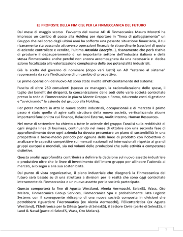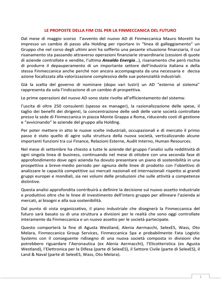 LE PROPOSTE DELLA FIM CISL PER LA FINMECCANICA DEL FUTURO Dal mese di maggio scorso l’avvento del nuovo AD di Finmeccanica Mauro Moretti ha impresso un cambio di passo alla Holding per riportare in “linea di galleggiamento” un Gruppo che nel corso degli ultimi anni ha sofferto una pesante situazione finanziaria, il cui risanamento sta passando attraverso operazioni finanziarie straordinarie (cessioni di quote di aziende controllate e vendite, l’ultima Ansaldo Energia…), risanamento che però rischia di produrre il depauperamento di un importante settore dell’industria italiana e della stessa Finmeccanica anche perché non ancora accompagnata da una necessaria e decisa azione focalizzata alla valorizzazione complessiva delle sue potenzialità industriali. Già la scelta del governo di nominare (dopo vari lustri) un AD “esterno al sistema” rappresenta da sola l’indicazione di un cambio di prospettiva. Le prime operazioni del nuovo AD sono state rivolte all’efficientamento del sistema: l’uscita di oltre 250 consulenti (spesso ex manager), la razionalizzazione delle spese, il taglio dei benefit dei dirigenti, la concentrazione delle sedi delle varie società controllate presso la sede di Finmeccanica in piazza Monte Grappa a Roma, riducendo costi di gestione e “avvicinando” le aziende del gruppo alla Holding. Per poter mettere in atto le nuove scelte industriali, occupazionali e di mercato il primo passo è stato quello di agire sulla struttura della nuova società, verticalizzando alcune importanti funzioni tra cui Finance, Relazioni Esterne, Audit Interno, Human Resources. Nel mese di settembre ha chiesto a tutte le aziende del gruppo l’analisi sulla redditività di ogni singola linea di business, continuando nel mese di ottobre con una seconda fase di approfondimento dove ogni azienda ha dovuto presentare un piano di sostenibilità in una prospettiva a breve-medio periodo per ognuna delle linee di prodotto con l’obiettivo di analizzare le capacità competitive sui mercati nazionali ed internazionali rispetto ai grandi gruppi europei e mondiali, sia nei volumi delle produzioni che sulle attività a competenze distintive. Questa analisi approfondita contribuirà a definire la decisione sul nuovo assetto industriale e produttivo oltre che le linee di investimento dell’intero gruppo per allineare l’azienda ai mercati, ai bisogni e alla sua sostenibilità. Dal punto di vista organizzativo, il piano industriale che disegnerà la Finmeccanica del futuro sarà basato su di una struttura a divisioni per le realtà che sono oggi controllate interamente da Finmeccanica e un nuovo assetto per le società partecipate. Questo comporterà la fine di Agusta Westland, Alenia Aermacchi, SelexES, Wass, Oto Melara, Finmeccanica Group Services, Finmeccanica Spa e probabilmente Fata Logistic Systems con il conseguente ridisegno di una nuova società composta in divisioni che potrebbero riguardare l’Aeronautica (ex Alenia Aermacchi), l’Elicotteristica (ex Agusta Westland), l’Elettronica per la Difesa (parte di SelexES), il Settore Civile (parte di SelexES), il Land & Naval (parte di SelexES, Wass, Oto Melara). 1 I COMPETITORI Uno dei motivi dell’operazione in corso per Finmeccanica riguarda la costruzione di un modello industriale e di una struttura societaria che è comune ai suoi maggiori competitori Europei quali Airbus, Thales, Bae Systems. Alcuni dati: FINMECCANICA: fattura 16 mld€ (2013) ha un portafoglio ordini di 42,7 mld€, un debito estremamente pesante di 3,9 mld€ che nella gestione ordinaria supera i 5 miliardi (con un patrimonio pari a 3,67mld€!!!) scarsa capacità di generare cassa e 63.800 addetti. TAHLES: fattura oltre 14 mld€, ha un portafoglio ordini di 30 mld€, investimenti in ricerca e sviluppo per 2,5 mld€ annui, una buona capacità di generare cassa (FOCF), un utile netto di circa 650 ml€ e occupa 66.500 dipendenti. AIRBUS: strutturata in 3 divisioni, fattura circa 60 mld€ di cui 40 nel comparto aeronautico (oltre 600 mld€ di portafoglio ordini), 14,5 nell’elettronica per la difesa (circa 21 mld€ di portafoglio ordini) e spazio (5,7mld€ portafoglio ordini), oltre 6 mld€ nell’elicotteristica (oltre 12 mld€ di portafoglio ordini). Investe in ricerca e sviluppo oltre 3 mld€ annui, un Ebit cresciuto nel 2013 del 24% e 144.000 dipendenti (+ 3% sul 2013). BAE SYSTEMS: fattura 23 mld€, ha oltre 53 mld€ di portafoglio ordini, una bassa esposizione debitoria e oltre 88.000 dipendenti. Caratteristiche principali di tutti competitori sono le capacità ingegneristiche e produttive, ma soprattutto l’essere integratori di sistemi, con una grande capacità di offrire l’integrazione tra i vari prodotti delle diverse divisioni; ciò rappresenta il maggior valore aggiunto sia industriale che commerciale del prodotto. MERCATI DI RIFERIMENTO I mercati a cui fa riferimento Finmeccanica (come i suoi competitori) sono prevalentemente di carattere istituzionale, sia nell’ambito civile che della difesa, sia interno che internazionale. Il mercato dell’aerospazio, sicurezza e difesa ha un volume di attività annue che si aggira in circa 375 miliardi di euro, di cui 155 quello americano, 95 quello europeo e 125 il resto del mondo. Nella suddivisione tra le attività, l’elettronica per la difesa pesa il 23%, l’aeronautica civile il 20%, la sicurezza il 18%, l’aeronautica militare il 16%, lo spazio il 12%, i sistemi d’arma e i missili il 7%, l’elicotteristica il 4%. L’asse attorno al quale ruota il mercato dell’aerospazio e difesa, si sta progressivamente spostando verso nuove potenze economiche emergenti: Brasile, India, Cina, Turchia, Argentina. La riduzione del mercato europeo e lo stallo di quello americano, sono compensate quindi da quello sudamericano e asiatico, oltre alla tenuta del tradizionale mercato dei paesi mediorientali. 2 Fra le prime dieci società mondiali del settore, sei sono americane e quattro euro