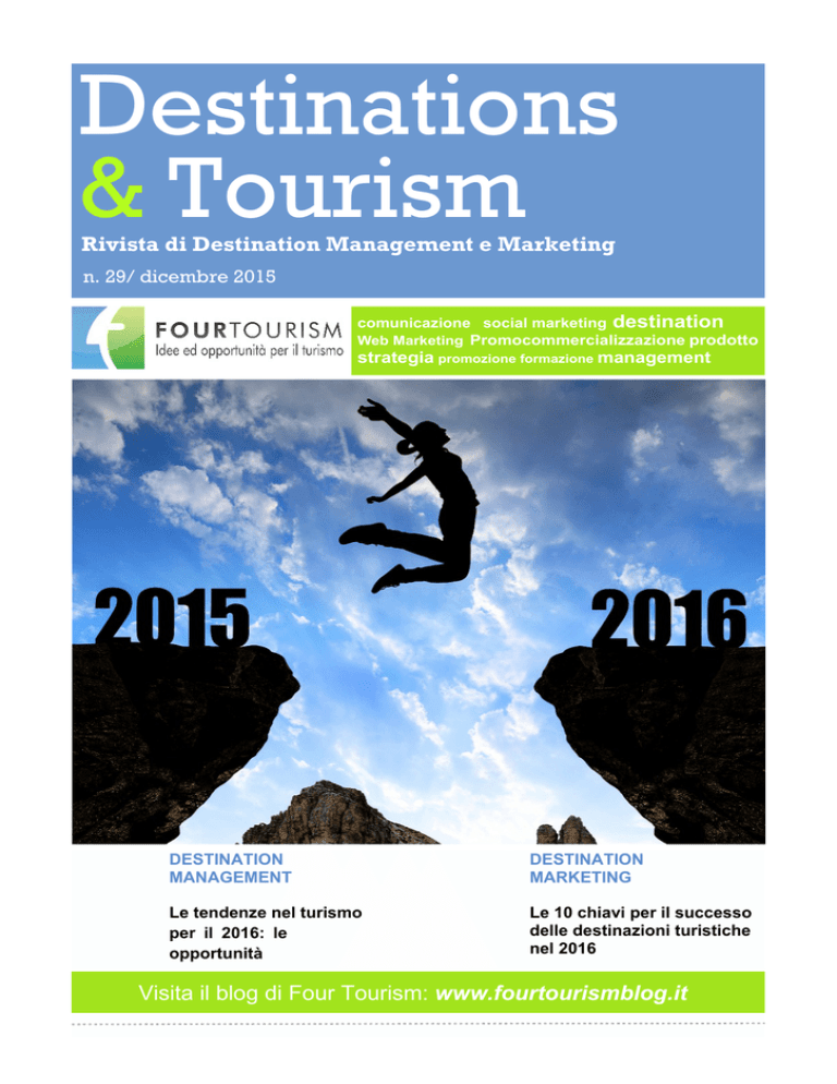 Destinations & Tourism Rivista di Destination Management e Marketing n. 29/ dicembre 2015 comunicazione social marketing destination Web Marketing Promocommercializzazione prodotto strategia promozione formazione management DESTINATION MANAGEMENT DESTINATION MARKETING Le tendenze nel turismo per il 2016: le opportunità Le 10 chiavi per il successo delle destinazioni turistiche nel 2016 Visita il blog di Four Tourism: www.fourtourismblog.it Destinations & Tourism n° 29| dicembre 2015 Editoriale i contesti socio-economici. Abbiamo quindi ritenuto opportuno dedicare questo ultimo numero dell’anno per illustrarvi i trend che secondo Four Tourism caratterizzeranno il mercato turistico nel 2016. Da una parte, evidenziando, i macro fattori che influenzeranno e si ripercuoteranno sull’andamento del turismo italiano, dall’altra, analizzando, una ad una, da vicina quelle che saranno invece le tendenze determinanti proprie del settore turistico. I trend riflettono quelli che sono i nuovi bisogni e le nuove esigenze dei consumatori. Indicano e suggeriscono indirettamente le possibili direzioni da seguire per riuscire a soddisfarli. Generalmente, impongono la necessità di innovarsi e di reinventarsi e generalmente, se colti ed accolti in tempo utile, offrono la possibilità di cogliere nuove opportunità e di dare ai propri clienti ciò che veramente vogliono. E ciò si rivela di estrema utilità in un settore come il turismo che è sempre in continua evoluzione e trasformazione, attraversato da profondi e radicali cambiamenti e che impone – negli ultimi anni in particolare - agli addetti ai lavori di mettersi in discussione, di cambiare, di evolvere. Non poteva mancare poi uno sguardo al turista di domani, con le sue caratteristiche ed esigenze, fulcro nevralgico di ogni strategia ed azione turistica. Chi è e cosa cercherà nel 2016? E soprattutto come potranno le destinazioni e le aziende turistiche soddisfarlo? E proprio per rispondere a quest’ultima domanda e per darvi qualche suggerimento, in chiusura abbiamo voluto indicarvi, alla luce delle tendenze emerse, le 10 chiavi per gestire con efficacia e successo le vostre destinazioni e aziende turistiche. Già perché sono i turisti a cambiare, ad essere volubili, scostanti e imprevedibili. Ed è anche questo fattore a creare scompiglio tra gli operatori, da sempre abituati, a una certa regolarità ed automaticità dei flussi, abituati a vedere bussare alla porta orde di turisti pur non avendo alzato un dito. E invece oggi non solo non è detto che arrivino ma pretendono anche un sacco di cose: esperienze da vivere, attività da svolgere, emozioni da ricordare. Ma non solo: vogliono informazioni precise, servizi prenotabili, proposte accessibili. È innegabile: sono cambiati i tempi, le modalità, A questo punto, quello che rimane da fare è rimboccarsi le maniche e agire con l’obiettivo se non di superare quelle che sono le aspettative dei turisti, almeno di soddisfarle! Buon Natale e soprattutto Felice Anno Nuovo! Sommario Destination Management Le tendenze nel turismo per il 2016: le opportunità Four Tourism Srl Corso Ciriè 21 10152 Torino Tel. +39 011 4407078 [email protected] Destination Marketing Le 10 chiavi per il successo delle destinazioni turistiche nel 2016 www.fourtourism.it www.fourtourismblog.it 1 www.fourtourism.it Destinations & Tourism n° 29| dicembre 2015 Destination Management Le tendenze nel turismo per il 2016: le opportunità di Josep Ejarque Anche le destinazioni più blasonate, quelle che da sempre hanno attirato code di turisti tedeschi, austriaci, svizzeri, americani, e altri ancora, oggi si trovano a dovere fare i conti con un netto calo dei flussi. I turisti infatti disertano le tradizionali località di vacanza, anche se comodamente raggiungibili in macchina, a favore di mete più lontane, ormai facilmente accessibili grazie ai voli low cost. La fine dell’anno è il momento per le destinazioni e gli operatori turistici di pensare a come impostare l'anno a venire. E in un contesto come quello attuale, dove il turismo è in continua evoluzione e trasformazione, riuscire ad individuare con un certo anticipo i trend e le tendenze del mercato è fondamentale. Soprattutto perchè ancora oggi gli addetti ai lavori fanno fatica ad abituarsi ai continui cambiamenti, avvezzi come sono stati per anni ad una certa regolarità ed automaticità dei flussi turistici, quando la fedeltà dei turisti non sembrava un sogno ma una realtà. Purtroppo, invece, oggi si tratta di un concetto che è meglio dimenticare. Non c’è dubbio: il turismo è veramente cambiato. Gli esperti direbbero che ha sofferto di fortissime "disruption". Ciò che conta è che che oggi più che mai per assicurarsi una redittività costante è necessaria un’innovazione e reinvenzione altrettanto costante. Ma non solo: meglio se intervengono anche altri fattori, come la crisi economica, politica e dei consumi, capaci di mettere in crisi le destinazioni turistiche competitor, obbligando gli italiani a rimanere in patria. Insomma, meglio confidare anche in quel fattore che nel marketing turistico viene defintito come "fattore C". Chi lo avrebbe mai detto infatti che i turisti avrebbero preferito alloggiare in case di sconosciuti piuttosto che in alberghi, magari gli stessi frequentati per anni? Chi avrebbe creduto che avrebbero preferito fare shopping piuttosto che visitare i musei? Che avrebbero preferito effettuare le ricerche in rete, da soli, invece che rivolgersi ad un’agenzia di viaggio? 2 www.fourtourism.it Destinations & Tourism n° 29| dicembre 2015 Al di là di tutto, ciò che veramente conta per le destinazioni e le imprese turistiche è fare attenzione all’evoluzione della domanda e del mercato, in modo tale da poter adeguare le proposte, i servizi e i prodotti. Perchè il turismo attuale, tanto quello italiano come quello internazionale, risponde ai parametri della globalizzazione. solo in Italia ma anche nei suoi principali me