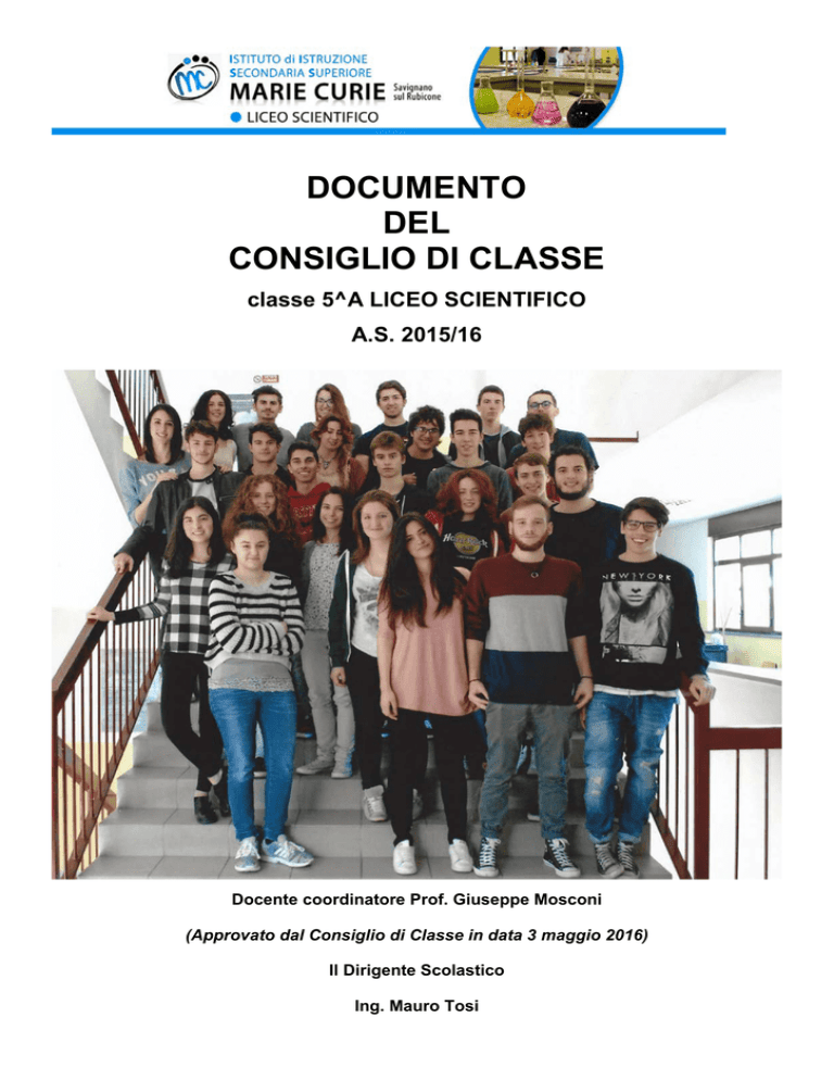 DOCUMENTO DEL CONSIGLIO DI CLASSE classe 5^A LICEO SCIENTIFICO A.S. 2015/16 Docente coordinatore Prof. Giuseppe Mosconi (Approvato dal Consiglio di Classe in data 3 maggio 2016) Il Dirigente Scolastico Ing. Mauro Tosi SOMMARIO Documento del Consiglio di Classe 5^A a.s. 2015/2016 PARTE PRIMA INFORMAZIONI GENERALI Presentazione dell’Istituto e del corso Pag. 2 Il Consiglio di Classe a.s. 2015/16 Pag. 5 Elenco degli allievi Pag. 5 Credito scolastico e formativo Pag. 6 PARTE SECONDA IL GRUPPO CLASSE Presentazione della classe 5^A Pag. 8 Attività integrative e di arricchimento dell’offerta formativa Pag. 9 Valutazioni, verifiche e simulazioni d’esame Pag. 10 Criteri di valutazione per l’a.s. 2015/16 PARTE TERZA PARTE QUARTA Pag. 12 RELAZIONI FINALI E PROGRAMMI Italiano Pag. 14 Latino Pag. 17 Inglese Pag. 20 Filosofia - Storia Pag. 25 Matematica Pag. 31 Fisica Pag. 38 Scienze naturali Pag. 45 Disegno e Storia dell’Arte Pag. 51 Scienze motorie e sportive Pag. 54 Religione Pag. 56 Firme dei docenti del Consiglio di Classe Pag. 58 Allegati Pag. 59 PARTE PRIMA INFORMAZIONI GENERALI L’Istituto di Istruzione Secondaria Superiore “Marie Curie” di Savignano sul Rubicone è nato nell’anno 1999 dall’accorpamento della sezione staccata del Liceo Scientifico di Cesenatico con la sezione staccata dell’Istituto Tecnico Industriale di Cesena; dal 2003 è presente un terzo indirizzo di studi, l’Istituto Professionale Moda e Abbigliamento, orientato al Calzaturiero. Attualmente all’Istituto “Marie Curie” sono presenti: • • • Liceo Scientifico e Liceo Scientifico con Opzione Scienze Applicate Istituto Tecnico Tecnologico, Meccanica, Meccatronica ed Energia Istituto Professionale Industria Artigianato, Calzaturiero Abbigliamento L’istituto “Marie Curie” si rivolge ad un’utenza proveniente da un bacino piuttosto ampio, comprendente l’Unione dei Comuni del Rubicone (Savignano, San Mauro Pascoli, Gatteo) e comuni limitrofi come Santarcangelo, Sogliano, Roncofreddo, Longiano, Borghi, Gambettola, oltre che Cesenatico, Cesena, Bellaria-Igea Marina, Villa Verucchio, S. Marino. Liceo Scientifico Il percorso del Liceo Scientifico è indirizzato allo studio del nesso tra cultura scientifica e tradizione umanistica. Favorisce l’acquisizione delle conoscenze e dei metodi propri della matematica, della fisica e delle scienze naturali. Guida lo studente ad approfondire e a sviluppare le conoscenze e le abilità e a maturare le competenze necessarie per seguire lo sviluppo della ricerca scientifica e tecnologica e per individuare le interazioni tra le diverse forme del sapere, assicurando la padronanza dei linguaggi, delle tecniche e delle metodologie relative, anche attraverso la pratica laboratoriale. Il Liceo Scientifico ha la durata di cinque anni ed è suddiviso in due bienni e in un quinto anno, al termine del quale gli studenti sostengono l’esame di Stato, utile al proseguimento degli studi in qualunque facoltà universitaria e l’accesso ai percorsi di istruzioni e formazione tecnica superiore nonché agli istituti di alta formazione artistica, musicale e coreutica. Il primo biennio è finalizzato anche all’assolvimento dell’obbligo di istruzione ai sensi del D.M. n.139/2007. A seguito della riforma del Marzo 2010 (D.P.R. n.89/2010), il Liceo Scientifico “Marie Curie” presenta al suo interno sia classi di indirizzo scientifico che classi con l’opzione Scienze Applicate, in un rapporto equilibrato fra tradizione e innovazione. Il Liceo Scientifico di ordinamento è indirizzato all’approfondimento della cultura scientifica (matematica, fisica, scienze naturali) in sintonia con lo studio delle materie letterarie e umanistiche, ivi compreso il latino. Lo studente è così in grado di seguire lo sviluppo della ricerca scientifica e tecnologica e di comprendere i rapporti tra la cultura scientifica e la complessa realtà contemporanea. L’opzione Scienze Applicate del Liceo Scientifico si rivolge a studenti che intendono acquisire competenze particolarmente avanzate negli studi afferenti alla cultura scientifica-tecnologica, con particolare riferimento alle scienze matematiche, fisiche, chimiche, biologiche e all'informatica. In questa opzione non è previsto lo studio del latino. In tutte le classi prime del Liceo Scientifico “Marie Curie” è prevista un’ora aggiuntiva di potenziamento della lingua inglese mediante lezioni svolte da un docente di madrelingua nell’ambito del quadro orario mattutino. Durante il secondo anno di corso, invece, le ore di potenziamento linguistico saranno facoltative, cioè scelte liberamente dalle famiglie degli allievi frequentanti, raggruppate in alcuni periodi dell’anno scolastico (indicativamente ottobre-novembre e febbraio-aprile) e collocate nella fascia oraria 12.00–13.30. Tali ore saranno finalizzate al conseguimento della certificazione internazionale Preliminary English Test (PET) della Cambridge University, con la possibilità successivamente di conseguire la certificazione di livello superiore FCE. L’aggiunta delle ore di potenziamento linguistico con docente di madrelingua inglese, obbligatorie nelle classi prime e facoltative nelle seconde, utilizzando risorse della scuola, e, quindi, senza costi ulteriori per l’utenza, è permessa dalla normativa vigente, che prevede spazi di autonomia nell’ambito del curricolo liceale (20% del monte ore complessivo previsto nel primo biennio).Il Liceo Scientifico “Marie Curie” offre inoltre la possibilità di frequentare, in orario pomeridiano, i corsi ECDL per il conseguimento della Patente Europea del Computer. L’indirizzo di studio seguito dalla classe 5 ^A è quello di ordinamento, il cui piano di studi è quello di seguito riportato, secondo il D.P.R. N. 89/2010. 1° BIENNIO 2° BIENNIO 1° anno 2° anno 3° anno 4° anno 5° anno Lingua e letteratura italiana 4 4 4 4 4 Lingua e cultura latina 3 3 3 3 3 3+1 3+1 3 3 3 3 3 Storia 2 2 2 Filosofia 3 3 3 Ling