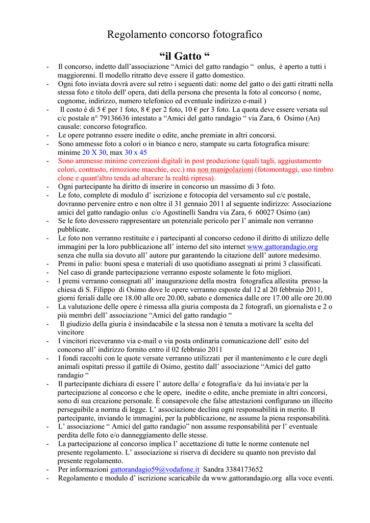 Regolamento concorso fotografico “il Gatto “ - - - - - - - - - - Il concorso, indetto dall’associazione “Amici del gatto randagio “ onlus, è aperto a tutti i maggiorenni. Il modello ritratto deve essere il gatto domestico. Ogni foto inviata dovrà avere sul retro i seguenti dati: nome del gatto o dei gatti ritratti nella stessa foto e titolo dell' opera, dati della persona che presenta la foto al concorso ( nome, cognome, indirizzo, numero telefonico ed eventuale indirizzo e-mail ) Il costo è di 5 € per 1 foto, 8 € per 2 foto, 10 € per 3 foto. La quota deve essere versata sul c/c postale n° 79136636 intestato a “Amici del gatto randagio “ via Zara, 6 Osimo (An) causale: concorso fotografico. Le opere potranno essere inedite o edite, anche premiate in altri concorsi. Sono ammesse foto a colori o in bianco e nero, stampate su carta fotografica misure: minime 20 X 30, max 30 x 45 Sono ammesse minime correzioni digitali in post produzione (quali tagli, aggiustamento colori, contrasto, rimozione macchie, ecc.) ma non manipolazioni (fotomontaggi, uso timbro clone e quant'altro tenda ad alterare la realtà ripresa). Ogni partecipante ha diritto di inserire in concorso un massimo di 3 foto. Le foto, complete di modulo d’ iscrizione e fotocopia del versamento sul c/c postale, dovranno pervenire entro e non oltre il 31 gennaio 2011 al seguente indirizzo: Associazione amici del gatto randagio onlus c/o Agostinelli Sandra via Zara, 6 60027 Osimo (an) Se le foto dovessero rappresentare un potenziale pericolo per l’ animale non verranno pubblicate. Le foto non verranno restituite e i partecipanti al concorso cedono il diritto di utilizzo delle immagini per la loro pubblicazione all’ interno del sito internet www.gattorandagio.org senza che nulla sia dovuto all’ autore pur garantendo la citazione dell’ autore medesimo. Premi in palio: buoni spesa e materiali di uso quotidiano assegnati ai primi 3 classificati. Nel caso di grande partecipazione verranno esposte solamente le foto migliori. I premi verranno consegnati all’ inaugurazione della mostra fotografica allestita presso la chiesa di S. Filippo di Osimo dove le opere verranno esposte dal 12 al 20 febbraio 2011, giorni feriali dalle ore 18.00 alle ore 20.00, sabato e domenica dalle ore 17.00 alle ore 20.00 La valutazione delle opere è rimessa alla giuria composta da 2 fotografi, un giornalista e 2 o più membri dell’ associazione “Amici del gatto randagio “ Il giudizio della giuria è insindacabile e la stessa non è tenuta a motivare la scelta del vincitore I vincitori riceveranno via e-mail o via posta ordinaria comunicazione dell’ esito del concorso all’ indirizzo fornito entro il 02 febbraio 2011 I fondi raccolti con le quote versate verranno utilizzati per il mantenimento e le cure degli animali ospitati presso il gattile di Osimo, gestito dall’ associazione “Amici del gatto randagio “ Il partecipante dichiara di essere l’ autore della/ e fotografia/e da lui inviata/e per la partecipazione al concorso e che le opere, inedite o edite, anche premiate in altri concorsi, sono di sua creazione personale. È consapevole che false attestazioni configurano un illecito perseguibile a norma di legge. L’ associazione declina ogni responsabilità in merito. Il partecipante, inviando le immagini, per la pubblicazione, ne assume la piena responsabilità. L’ associazione “ Amici del gatto randagio” non assume responsabilità per l’ eventuale perdita delle foto e/o danneggiamento delle stesse. La partecipazione al concorso implica l’ accettazione di tutte le norme contenute nel presente regolamento. L’ associazione si riserva di decidere su quanto non previsto dal presente regolamento. Per informazioni [email protected] Sandra 3384173652 Regolamento e modulo d’ iscrizione scaricabile da www.gattorandagio.org alla voce eventi.