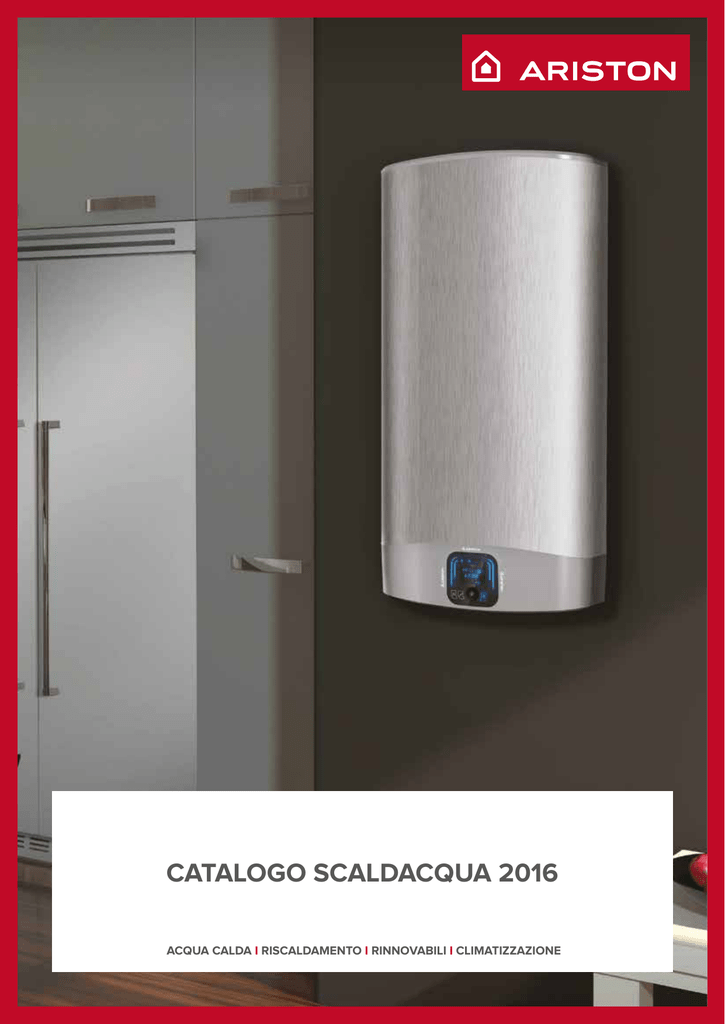CATALOGO SCALDACQUA 2016 ACQUA CALDA I RISCALDAMENTO I RINNOVABILI I CLIMATIZZAZIONE 80 ANNI DI CRESCITA GUIDATA DALL’ INNOVAZIONE Da molti anni entriamo nelle case delle famiglie che scelgono Ariston per migliorare e semplificare la vita di ogni giorno. / OGGI Ariston è leader globale nel settore del comfort termico, presente in più di 150 paesi. / 1960-1980 Nasce il marchio Ariston e inizia la produzione di scaldacqua elettrici. Negli anni Ottanta, Ariston è leader nel settore degli scaldacqua elettrici e inizia la produzione di caldaie. / 1930 Aristide Merloni fonda l’azienda “Industrie Merloni” nelle Marche in Italia e inizia la produzione di bilance. 2/ COMFORT ALWAYS ON Ci impegniamo a migliorare continuamente, con dedizione, passione e cura nei dettagli. Crediamo che le nostre tecnologie, le prestazioni energetiche e il design dei nostri prodotti abbiano un valore speciale perché possono realmente migliorare la qualità della vita dei nostri consumatori. Questa è la nostra fonte di ispirazione che ci guida verso un futuro fatto di un comfort sempre più sostenibile e intelligente, con tutta la piacevolezza del nostro tocco italiano. In un momento di evoluzione e cambiamento tecnologico, siamo pronti ad offrirti le migliori soluzione per il tuo comfort quotidiano, perché il nostro è un comfort always on. /3 SEI PRONTO AL CAMBIAMENTO? / VELIS EVO PLUS / SHAPE ECO EVO / ANDRIS LUX ECO I sistemi domestici di riscaldamento e produzione di acqua calda rappresentano circa il 30% del consumo di energia in Europa. Attraverso la progettazione di prodotti eco-compatibili (come da nuova regolamentazione ErP) e promuovendo presso l’utente finale le tecnologie ad efficienza più elevata (visualizzabile tramite la nuova etichetta energetica), si avrebbe nel 2020: / un risparmio energetico annuo totale pari a 56 Milioni di tonnellate di petrolio (equivalente allo spegnimento degli impianti di riscaldamento e acqua calda di due nazioni grandi come l’Italia) / una riduzione di CO2 immessa nell’ambiente pari a 136 milioni di tonnellate (circa quanto assorbirebbe una foresta grande quanto tutto il Centro-Nord Italia) Dal 26 settembre 2015 i regolamenti impongono il rispetto dei requisiti minimi di efficienza e di etichettatura energetica per caldaie, pompe di calore, micro-cogenerazione, scaldacqua e serbatoi d’acqua calda. I regolamenti si applicano solo ai prodotti immessi sul mercato a partire dal 26/09/2015; quelli acquistati in precedenza e già presenti nei punti vendita o nei magazzini dei distributori possono continuare ad essere venduti ed installati, anche se non conformi ai nuovi requisiti. 26.09.2015 A++ (riscaldamento) / A (funzione sanitaria) A B C D E F G Etichettatura obbligatoria per i prodotti per il riscaldamento e la produzione di acqua calda (classe energetica) Requisiti minimi di performance per il riscaldamento e la produzione di acqua calda 4/ 2017 2019 A+ A+++ introdotta nella produzione di acqua calda introdotta nel riscaldamento nuovi limiti su EFFICIENZA ed EMISSIONI ETICHETTA ENERGETICA DI PRODOTTO Esistono differenti etichette, a seconda della tipologia di prodotto e del servizio garantito. Le classi di efficienza A, A+ e A++ indicano i prodotti dalle performance più elevate. Vi sono due classificazioni distinte per il servizio di riscaldamento e quello di produzione di acqua calda; per quei prodotti in grado di fornire entrambi i servizi, le etichette devono mostrare entrambe le classificazioni. Oltre alla classe energetica, le etichette riportano altre informazioni che si ritiene possano essere utili all’utente finale per la scelta del prodotto più efficiente e dal minore impatto ambientale (potenza e consumi in varie zone climatiche, rumorosità etc...). Marchio Descrizione e codice Profilo di prelievo dell’acqua sanitaria Classe energetica Livello di potenza sonora Consumo annuo QUALI SONO LE RESPONSABILITÀ DEI RIVENDITORI I rivenditori di apparecchi e/o sistemi sono coloro che vendono, noleggiano, offrono in locazione-vendita o espongono i prodotti agli utilizzatori finali; rientrano in questa famiglia anche figure come idraulici, installatori e progettisti, i quali sono tenuti a garantire che: / Gli apparecchi o sistemi esposti riportino le rispettive etichette, ponendole in modo che risultino chiaramente visibili; / Apparecchio e sistema vengano sempre commercializzati corredati dalle schede di prodotto/sistema previste dal regolamento; / Qualsiasi pubblicità o materiale promozionale tecnico di un prodotto o sistema, contenente informazioni relative all’energia o indicazioni di prezzo, riporti l’indicazione della classe di efficienza energetica. QUALI SONO LE RESPONSABILITÀ DEI FORNITORI Il fornitore è la figura responsabile della vendita sul mercato, per tanto egli deve fornire prodotti muniti di: / Un’etichetta energetica di prodotto (se vende il singolo prodotto); / Una scheda di prodotto; / Un’etichetta energetica di sistema aggiuntiva all’etichetta di prodotto nel caso in cui venda un sistema contenente il prodotto in oggetto o se prevede che il suo singolo prodotto venduto possa essere in seguito combinato a uno dei dispositivi aggiuntivi previsti; / Una scheda di sistema con le parti inerenti il prodotto o il sistema venduto già compilate. /5 ARISTON È CON TE, ANCHE ONLINE Nel sito ariston.com puoi trovare tutte le informazioni del mondo Ariston. Sono presenti diverse aree sia per il professionista che per il consumatore, dove è possibile scoprire: / i nostri prodotti e la guida alla scelta; / la normativa ErP e l’etichettatura energetica; / come configurare e stampare la tua etichetta di sistema; / come entrare in contatto con il nostro servizio assistenza; / quali sono i ruoli e le responsabilità in merito alla normativa ErP; / come accedere alle detrazioni fiscali e al conto termico. Affidati alle competenze e all’esperienza di Ariston in un contesto legislativo in continua evoluzione per migliorare il t