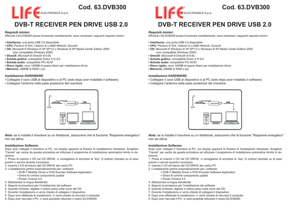 ELECTRONICS S.p.A. Cod. 63.DVB300 DVB-T RECEIVER PEN DRIVE USB 2.0 ELECTRONICS S.p.A. Cod. 63.DVB300 DVB-T RECEIVER PEN DRIVE USB 2.0 Requisiti minimi: Requisiti minimi: ▪ Interfaccia: una porta USB 2.0 disponibile ▪ CPU: Pentium ® III/4, Celeron © o AMD Athlon©, Duron© ▪ OS: Microsoft ® Windows ® XP SP1/2 o Windows ® XP Media Center Edition 2005 (non compatibile Windows 2000) ▪ DirectX: Microsoft ® DirectX ® 9.0b ▪ Scheda grafica: compatibile Direct X ® 9.0 ▪ Scheda audio: compatibile PCI AC97 ▪ Disco rigido: circa 140MB di spazio libero per installazione driver. ▪ Memoria: 256MB di RAM o più ▪ Interfaccia: una porta USB 2.0 disponibile ▪ CPU: Pentium ® III/4, Celeron © o AMD Athlon©, Duron© ▪ OS: Microsoft ® Windows ® XP SP1/2 o Windows ® XP Media Center Edition 2005 (non compatibile Windows 2000) ▪ DirectX: Microsoft ® DirectX ® 9.0b ▪ Scheda grafica: compatibile Direct X ® 9.0 ▪ Scheda audio: compatibile PCI AC97 ▪ Disco rigido: circa 140MB di spazio libero per installazione driver. ▪ Memoria: 256MB di RAM o più Installazione HARDWARE: ▪ Collegare il cavo USB al dispositivo e al PC (solo dopo aver installato il software) ▪ Collegare l’antenna nella parte posteriore del ricevitore. Installazione HARDWARE: ▪ Collegare il cavo USB al dispositivo e al PC (solo dopo aver installato il software) ▪ Collegare l’antenna nella parte posteriore del ricevitore. Nota: se si installa il ricevitore su un Notebook, assicurarsi che la funzione “Risparmio energetico” non sia attiva. Nota: se si installa il ricevitore su un Notebook, assicurarsi che la funzione “Risparmio energetico” non sia attiva. Installazione Software: Installazione Software: Affinchè il 63.DVB300 possa funzionare correttamente, sono necessari i seguenti requisiti minimi: Dopo aver collegati il ricevitore al PC, sul display apparirà la finestra di Installazione Hardware. Scegliere “Cancel” per uscire da questa procedura ed utilizzare il programma di installazione automatica fornito in dotazione. 1. Prima di inserire il CD nel CD DRIVE, vi consigliamo di annotare la “key” (il codice) riportato su di esso poiché vi servirà durante il processo 2. Inserire il CD all’interno del CD DRIVE del vostro PC 3. L’installazione partirà automaticamente per i software: ▪ DVB-T Mobility Driver e DVD Encoder Software Application ▪ Direct ® runtime components update ▪ Power Cinema 4.0 4. Selezionare la lingua desiderata 5. Seguire la procedura per l’installazione dei software 6. Quando richiesto, digitare il codice preso sulla cover del CD. 7. Durante l’installazione vi verrà chiesto di collegare il dispositivo. 8. Dopo aver effettuato le installazioni, vi verrà chiesto di riavviare il computer 9. Dopo aver riavviato il PC, vi sarà possibile utilizzare il vostro 63.DVB300 Affinchè il 63.DVB300 possa funzionare correttamente, sono necessari i seguenti requisiti minimi: Dopo aver collegati il ricevitore al PC, sul display apparirà la finestra di Installazione Hardware. Scegliere “Cancel” per uscire da questa procedura ed utilizzare il programma di installazione automatica fornito in dotazione. 1. Prima di inserire il CD nel CD DRIVE, vi consigliamo di annotare la “key” (il codice) riportato su di esso poiché vi servirà durante il processo 2. Inserire il CD all’interno del CD DRIVE del vostro PC 3. L’installazione partirà automaticamente per i software: ▪ DVB-T Mobility Driver e DVD Encoder Software Application ▪ Direct ® runtime components update ▪ Power Cinema 4.0 4. Selezionare la lingua desiderata 5. Seguire la procedura per l’installazione dei software 6. Quando richiesto, digitare il codice preso sulla cover del CD. 7. Durante l’installazione vi verrà chiesto di collegare il dispositivo. 8. Dopo aver effettuato le installazioni, vi verrà chiesto di riavviare il computer 9. Dopo aver riavviato il PC, vi sarà possibile utilizzare il vostro 63.DVB300 ELECTRONICS S.p.A. ELECTRONICS S.p.A. GARANZIA GARANZIA 1. La garanzia entra in vigore alla data del documento fiscale. NOTA BENE: SI HA DIRITTO ALLA GARANZIA SOLO SE SI ESIBISCE IL PRESENTE CERTIFICATO DI GARANZIA INSIEME ALLA FOTOCOPIA DELLO SCONTRINO FISCALE (O FATTURA) ENTRO I TERMINI STABILITI DALLA LEGGE. 2. In caso di guasto dell’apparecchio, l’acquirente dovrà recarsi presso il proprio rivenditore LIFE. 3. L’unico documento valido per ottenere la garanzia è lo scontrino fiscale (oppure la fattura). 4. Non sono coperte da garanzia le parti esterne dell’apparecchio né i danni provocati al prodotto da imperfetta installazione, cattivo uso da parte dell’utente ed interventi/patch e modifiche operate sull’apparecchio. Sono esclusi da garanzia i danni provocati da agenti atmosferici, sbalzi di tensione, incendi, nonché guasti provocati durante il trasporto. Se il numero di matricola dell’apparecchio viene rimosso, cambiato oppure reso irriconoscibile, la garanzia decade automaticamente. É escluso il riconoscimento di danni diretti e indiretti di qualsiasi natura a persone e cose per l’uso improprio o per la sospensione d’uso dell’apparecchio. 5. Per richieste di garanzia senza un ben motivato difetto, così come per l’installazione ed illustrazione delle norme d’uso dell’apparecchio, verranno addebitate al cliente tutte le spese sostenute. 1. La garanzia entra in vigore alla data del documento fiscale. NOTA BENE: SI HA DIRITTO ALLA GARANZIA SOLO SE SI ESIBISCE IL PRESENTE CERTIFICATO DI GARANZIA INSIEME ALLA FOTOCOPIA DELLO SCONTRINO FISCALE (O FATTURA) ENTRO I TERMINI STABILITI DALLA LEGGE. 2. In caso di guasto dell’apparecchio, l’acquirente dovrà recarsi presso il proprio rivenditore LIFE. 3. L’unico documento valido per ottenere la garanzia è lo scontrino fiscale (oppure la fattura). 4. Non sono coperte da garanzia le parti esterne dell’apparecchio né i danni provocati al prodotto da imperfetta installazione, cattivo uso da