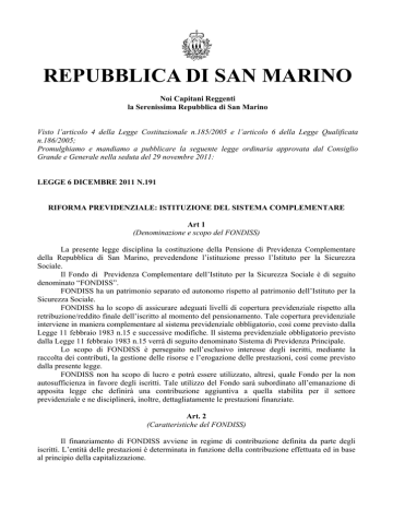 REPUBBLICA DI SAN MARINO Noi Capitani Reggenti la Serenissima Repubblica di San Marino Visto l’articolo 4 della Legge Costituzionale n.185/2005 e l’articolo 6 della Legge Qualificata n.186/2005; Promulghiamo e mandiamo a pubblicare la seguente legge ordinaria approvata dal Consiglio Grande e Generale nella seduta del 29 novembre 2011: LEGGE 6 DICEMBRE 2011 N.191 RIFORMA PREVIDENZIALE: ISTITUZIONE DEL SISTEMA COMPLEMENTARE Art 1 (Denominazione e scopo del FONDISS) La presente legge disciplina la costituzione della Pensione di Previdenza Complementare della Repubblica di San Marino, prevedendone l’istituzione presso l’Istituto per la Sicurezza Sociale. Il Fondo di Previdenza Complementare dell’Istituto per la Sicurezza Sociale è di seguito denominato “FONDISS”. FONDISS ha un patrimonio separato ed autonomo rispetto al patrimonio dell’Istituto per la Sicurezza Sociale. FONDISS ha lo scopo di assicurare adeguati livelli di copertura previdenziale rispetto alla retribuzione/reddito finale dell’iscritto al momento del pensionamento. Tale copertura previdenziale interviene in maniera complementare al sistema previdenziale obbligatorio, così come previsto dalla Legge 11 febbraio 1983 n.15 e successive modifiche. Il sistema previdenziale obbligatorio previsto dalla Legge 11 febbraio 1983 n.15 verrà di seguito denominato Sistema di Previdenza Principale. Lo scopo di FONDISS è perseguito nell’esclusivo interesse degli iscritti, mediante la raccolta dei contributi, la gestione delle risorse e l’erogazione delle prestazioni, così come previsto dalla presente legge. FONDISS non ha scopo di lucro e potrà essere utilizzato, altresì, quale Fondo per la non autosufficienza in favore degli iscritti. Tale utilizzo del Fondo sarà subordinato all’emanazione di apposita legge che definirà una contribuzione aggiuntiva a quella stabilita per il settore previdenziale e ne disciplinerà, inoltre, dettagliatamente le prestazioni finanziate. Art. 2 (Caratteristiche del FONDISS) Il finanziamento di FONDISS avviene in regime di contribuzione definita da parte degli iscritti. L’entità delle prestazioni è determinata in funzione della contribuzione effettuata ed in base al principio della capitalizzazione. Art. 3 (Destinatari e modalità di adesione) La Forma di Previdenza Complementare è istituita obbligatoriamente per tutti coloro che sono iscritti al Sistema di Previdenza Principale, ad esclusione delle Assistenti a persone permanentemente inferme, per le quali è prevista la possibilità di aderire volontariamente. E’ prevista, altresì, l’adesione volontaria per coloro che non siano iscritti al Sistema di Previdenza Principale. Tali adesioni volontarie saranno disciplinate secondo quanto stabilito dal regolamento emanato dal Comitato Amministratore di FONDISS. In deroga a quanto previsto al primo comma del presente articolo, per coloro che, alla data di entrata in vigore della presente legge, abbiano già raggiunto un’età anagrafica di 50 anni, l’adesione non è obbligatoria. Il lavoratore di cui al comma precedente, potrà aderire volontariamente a FONDISS presentando espressa dichiarazione al Comitato Amministratore. Nel caso di adesione volontaria la quota di versamenti contributivi sarà proposta dallo stesso aderente in fase di presentazione della domanda di adesione. La proposta potrà essere approvata, con apposita deliberazione del Comitato Amministratore, secondo le disposizioni contenute nel Regolamento di FONDISS. L’iscritto viene informato dell’avvenuta iscrizione a FONDISS attraverso una nota iniziale inviata dal Comitato Amministratore. Nella nota è fornita la descrizione della politica di investimento posta in essere, le tecniche di gestione del rischio e le metodologie di misurazione impiegate, nonché la ripartizione strategica delle attività. Art. 4 (Organi di FONDISS) Sono organi di FONDISS: - Il Comitato Amministratore; - Il Presidente; - Collegio dei Sindaci Revisori. Art. 5 (Il Comitato Amministratore) FONDISS è gestito da un Comitato Amministratore composto da nove membri nominati secondo le seguenti modalità: 1. due componenti nominati dai Gruppi e dalle Rappresentanze Consiliari di maggioranza che esprimono il proprio voto; 2. un componente indicato dai Gruppi e dalle Rappresentanze Consiliari di minoranza che esprime il proprio voto; 3. tre componenti indicati dalle Associazioni Sindacali dei Lavoratori, che esprimono complessivamente un solo voto; 4. tre componenti indicati dalle Associazioni Datoriali e dei Lavoratori Autonomi che esprimono complessivamente un solo voto. La revoca di uno o più membri del Comitato Amministratore, prima della scadenza del mandato di cui al successivo comma, spetta al Consiglio Grande e Generale, eventualmente su richiesta - per i membri di cui ai punti elencati al precedente comma - delle Organizzazioni indicanti. Apposito decreto delegato, da emanarsi entro tre mesi dall’entrata in vigore della presente legge, disciplinerà le cause di revoca dei membri del Comitato Amministratore. I componenti del Comitato Amministratore devono essere in possesso dei requisiti di onorabilità e professionalità così come previsto dal successivo articolo 7. I componenti del Comitato Amministratore durano in carica tre anni e possono essere rieletti 2 per un solo mandato. Il Comitato Amministratore delibera a maggioranza assoluta dei presenti e a parità di voti prevale il voto del Presidente. Il Comitato svolge le seguenti funzioni: 1. annualmente alla chiusura dell’esercizio contabile predispone ed invia, al Consiglio Grande e Generale e al Comitato Esecutivo dell’Istituto per la Sicurezza Sociale, un resoconto particolareggiato sull’andamento della gestione; 2. per la trattazione di particolari argomenti può attribuire deleghe ai propri membri; 3. propone al Congresso di Stato i provvedimenti ritenuti necessari per la salvaguardia delle condizioni di equilibrio di FONDISS nel caso rilevi situazioni potenz