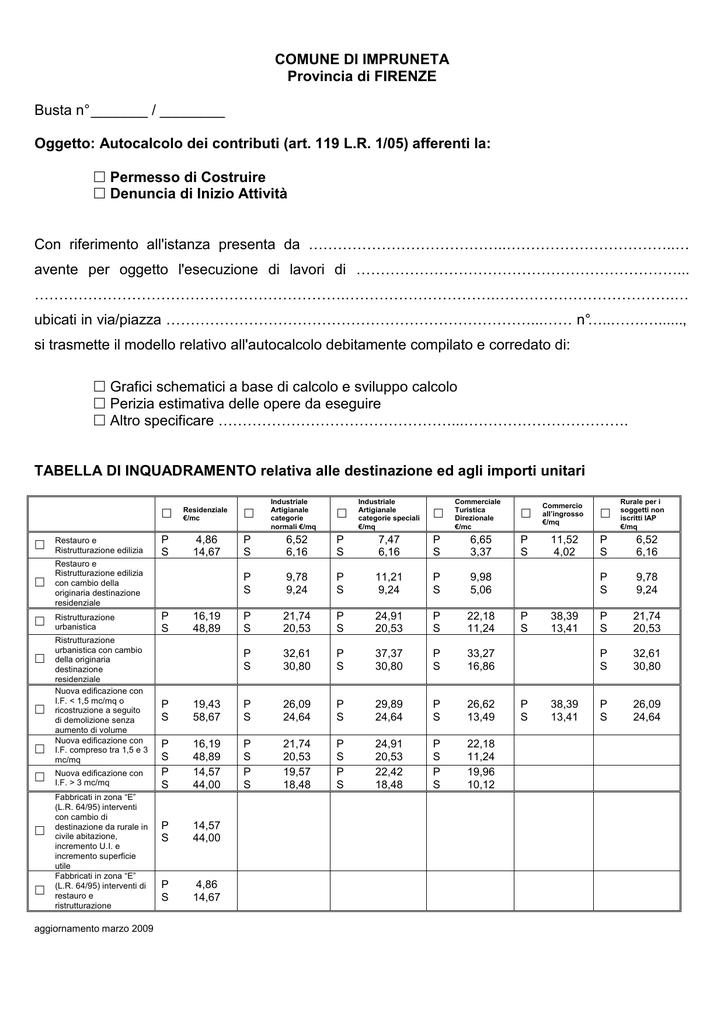 COMUNE DI IMPRUNETA Provincia di FIRENZE Busta n° _______ / ________ Oggetto: Autocalcolo dei contributi (art. 119 L.R. 1/05) afferenti la: Permesso di Costruire Denuncia di Inizio Attività Con riferimento all'istanza presenta da …………………………………..……………………………..… avente per oggetto l'esecuzione di lavori di …………………………………………………………... ……………………………………………………….………………………….……………………………….… ubicati in via/piazza …………………………………………………………………...…… n°…..…….…......, si trasmette il modello relativo all'autocalcolo debitamente compilato e corredato di: Grafici schematici a base di calcolo e sviluppo calcolo Perizia estimativa delle opere da eseguire Altro specificare …………………………………………...……………………………. TABELLA DI INQUADRAMENTO relativa alle destinazione ed agli importi unitari Restauro e Ristrutturazione edilizia Restauro e Ristrutturazione edilizia con cambio della originaria destinazione residenziale Ristrutturazione urbanistica Ristrutturazione urbanistica con cambio della originaria destinazione residenziale Nuova edificazione con I.F. < 1,5 mc/mq o ricostruzione a seguito di demolizione senza aumento di volume Nuova edificazione con I.F. compreso tra 1,5 e 3 mc/mq Nuova edificazione con I.F. > 3 mc/mq Fabbricati in zona “E” (L.R. 64/95) interventi con cambio di destinazione da rurale in civile abitazione, incremento U.I. e incremento superficie utile Fabbricati in zona “E” (L.R. 64/95) interventi di restauro e ristrutturazione aggiornamento marzo 2009 Industriale Artigianale categorie speciali €/mq 6,52 6,16 P S 7,47 6,16 P S 6,65 3,37 P S 9,78 9,24 P S 11,21 9,24 P S 9,98 5,06 P S 21,74 20,53 P S 24,91 20,53 P S 22,18 11,24 P S 32,61 30,80 P S 37,37 30,80 P S 33,27 16,86 Residenziale €/mc P S 4,86 14,67 P S P S 16,19 48,89 Industriale Artigianale categorie normali €/mq Commerciale Turistica Direzionale €/mc P S 19,43 58,67 P S 26,09 24,64 P S 29,89 24,64 P S 26,62 13,49 P S P S 16,19 48,89 14,57 44,00 P S P S 21,74 20,53 19,57 18,48 P S P S 24,91 20,53 22,42 18,48 P S P S 22,18 11,24 19,96 10,12 P S 14,57 44,00 P S 4,86 14,67 Rurale per i soggetti non iscritti IAP €/mq Commercio all’ingrosso €/mq P S 11,52 4,02 P S 6,52 6,16 P S 9,78 9,24 P S 21,74 20,53 P S 32,61 30,80 P S 26,09 24,64 P S P S 38,39 13,41 38,39 13,41 D.M. 10.05.1977 TABELLA 1 - Incremento per Superficie utile abitabile (5 § ) Classi di superficie (mq) (1) ≤ 95 > 95 < 110 > 110 < 130 > 130 < 160 > 160 Superficie utile abitabile (mq) (3) Alloggi (n°) (2) Rapporto rispetto al totale Su (4) = (3) : Su percentuale Incremento 5§ (5) 0 5 15 30 50 percentuale Incremento per classi di superficie (6) = (4) x (5) Su SOMMA I/1 TABELLA 2 - Superfici per servizi e accessori relativi TABELLA 3 - Incremento per servizi ed accessori alla parte residenziale (2 §). relativi alla parte residenziale (6 §) Destinazioni Superficie netta di servizi ed accessori mq (7) (8) Intervalli di variabilità' del rapporto % Snr x 100 Su (9) Ipotesi che ricorre % Incrementata (10) (11) 0 a Cantine, soffitte, locali motore ascensore, cabine idriche, lavatoi comuni, centrali termiche, ed altri locali a stretto servizio delle residenze ≤ 50 b Autorimesse singole collettive > 50 ≤ 75 10 c Androni d'ingresso e porticati liberi > 75 ≤ 100 20 d Logge e balconi > 100 30 Snr x 100 = Su ………….. Snr I/2 TABELLA 4 - Incremento per particolari caratteristiche (7 §) SUPERFICI RESIDENZIALI E RELATIVI SERVIZI ED ACCESSORI Sigla Denominazione Superficie mq (17) (18) (19) Superficie utile abitabile Superficie netta 2 Snr (2 §) non residenziale Superficie 3 60 % Snr ragguagliata Superficie 4 =1+3 Sc (2 §) complessiva SUPERFICI PER ATTIVITÀ' TURISTICHE COMMERCIALI E DIREZIONALI E ACCESSORI 1 Su (3 §) Sigla Denominazione Superficie mq (20) (21) (22) 1 Sn (9 §) 2 Sa (9 §) 3 60 % Sa 4 =1+3 St (9 §) Numero di caratteristiche (12) Ipotesi che ricorre (13) % Incrementata (14) 0 0 1 10 2 20 3 30 4 40 5 50 I/3 Superficie netta non residenziale Superficie accessori Superficie ragguagliata Superficie totale non residenziale Totale incrementi I = I/1+I/2+I/3 I (15) Classe edificio (8 §) (16) % Maggiorazione (8 §) M SUPERFICI INTERESSATE ALLA DETERMINAZIONE DEL CONTRIBUTO Nuova costruzione Su Snr Sc Sn Sa St Interventi sull'esistente Riepilogo mq. ................................... mq. ................................... (1) mq. ......................................... mq. ............................. x 0,60 = mq....................... mq. ............................. x 0,60 = mq....................... (2) mq. ........................................ (1) mq. ................................... (2) mq. ................................... (3) mq. ........................................ mq. ................................... mq. ................................... mq. ............................. x 0,60 = mq....................... mq. ............................. x 0,60 = mq....................... (3) mq. ................................... (4) mq. ................................... (4) mq. ........................................ Tot mq. ...................................... CONTRIBUTO SUL COSTO DI COSTRUZIONE: Il contributo è dovuto per gli interventi di Nuova Costruzione, Ampliamento, Sopraelevazione Demolizione e Ricostruzione, Ristrutturazione Urbanistica, Ristrutturazione Edilizia e Restauro - Insediamenti Residenziali (A) - Costo massimo a mq. dell'edilizia agevolata = 223,00 €/mq. (B) - Costo di costruzione a mq. maggiorato A x (1+ M / 100) = ............................................................. €./mq. (C) - Costo di costruzione dell'edificio Sc x B = ............................................................. €. 1 Costo di costr