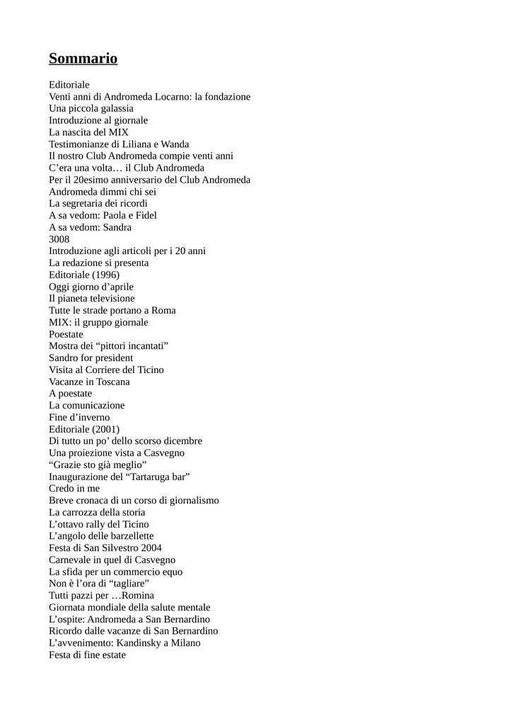 Sommario Editoriale Venti anni di Andromeda Locarno: la fondazione Una piccola galassia Introduzione al giornale La nascita del MIX Testimonianze di Liliana e Wanda Il nostro Club Andromeda compie venti anni C’era una volta… il Club Andromeda Per il 20esimo anniversario del Club Andromeda Andromeda dimmi chi sei La segretaria dei ricordi A sa vedom: Paola e Fidel A sa vedom: Sandra 3008 Introduzione agli articoli per i 20 anni La redazione si presenta Editoriale (1996) Oggi giorno d’aprile Il pianeta televisione Tutte le strade portano a Roma MIX: il gruppo giornale Poestate Mostra dei “pittori incantati” Sandro for president Visita al Corriere del Ticino Vacanze in Toscana A poestate La comunicazione Fine d’inverno Editoriale (2001) Di tutto un po’ dello scorso dicembre Una proiezione vista a Casvegno “Grazie sto già meglio” Inaugurazione del “Tartaruga bar” Credo in me Breve cronaca di un corso di giornalismo La carrozza della storia L’ottavo rally del Ticino L’angolo delle barzellette Festa di San Silvestro 2004 Carnevale in quel di Casvegno La sfida per un commercio equo Non è l’ora di “tagliare” Tutti pazzi per …Romina Giornata mondiale della salute mentale L’ospite: Andromeda a San Bernardino Ricordo dalle vacanze di San Bernardino L’avvenimento: Kandinsky a Milano Festa di fine estate A questo numero hanno collaborato: Romina, Enrico, Danilla, Ernesto, Jane, Orlando, Vincenza, Gloria, Vittorio, Delia, Nicla, Sandra, Rosita, Marco E. Adriano, Paola, Moreno, Marcel, Matteo, Regina, Cristina, Renata, Anita, Patrizia, Franco, Roberto, Tiziano, Ursula, Chiara, Marzia, Martino, Jimmy, David, Fabrizio, Raffaela, Markus, Alfredo, Marie, Irma, Virginia, Antonio, Fatima, Charles, Armida, Enrico O e Markus. Editoriale Tanti auguri Club Andromeda! Ebbene si, questo Club fondato nel lontano 1988 quest’anno raggiunge il traguardo dei suoi 20 anni. Questo MIX è quindi un’edizione speciale che si propone di ripercorrere tutti questi anni. Dei volontari si sono quindi offerti di rileggere tutte le edizioni passate del giornale e selezionare gli articoli più significativi, importanti e con una certa valenza storica che mostrano l’evoluzione di questo Club e del giornale. Naturalmente ci saranno anche dei nuovi e stimolanti articoli. Questo importante traguardo sarà celebrato con una grande festa il prossimo 17 maggio. Lo scopo di quest’iniziativa, quasi totalmente autofinanziata, è principalmente quello di sensibilizzare la popolazione sul problema del disagio psichico e sociale. Secondariamente, ma non meno importante, la volontà di far conoscere la realtà di questo Club che si definisce all’interno del Centro Diurno con un proprio comitato. Dire che è come una famiglia è dire poco. Qui la gente impara a conoscersi, stringe delle amicizie, si ama, si scontra con la propria realtà, ci sono i deboli, le persone che soffrono ma che trovano il modo di sorridere e portare un pizzico d’allegria e offrire tutto ciò che hanno in modo disinteressato, spontaneo e generoso. Insomma si vive intensamente e si sperimenta la sofferenza e la speranza sulla propria pelle. Vorremmo soprattutto sottolineare che la nostra quotidianità non è tanto differente dalla quotidianità della comunità della quale facciamo parte. Infatti molti di noi hanno una famiglia, dei figli, dei nipoti, un passato lavorativo e sociale come tanti. Ognuno ha delle passioni, degli interessi, degli hobby che ci contraddistinguono ma che al contempo ci accomunano. L’unica cosa che ci distingue e ci condanna a dover subire dei pregiudizi a volte molto pesanti e dolorosi, è l’aver dovuto affrontare un passato sofferente e pieno di ostacoli tanto grandi che da soli non ce l’avremmo fatta a risolverli. Fortunatamente l’esistenza del Club Andromeda ci permette di andare avanti e affrontare la quotidianità con maggior sicurezza, fiducia e sorriso, facendoci sentire parte integrante di un gruppo, di un tassello che compone il mosaico della società, che ci fa sentire vivi e accettati per ciò che siamo. Fiduciosi del successo e del riscontro positivo che questa festa otterrà confidiamo in un futuro che potrà essere migliore solo se costruito collettivamente giorno dopo giorno con un unico obiettivo comune: la comprensione e l’accettazione reciproca. Un ringraziamento speciale a tutte le persone che hanno contribuito all’esistenza del Club ma che purtroppo ci hanno lasciato, e a tutte quelle che ne scriveranno la storia presente e futura. Ornella, Matteo e Giada Venti anni di Andromeda Locarno: la fondazione Oggi con Pierangelo, abbiamo letto l’articolo apparso sul Corriere del Ticino del 16 agosto 1988. In seguito abbiamo guardato le fotografie di quell’epoca. Ci siamo un po’ persi nei ricordi dei soci che con noi hanno iniziato a fondare Il Club Andromeda del Locarnese. In quell’epoca eravamo a livello regionale l’unico Centro mancante. Lugano, Mendrisio, Bellinzona erano stati fondati da alcuni anni o da alcuni mesi. La nostra domanda era cosa fare e come trovare i fondi utili alla creazione del nostro Club. Per prima cosa abbiamo guardato il codice civile, ci siamo detti: siamo persone che vivono nella società e affrontiamo tutti i giorni i nostri problemi come tutti. In fondo come tutte le associazioni dovevamo avere degli scopi. Ma quali? Il primo era di occupare il tempo libero in modo intelligente e costruttivo, ma d’altro canto non creare un mondo isolato per sole persone che hanno problemi psicosociali. Da millenni questo veniva fatto e noi volevamo rompere gli schemi. La risposta ci fu chiara: un club con gestione indipendente da qualsiasi schema. Abbiamo trovato i soldi dal fondo alcool, e per gestirli ci voleva un contabile, e la risposta fu facile. Chi fungeva meglio di Pierangelo come cassiere? Per creare un gruppo aperto a molteplici interessi bisognava creare una società ai sensi dell’articolo 60 e seguenti del Codice Civile Svizzero. Lo a