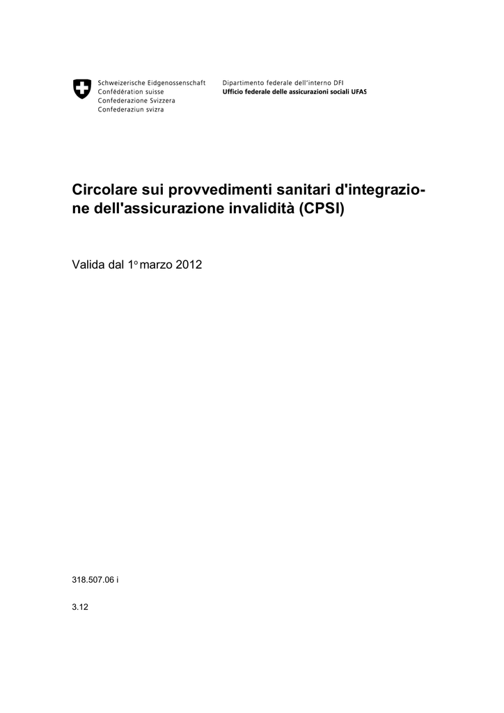 Circolare sui provvedimenti sanitari d'integrazione dell'assicurazione invalidità (CPSI) Valida dal 1o marzo 2012 318.507.06 i 3.12 2 Premessa La nuova edizione della presente circolare sostituisce la versione in vigore dal 1° gennaio 2010. Essa contiene correzioni e precisazioni in diversi capitoli. Le modifiche concernono principalmente la gestione degli accertamenti e della valutazione degli incarti medici nell’ambito dell’IC 404 OIC. Alla circolare è inoltre stata aggiunta la “Guida all’IC 404” (Allegato 7). Tabelle contenenti i prodotti dietetici sostituiscono l’Elenco dei prodotti dietetici nell’Allegato 2, complemento 1. Questi i numeri marginali modificati, completati e/o nuovi: 14, 32, 280, 313, 387.14, 395, 403.6, 404, 405, 406, 425.2, 462, testo introduttivo 495-499, 498, 645-647/845-847.5, 1000, 1203, 1209, 1210, 1233, 1248 e Allegato 2. L’abrogazione dal 1° gennaio 2012 degli articoli 11 LAI e 23 OAI comporta la soppressione dei N. 1100 – 1108 (pagine F1- F5). 3 Indice Abbreviazioni ........................................................................... 7 1a parte1 Diritto ai provvedimenti sanitari dell'AI in generale ........................................................ A 1 Capitolo 1 Diritto ai provvedimenti sanitari secondo l'articolo 3 LPGA e l’articolo 13 LAI ..................................... A 2 1.1 1.2 1.3 1.4 1.5 1.6 Definizione e principio ............................................ A Delimitazioni ........................................................... A Inizio e durata del diritto ......................................... A Controlli medici....................................................... A Casi particolari ....................................................... A Modifiche nell'OIC .................................................. A 2 3 5 6 7 8 Capitolo 2 Diritto ai provvedimenti sanitari d'integrazione secondo l'articolo 12 LAI .................................... B 1 Le condizioni per la concessione .......................................... B 1 2.1 2.2 2.3 2.3.1 2.3.2 2.3.3 2.4 2.4.1 2.4.2 2.5 2.6. 2.7 Principio ................................................................. B L'invalidità .............................................................. B Correzione di postumi stabilizzati o di deficienze funzionali ................................................................ B In generale ............................................................. B Relazione materiale con la cura della malattia o dell'infortunio .......................................................... B Provvedimenti d'integrazione profilattici.................. B Delimitazione nel tempo rispetto alla cura vera e propria del male ..................................................... B Inizio dell'integrazione sanitaria .............................. B Durata dell'integrazione sanitaria ........................... B Effetto minimo richiesto sulla capacità al guadagno, sulla formazione professionale o sulla capacità di svolgere le mansioni consuete ............ B Insieme di provvedimenti il cui carattere predominante è l'integrazione ................................ B Trattamento di postumi d'infortunio e di malattie professionali di cui soffrono persone obbligatoriamente assicurate secondo la LAINF .... B 1 2 3 3 4 6 6 6 8 9 10 11 4 2.8 2a parte Volume delle prestazioni nell'ambito dell'art. 12 LAI ........................................................ B 12 Obbligo di versare prestazioni per alcune infermità e secondo la natura dei provvedimenti .................................................. C 1 Capitolo 1 Particolarità delle infermità congenite ................ C 2 1.1 1.2 1.3 1.4 1.5 1.6 1.7 1.8 1.9 1.10 1.11 1.12 1.13 1.14 1.15 1.16 1.17 Pelle ....................................................................... C Scheletro ................................................................ C Articolazioni, muscoli e tendini ............................... C Faccia .................................................................... C Polmoni .................................................................. C Esofago, stomaco e intestini................................... C Fegato, vie biliari e pancreas.................................. C Parete addominale ................................................. C Cuore, vasi e sistema linfatico ................................ C Sangue, milza e sistema reticolo-endoteliale.......... C Sistema urogenitale ............................................... C Sistema nervoso centrale, periferico ed autonomo . C Malattie psichiche e gravi ritardi dello sviluppo ....... C Organi dei sensi ..................................................... C Metabolismo e ghiandole endocrine ....................... C Malformazioni congenite che toccano diversi sistemi organici .................................................................. C Altre infermità ......................................................... C 2 3 6 10 13 14 16 16 17 17 19 20 28 33 38 40 41 Capitolo 2 Delimitazione dei provvedimenti sanitari in caso di postumi di malattie e infortuni (affezioni acquisite; articolo 12 LAI) ................................... D 1 2.1 2.2 2.3 2.4 2.5 2.6 2.6.1 Malattie infettive e parassitarie ............................... D Neoplasie (tumori) .................................................. D Allergie, malattie del metabolismo e della nutrizione, disturbi della secrezione interna ............................. D Malattie del sangue e degli organi emopoietici ad esclusione delle neoplasie ..................................... D Psicosi, psiconevrosi e disturbi della personalità .... D Sistema nervoso .................................................... D Epilessie di origine postnatale ................................ D 1 1 2 2 2 4 4 5 2.6.2 2.6.3 2.7 2.7.1 2.7.2 2.8 2.9 2.10 2.11 2.12 2.13 2.13.1 2.13.2 2.13.3 2.13.4 2.13.5 2.13.6 2.13.7 2.13.8 2.13.9 Paralisi dovute a lesioni cerebrali e