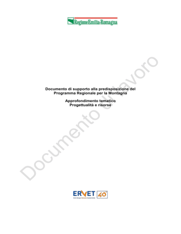 Documento di supporto alla predisposizione del Programma Regionale per la Montagna Approfondimento tematico Progettualità e risorse Indice 1. Introduzione ..................................................................................................................... 5 2. Fondo Regionale per la Montagna 2010-2014................................................................. 5 2.1 Identificazione degli interventi prioritari individuati negli Accordi-Quadro per lo sviluppo della montagna nel PRM 2009 - 2011 ................................................................ 5 2.2 Risorse finanziarie ...................................................................................................... 5 3. Fondo di Sviluppo e Coesione - FSC 2007-2013 (ex FAS).............................................. 8 4. Fondo Europeo di Sviluppo Regionale 2007-2013 (FESR)............................................ 11 5. Programma Regionale di Sviluppo Rurale 2007 – 2013 (PRSR) ................................... 13 FONTI ................................................................................................................................ 14 1. Introduzione La nota evidenzia i principali risultati della precedente programmazione in termini di: a) interventi realizzati per settori di attuazione; b) risorse assegnate distinguendo le diverse fonti di finanziamento; c) la distribuzione territoriale. In particolare, gli interventi attuati nelle aree montane sono stati finanziati dal Fondo Regionale per la Montagna - con risorse statali e regionali - dal Fondo di Sviluppo e Coesione (FSC ex FAS), dal Fondo Europeo di Sviluppo Regionale (FESR) e dal Fondo Europeo Agricolo per lo Sviluppo Rurale (FEASR). Ove possibile, gli interventi sono stati illustrati mediante descrittive con numero di interventi per linea d’azione e per settore, risorse assegnate, distribuzione territoriale. 2. Fondo Regionale per la Montagna 2010-2014 2.1 Identificazione degli interventi prioritari individuati negli Accordi-Quadro per lo sviluppo della montagna nel PRM 2009 - 2011 I dati riportati di seguito sono il risultato di un’analisi1 condotta sugli interventi contenuti negli Accordi-Quadro per lo sviluppo della montagna. Definiti nel 2008 (L.R. n. 10), gli Accordi-Quadro concorrono a realizzare gli obiettivi indicati nel Programma Regionale per la Montagna, attraverso interventi definiti congiuntamente da Regione, Province e dai singoli Enti Locali associativi, comprendenti i Comuni montani territorialmente interessati. 2.2 Risorse finanziarie Il quadro delle risorse allocate nella precedente programmazione sul Fondo Regionale per la Montagna, riportato in tabella 1, è di 18,169 Meuro, di cui 11 Meuro di competenza regionale. In tabella 2 invece si riporta la distribuzione territoriale. Risorse risorse statali risorse regionali Totale Tabella 1. Annualità 2010, 2012, 2014 (dati in Euro) 2010 2012 2014 3.914.406 1.530.359 1.708.652 6.151.020 2.000.000 2.865.000 10.065.427 3.530.359 4.573.652 1 Totale 7.153.418 11.016.020 18.169.438 Si è utilizzata una cluster analysis finalizzata a raggruppare alcune variabili in classi secondo criteri di similarità, ovvero delimitare osservazioni il più possibile omogenee all'interno delle classi ed il più possibile disomogenee tra le diverse classi. Il concetto di omogeneità viene specificato in termini di distanza. Operativamente la cluster analysis, al fine di meglio indirizzare le politiche del nuovo programma regionale per la montagna, può essere utilizzata per: Identificare aree territoriali in cui emergono fabbisogni comuni; segmentare gli attori-target per strategie comunicative mirate. 5 Tabella 2. Distribuzione territoriale delle risorse assegnate per provincia Fondo Montagna - risorse statali Fondo Montagna - risorse regionali Provincia Bologna Parma Forlì-Cesena Modena Reggio Emilia Piacenza Ravenna Rimini Totale 2010 857.653 785.087 687.732 570.021 434.985 376.377 145.682 56.870 2012 337.882 302.821 266.166 225.786 165.459 152.822 57.101 22.322 2014 387.530 319.910 280.815 237.497 174.460 161.716 60.096 86.628 Tot. 1.583.065 1.407.818 1.234.713 1.033.304 774.905 690.915 262.878 165.820 % 22,1% 19,7% 17,3% 14,4% 10,8% 9,7% 3,7% 2,3% 3.914.406 1.530.359 1.708.652 7.153.418 100% Provincia Bologna Forlì-Cesena Parma Modena Reggio Emilia Piacenza Rimini Ravenna 2010 1.310.815 1.051.998 1.201.330 871.548 665.322 576.115 251.108 222.784 2012 424.164 334.756 381.024 283.840 208.108 192.820 103.436 71.852 2014 605.027 554.767 325.330 439.612 344.106 308.073 169.683 118.403 Tot. 2.340.007 1.941.521 1.907.684 1.595.000 1.217.535 1.077.008 524.227 413.039 % 21,2% 17,6% 17,3% 14,5% 11,1% 9,8% 4,8% 3,7% Totale 6.151.020 2.000.000 2.865.000 11.016.020 100% L’interpretazione dei risultati emersi dall’analisi ha portato a individuare il “Miglioramento della viabilità principale e minore” come la principale azione sulla quale si concentrano le risorse previste dagli Accordi-Quadro comune a tutto il territorio montano. Sono state inoltre individuate 12 priorità d’intervento e tre gruppi di territori omogenei sulla base delle scelte di intervento e priorità, come di seguito riportato. Tabella 3. Descrizione delle priorità di intervento Priorità 1 2 3 4 5 6 7 8 9 10 11 12 Descrizione Qualificazione della viabilità principale e minore Promozione della sostenibilità e qualità ambientale (uso sostenibile delle risorse) Rafforzamento e valorizzazione dell'economia locale legata al turismo Miglioramento di servizi e infrastrutture sociali, culturali e sportive del territorio Valorizzazione ambientale e paesaggistica (valorizzazione del bosco) Valorizzazione ambientale e paesaggistica mediante progetto unitario e d'area vasta Valorizzazione e promozione di percorsi e itinerari storici e culturali Salvaguardia del rischio idrogeologico e prevenzione del dissesto Diffusione della banda larga Sviluppo della rete dei servizi (community network) Interventi per la ri