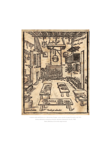 Incisione tratta dall’Opera di m. Bartolomeo Scappi, cuoco secreto di papa Pio quinto, del 1570, ripresa dall’edizione apparsa a Venezia, appresso Alessandro Vecchi, 1598 Siena, Biblioteca Comunale degli Intronati La cucina degli italiani tradizione e lingua dall’Italia al mondo G F Uno dei caratteri peculiari dell’identità linguistica italiana è dato dal concetto dell’unità nella molteplicità. Unità e molteplicità, e, su un piano diverso, stabilità e mutamento sono categorie attraverso le quali si può cercare di interpretare la realtà italiana, anche quella linguistica, nel suo farsi storico e nel suo comporsi attuale. La stabilità è dovuta al costituirsi precoce di un modello unitario di lingua scritta e letteraria, che trova nell’azione di Pietro Bembo il cardine di un principio normalizzatore fondato sulla lingua dei grandi autori fiorentini del Trecento; il mutamento è dovuto all’azione molteplice delle forze di cambiamento che premono sulla lingua (in senso verticale, i dialetti; in senso orizzontale, l’influsso delle lingue straniere di prestigio, il francese prima, l’inglese poi). Queste relazioni assumono particolare rilievo in un settore primario del lessico qual è quello della lingua della cucina e dell’alimentazione: esperienza fondamentale e quotidiana, che presenta un forte ascendente nelle radici delle singole comunità, una forte aderenza alla vita materiale, e al tempo stesso una marcata proiezione esterna, proprio in quanto fattore identitario. Si può dunque riflettere su come questi caratteri si intreccino nel vivo della realtà materiale, ad esempio con gli scambi fra lingua e dialetti: la dicotomia che opponeva la prima ai secondi, in passato assunta in una sorta di irredimibile polarità e fissità, si è venuta col tempo articolando, e i confini dapprima netti si sono progressivamente sfumati in una gradazione di registri molteplici e variamente connotabili fra lo scritto e il parlato. In secondo luogo, il processo di globalizzazione delle merci e dei cibi, successivo all’affermarsi dell’industrializzazione, ha riflessi non solo a livello di mercato e di tutela dei prodotti locali, ma anche nella circolazione delle parole: così che gli italianismi gastronomici nel mondo sono diventati una componente non trascurabile della diffusione dell’italiano di oggi. LA LINGUA DELLA CUCINA MEDIEVALE: UNA REALTÀ MULTIFORME La cucina medievale non è facilmente circoscrivibile né definibile. A tendenze unitarie, che corrispondono a tecniche comuni e vivande di portata addirittura continentale (uniche almeno nel nome, come il favoloso biancomangiare), fanno riscontro caratteri ed elaborazioni non trascurabilmente marcati in senso locale. Il rapporto fra realtà piccole e realtà grandi (locali e globali, diremmo oggi) è terreno particolarmente sensibile per l’epoca medievale: e questo vale a livello del continente e del singolo paese. Anche di recente è stato sottolineato, nella prospettiva della storia della cucina, come la realtà italiana sia dominata fin dal Medioevo dalle città, con il contado a cui sono intimamente legate: la città è luogo di scambio, di mercato, di consumo, le sue porte si aprono ogni mattino per accogliere i contadini, i mercanti, che portano i prodotti della campagna circostante da cui essa trae alimento. Tutta una tradizione storico-artistica non meno che letteraria ci parla di questo rapporto stretto e diuturno fra la realtà urbana e il suo territorio. Si determina poi fra le varie città una circolazione di prodotti, di tecniche, di tradizioni alimentari, che crea una situazione di condivisione, una rete di conoscenze, diremmo oggi; e reciprocamente, anche elementi generalmente conosciuti, di larga condivisione, possono essere localmente declinati secondo usi, consuetudini, tradizioni proprie: è questo il caso, ad esempio, delle torte, salate e ripiene, un elemento fondamentale della cucina medievale che passerà poi a quella rinascimentale, e che vengono caratterizzate in senso locale secondo un principio di inesauribile varietà. Non meno complesso è il problema delle fonti per lo studio della cucina medievale. La codificazione scritta della pratica culinaria, che avviene nell’Europa occidentale, pressoché contemporaneamente nella parte latina e germanica, fra Due e Trecento (Bruno Laurioux ha parlato di una riapparizione, dopo l’oblio altomedievale in cui nemmeno si copiano più i testi classici), produce una messe consistente di testimonianze latine e soprattutto volgari, più o meno organiche, a lungo anonime (il primo “autore” che compare è Maestro Martino intorno alla metà del Quattrocento), dalla testualità aperta a scambi e interferenze, che ci restituiscono le tracce di una cucina alta, nobile o borghese, certo non popolare. Studi specifici negli ultimi venti anni, condotti da storici francesi (Jean Louis Flandrin, Odile Redon, Bruno Laurioux già ricordato, Allen J. Grieco) e studiosi italiani (Lucia Bertolini, Sergio Lubello, Anna Martellotti) ne hanno ridisegnato il panorama e la valenza testuale, le vicende di trasmissione, la connotazione linguistica. Possediamo ora un censimento capillare dei libri di cucina italiani ante 1500, dal quale sembrano emergere due tradizioni principali: una di area meridionale, costituitasi alla corte di Federico II secondo la tesi di Anna Martellotti, fondata sul Liber de coquina (in latino) e poi estesa altrove, e dunque legata all’ambiente delle corti aristocratiche; e una di area toscana, probabilmente di origine senese, la cosiddetta tradizione dei dodici ghiotti, che si muove nell’ambiente dell’alta borghesia. Con autori diversificati, secondo tipologie di intervento differenziate, questi ricettari “capostipiti” sono stati copiati, adattati e modificati in diverse zone d’Italia; linguisticamente, testi differenti accostano a un latino profondamente intessuto di volgarismi nel lessico e nell’andamento sintattico il volgare n