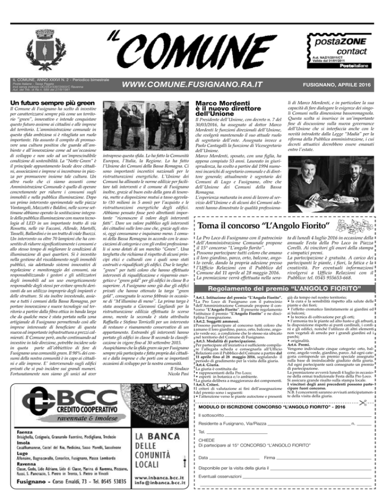 IL COMUNE, ANNO XXXVI N. 2 - Periodico bimestrale Poste Italiane - Tassa Pagata Invii senza indirizzo DC/DCI/33972003/C Ravenna Aut. del Trib. di Ra n. 689 del 27/8/1981 WWW.COMUNE.FUSIGNANO.RA.IT Un futuro sempre più green Il Comune di Fusignano ha scelto di investire per caratterizzarsi sempre più come un territorio “green”, innovativo e intende conquistare questo futuro assieme ai cittadini e alle imprese del territorio. L'amministrazione comunale in questa sfida ambiziosa si è ritagliata un ruolo importante. Ha assunto il compito di promuovere una cultura positiva che guarda all'ambiente e all'innovazione come ad un'occasione di sviluppo e non solo ad un'imprescindibile condizione di sostenibilità. La “Notte Green” è il principale appuntamento locale dove cittadini, associazioni e imprese si incontrano in piazza per promuovere insieme tale cultura. Un altro ruolo che ci siamo assunti come Amministrazione Comunale è quello di operare concretamente per ridurre i consumi sugli immobili e nella pubblica illuminazione. Dopo un primo intervento sperimentale nelle piazze Vantangoli, Mazzotti e Baldini, nelle scorse settimane abbiamo operato la sostituzione integrale della pubblica illuminazione con nuova tecnologia al LED in un importante tratto di via Rossetta, nelle vie Faccani, Allende, Martelli, Tasselli, Ballardini e in un tratto di viale Buozzi. Un intervento su oltre 70 lampioni che ha consentito di ridurre significativamente i consumi e allo stesso tempo di migliorare le condizioni di illuminazione di quei quartieri. Si è investito nella gestione del riscaldamento negli immobili pubblici, sia adottando sistemi innovativi di regolazione e monitoraggio dei consumi, sia responsabilizzando i gestori e gli utilizzatori degli immobili ad un uso energeticamente responsabile degli stessi per evitare sprechi derivanti da un utilizzo improprio degli impianti e delle strutture. Si sta inoltre investendo, assieme a tutti i comuni della Bassa Romagna, per portare innovazione e nuove tecnologie sul territorio a partire dalla fibra ottica in banda larga che da qualche mese è stata portata nella zona artigianale di Fusignano permettendo così alle imprese interessate di beneficiare di questa nuova ed importante infrastruttura a prezzi calmierati. Il Comune però, anche continuando ad investire in tale direzione, potrebbe incidere solo in quota parte all'obbiettivo di fare di Fusignano una comunità green. Il 98% dei consumi della nostra comunità è in capo ai cittadini e alle imprese. E' intervenendo sugli edifici privati che si può incidere sui grandi numeri. Fortunatamente non siamo gli unici ad aver FUSIGNANO, APRILE 2016 Marco Mordenti è il nuovo direttore dell’Unione intrapreso questa sfida. Lo ha fatto la Comunità Europea, l'Italia, la Regione. Lo ha fatto l'Unione dei Comuni della Bassa Romagna. Ci sono importanti incentivi nazionali per le ristrutturazioni energetiche. L'Unione dei Comuni ha allineato le norme edilizie per facilitare tali interventi e il comune di Fusignano inoltre, grazie al buon esito della gara di tesoreria, mette a disposizione mutui a tasso agevolato (10 milioni in 5 anni) per l'acquisto e le ristrutturazioni energetiche degli edifici. Abbiamo pensato fosse però altrettanti importante “riconoscere il valore degli interventi fatti”. Dare un valore pubblico agli interventi dei cittadini sulle loro case che, grazie agli stessi, oggi consumano e inquinano meno. I comuni della Bassa Romagna in accordo con le associazioni di categoria e con gli ordini professionali si sono dotati di un marchio “Green”. Una targhetta che richiama il rispetto di alcuni principi etici e culturali con i quali sono stati costruiti o riqualificati gli edifici. Due le targhe: "green" per tutti coloro che hanno effettuato interventi di riqualificazione e risparmio energetico e "green gold" per gli edifici in classe B o superiore. A Fusignano sono già due gli edifici privati che hanno ottenuto la targa “green gold”, consegnata lo scorso febbraio in occasione di “M’illumino di meno”. La prima targa è stata assegnata a Giovanni Gagliardi per la ristrutturazione edilizia effettuata lo scorso anno, mente la seconda è stata attribuita Raffaella e Stefano Torricelli per un intervento di restauro e risanamento conservativo di un appartamento. Entrambi gli interventi hanno portato gli edifici in classe B secondo la classificazione in vigore fino al 30 settembre 2015. Auspichiamo che la sfida green sia per Fusignano sempre più partecipata e fatta propria dai cittadini e dalla imprese e che porti con se importanti occasioni di sviluppo per la nostra comunità. Il Sindaco Nicola Pasi Il Presidente dell'Unione, con decreto n. 7 del 30/03/2016, ha assegnato al dottor Marco Mordenti le funzioni direzionali dell'Unione, che svolgerà mantenendo il suo attuale ruolo di segretario dell'ente. Assegnata invece a Paolo Cantagalli la funzione di Vicesegretario dell'Unione. Marco Mordenti, sposato, con una figlia, ha appena compiuto 53 anni. Laureato in giurisprudenza, ha svolto a partire dal 1994 numerosi incarichi di segretario comunale e di direttore generale; attualmente è segretario dei Comuni di Lugo e Fusignano, oltre che dell'Unione dei Comuni della Bassa Romagna. L’esperienza maturata in anni di lavoro al servizio dell’Unione e di alcuni dei Comuni aderenti hanno dimostrato le qualità professiona- li di Marco Mordenti, e in particolare la sua capacità di fare dialogare le esigenze dei singoli Comuni nella dimensiona bassoromagnola. Questa scelta si inserisce in un'importante fase di discussione sulla nuova governance dell’Unione che si interfaccia anche con le novità introdotte dalla Legge “Madia” per la riforma della Pubblica amministrazione, i cui decreti attuativi dovrebbero essere emanati entro l'estate. Torna il concorso “L’Angolo Fiorito” La Pro Loco di Fusignano con il patrocinio dell’Amministrazione Comunale propone il 15° concorso “L