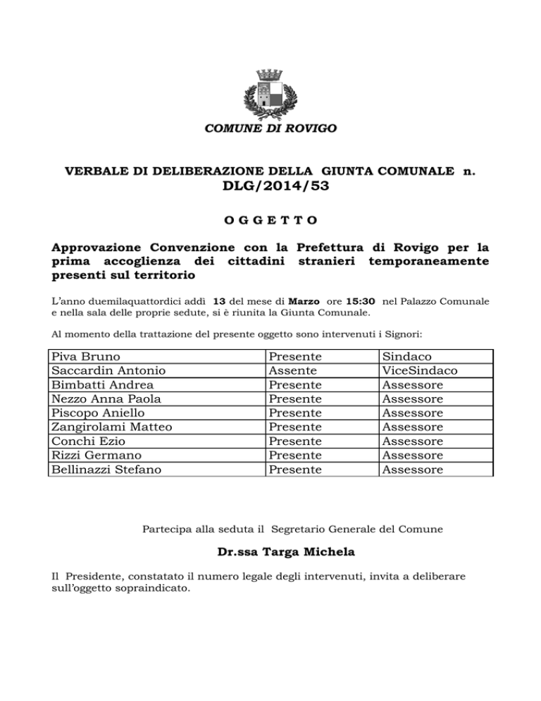 COMUNE DI ROVIGO VERBALE DI DELIBERAZIONE DELLA GIUNTA COMUNALE n. DLG/2014/53 OGGETTO Approvazione Convenzione con la Prefettura di Rovigo per la prima accoglienza dei cittadini stranieri temporaneamente presenti sul territorio L’anno duemilaquattordici addì 13 del mese di Marzo ore 15:30 nel Palazzo Comunale e nella sala delle proprie sedute, si è riunita la Giunta Comunale. Al momento della trattazione del presente oggetto sono intervenuti i Signori: Piva Bruno Saccardin Antonio Bimbatti Andrea Nezzo Anna Paola Piscopo Aniello Zangirolami Matteo Conchi Ezio Rizzi Germano Bellinazzi Stefano Presente Assente Presente Presente Presente Presente Presente Presente Presente Sindaco ViceSindaco Assessore Assessore Assessore Assessore Assessore Assessore Assessore Partecipa alla seduta il Segretario Generale del Comune Dr.ssa Targa Michela Il Presidente, constatato il numero legale degli intervenuti, invita a deliberare sull’oggetto sopraindicato. LA GIUNTA COMUNALE ● Premesso che la Prefettura – Ufficio Territoriale del Governo di Rovigo – al fine di fronteggiare situazioni di emergenza connesse al verificarsi di sbarchi di immigrati irregolari ha la necessità di assicurare ospitalità a persone richiedenti asilo nella fase istruttoria ed in attesa dell’assegnazione alla struttura dell’ente gestore da parte del Servizio Centrale di protezione dei richiedenti asilo finanziato dal fondo nazionale per le politiche e i servizi dell’asilo -S.P.R.A.R. – al quale il nostro Comune aderisce; ● Dato atto che nel quadriennio 2007/2013 il Comune ha sottoscritto un accordo con la Prefettura di Rovigo per la gestione della prima accoglienza delle persone richiedenti asilo , la cui esperienza è risultata positiva; ● Vista la nota del 15/1/2014 acquisita agli atti con prot. PG/2014/4477, con la quale la Prefettura di Rovigo ha rappresentato la necessità di prorogare per due anni la convenzione in essere al 31/12/2013 in attesa di sottoscrivere una nuova convenzione secondo le specifiche fornite dal Ministero dell’Interno; ● Considerato che con la sottoscrizione della convenzione con la Prefettura qui allegata, il Comune di Rovigo mette a disposizione per l’accoglienza di persone richiedenti asilo n. 2 posti nel Centro di accoglienza di “Casa Mimma” in Viale Gramsci, 62 o presso strutture convenzionate con il Comune, e che la Prefettura di Rovigo – Ufficio Territoriale del Governo di Rovigo – si impegna a rimborsare al Comune di Rovigo le spese di accoglienza nella misura di € 30,00 pro-capite prodie; ● Considerato che l’accoglienza delle persone inviate dalla Prefettura di Rovigo sarà gestita dalla Cooperativa Sociale Onlus “Porto Alegre” di Rovigo all’interno della convenzione che verrà sottoscritta con la cooperativa per la gestione del progetto di cui al Servizio Centrale per Richiedenti Asilo e Rifugiati S.P.R.A.R. 2014/2016 che è stata individuata a seguito di gara pubblica come soggetto collaboratore per la co-progettazione, organizzazione e gestione dei servizi di accoglienza, integrazione e tutela rivolta ai richiedenti asilo e rifugiati; ● Che gli effetti della convenzione decorrono dal mese di marzo 2014 con scadenza il 28/2/2016; ●Dato atto che il presente provvedimento non comporta impegno di spesa da parte di questa Amministrazione; VISTO l’art. 48 del D.Lgs.n. 267/2000 e l’art. 26 del vigente Statuto comunale riguardanti le competenze della Giunta comunale; PRESO atto che, ai sensi dell’art. 49 del Decreto Legislativo 267 del 18/08/2000, recante “Testo Unico delle Leggi sull’Ordinamento degli EE.LL., sono stati espressi i seguenti pareri: a) dal Responsabile del Servizio interessato, in ordine alla sola regolarità tecnica: favorevole; Ad unanimità di voti favorevoli espressi nelle forme di legge; DELIBERA 1. di approvare l’allegato accordo in convenzione con la Prefettura – Ufficio Territoriale del Governo di Rovigo – per la gestione della prima accoglienza -1- alle persone richiedenti asilo per il periodo marzo 2014 e scadenza il 28/2/2016; 2. di dare atto che il presente provvedimento non comporta impegno di spesa; 3. di dare atto che, per le motivazioni in premessa espresse, l’accoglienza delle persone inviate dalla Prefettura di Rovigo sarà realizzata dalla Cooperativa Sociale Onlus “Porto Alegre” di Rovigo all’interno della convenzione che verrà sottoscritta per la gestione del progetto SPRAR 2014/2016; 4. di dichiarare la presente deliberazione immediatamente eseguibile, ai sensi dell’art.134, comma 4, del D.Lgs 18/08/2000 n.267, stante l’urgenza. -2- CONVENZIONE PER LA MESSA A DISPOSIZIONE DI POSTI STRAORDINARI PER LA PRIMA ACCOGLIENZA DEI CITTADINI STRANIERI TEMPORANEAMENTE PRESENTI SUL TERRITORIO Tra Prefettura - Ufficio Territoriale del Governo di Rovigo nella persona del Viceprefetto Vicario appositamente delegato dal Prefetto e VISTO il d.l. 30 ottobre 1995, n. 451, convertito in L. 29 dicembre 1995, n. 563; VISTA la legge 30.12.1995 n. 563 ed il relativo Regolamento di attuazione , decreto del Ministro dell’Interno n. 233 del 2.1.1996, il quale all’art. 3 prevede, fra l’altro, che le Prefetture, al fine di fronteggiare situazioni di emergenza connesse al verificarsi di sbarchi di immigrati irregolari possono disporre interventi di prima assistenza in favore degli stessi, da realizzarsi anche in collaborazione con soggetti pubblici o privati individuando le strutture con le caratteristiche ricettive ritenute idonee in base alle esigenze; SI CONVIENE E SI STIPULA QUANTO SEGUE: Articolo 1 Soggetti La presente convenzione viene stipulata tra la Prefettura e il COMUNE DI ROVIGO, C.F. 00192630291, rappresentato dal Dirigente del Politiche sociali e per la famiglia, Politiche per la casa, Politiche del lavoro, Volontariato, Pari Opportunità, Risorse Umane, Euro progettazione, Servizio comunicazione informazione ed innovazione, Assistenza e segreteria organi istituzionali, Affari Generali, A