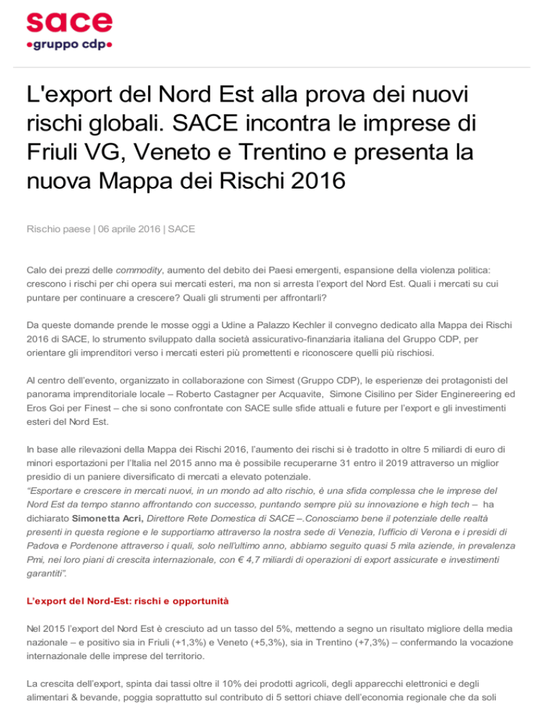 L'export del Nord Est alla prova dei nuovi rischi globali. SACE incontra le imprese di Friuli VG, Veneto e Trentino e presenta la nuova Mappa dei Rischi 2016 Rischio paese | 06 aprile 2016 | SACE Calo dei prezzi delle commodity, aumento del debito dei Paesi emergenti, espansione della violenza politica: crescono i rischi per chi opera sui mercati esteri, ma non si arresta l’export del Nord Est. Quali i mercati su cui puntare per continuare a crescere? Quali gli strumenti per affrontarli? Da queste domande prende le mosse oggi a Udine a Palazzo Kechler il convegno dedicato alla Mappa dei Rischi 2016 di SACE, lo strumento sviluppato dalla società assicurativo-finanziaria italiana del Gruppo CDP, per orientare gli imprenditori verso i mercati esteri più promettenti e riconoscere quelli più rischiosi. Al centro dell’evento, organizzato in collaborazione con Simest (Gruppo CDP), le esperienze dei protagonisti del panorama imprenditoriale locale – Roberto Castagner per Acquavite, Simone Cisilino per Sider Enginereering ed Eros Goi per Finest – che si sono confrontate con SACE sulle sfide attuali e future per l’export e gli investimenti esteri del Nord Est. In base alle rilevazioni della Mappa dei Rischi 2016, l’aumento dei rischi si è tradotto in oltre 5 miliardi di euro di minori esportazioni per l’Italia nel 2015 anno ma è possibile recuperarne 31 entro il 2019 attraverso un miglior presidio di un paniere diversificato di mercati a elevato potenziale. “Esportare e crescere in mercati nuovi, in un mondo ad alto rischio, è una sfida complessa che le imprese del Nord Est da tempo stanno affrontando con successo, puntando sempre più su innovazione e high tech – ha dichiarato Simonetta Acri, Direttore Rete Domestica di SACE –.Conosciamo bene il potenziale delle realtà presenti in questa regione e le supportiamo attraverso la nostra sede di Venezia, l’ufficio di Verona e i presidi di Padova e Pordenone attraverso i quali, solo nell’ultimo anno, abbiamo seguito quasi 5 mila aziende, in prevalenza Pmi, nei loro piani di crescita internazionale, con € 4,7 miliardi di operazioni di export assicurate e investimenti garantiti”. L’export del Nord-Est: rischi e opportunità Nel 2015 l’export del Nord Est è cresciuto ad un tasso del 5%, mettendo a segno un risultato migliore della media nazionale – e positivo sia in Friuli (+1,3%) e Veneto (+5,3%), sia in Trentino (+7,3%) – confermando la vocazione internazionale delle imprese del territorio. La crescita dell’export, spinta dai tassi oltre il 10% dei prodotti agricoli, degli apparecchi elettronici e degli alimentari & bevande, poggia soprattutto sul contributo di 5 settori chiave dell’economia regionale che da soli valgono per circa il 70% delle vendite estere dall’area: meccanica strumentale (che cresce al 4% e pesa per oltre il 20% sull’export del Nord Est), tessile & abbigliamento (pari al 14% delle vendite estere totali), gioielli (13%), prodotti in metallo (12%) e alimentari & bevande (9%). Sebbene i mercati dell’Unione Europea rimangano le destinazioni privilegiate dell’export del Nord Est, nell’ultimo anno le vendite verso i Paesi extra Ue sono cresciute del 5,3%. Non a caso, la nuova Mappa dei Rischi di SACE segnala importanti margini di crescita verso un paniere diversificato di mercati emergenti, con profili di rischio certamente non trascurabili, che possono tuttavia essere affrontati con successo e profitto, puntando su coperture specifiche e un approccio strategico: Algeria, Tunisia, Turchia e in prospettiva Iran per il Nord Africa e Medio Oriente, Corea del Sud in Asia, ma anche Repubblica Ceca e Polonia in Europa. Tra le geografie più rischiose per l’export della regione nel 2016, segnala invece Grecia e Russia. Rischi e opportunità per l’export del Nord Est nel 2016 La Mappa dei Rischi di SACE La Mappa dei Rischi di SACE identifica le diverse tipologie di rischio a cui si espone un’azienda nell’operare all’estero, basandosi sull’analisi del rischio di credito affrontato da esportatori, finanziatori, investitori industriali e appaltatori in 196 paesi. Scopri su sace.it/riskmap la mappa interattiva o scarica la nuova app per iOS e Android di SACE! Telefono +39 06.6736.888 Email [email protected] Condividi su LinkedIn Condividi su Twitter