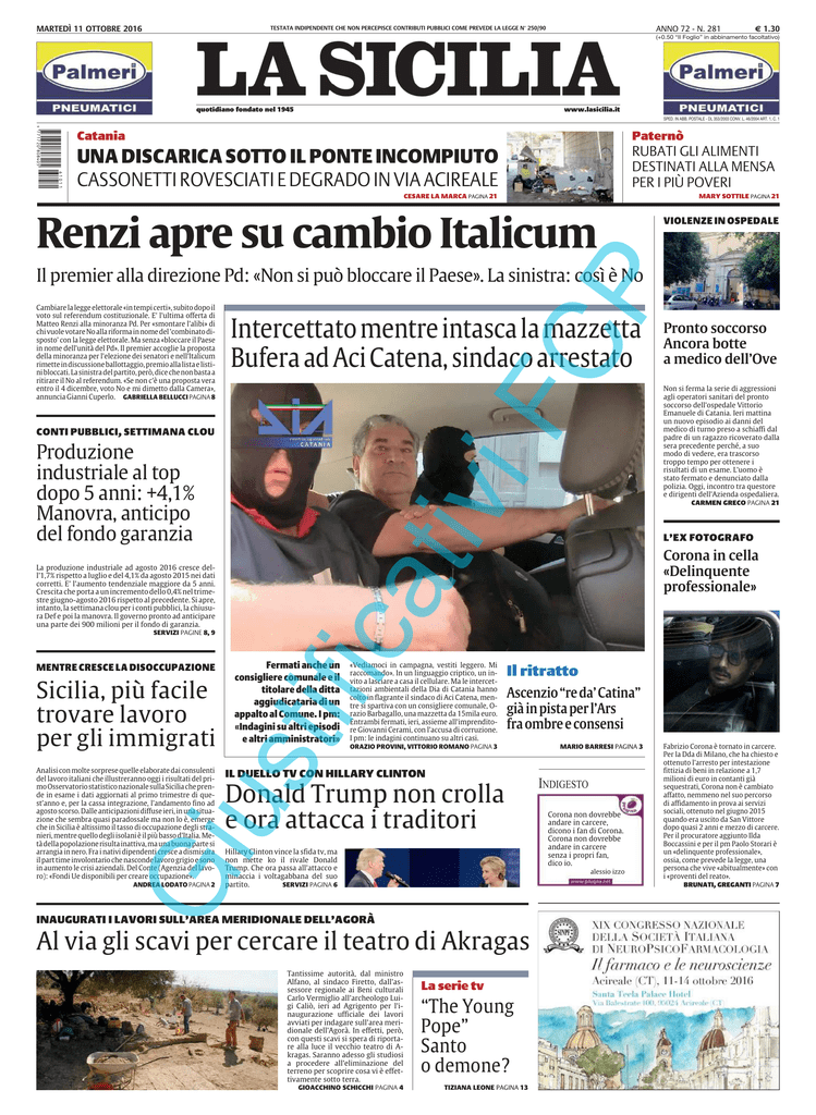 MARTEDÌ 11 OTTOBRE 2016 TESTATA INDIPENDENTE CHE NON PERCEPISCE CONTRIBUTI PUBBLICI COME PREVEDE LA LEGGE N° 250/90 ANNO 72 - N. 281 E 1.30 SPED. IN ABB. - DLin 353/2003 CONV. L. 46/2004 ART. 1, C. 1 (+0.50 “Il POSTALE Foglio” abbinamento facoltativo) quotidiano fondato nel 1945 www.lasicilia.it SPED. IN ABB. POSTALE - DL 353/2003 CONV. L. 46/2004 ART. 1, C. 1 y(7HB7C0*SKSOKP( +.!#!z!#!= Catania Paternò RUBATI GLI ALIMENTI DESTINATI ALLA MENSA PER I PIÙ POVERI UNA DISCARICA SOTTO IL PONTE INCOMPIUTO CASSONETTI ROVESCIATI E DEGRADO IN VIA ACIREALE CESARE LA MARCA PAGINA 21 MARY SOTTILE PAGINA 21 Renzi apre su cambio Italicum VIOLENZE IN OSPEDALE Il premier alla direzione Pd: «Non si può bloccare il Paese». La sinistra: così è No Cambiare la legge elettorale «in tempi certi», subito dopo il voto sul referendum costituzionale. E' l’ultima offerta di Matteo Renzi alla minoranza Pd. Per «smontare l’alibi» di chi vuole votare No alla riforma in nome del 'combinato disposto’ con la legge elettorale. Ma senza «bloccare il Paese in nome dell’unità del Pd». Il premier accoglie la proposta della minoranza per l’elezione dei senatori e nell’Italicum rimette in discussione ballottaggio, premio alla lista e listini bloccati. La sinistra del partito, però, dice che non basta a ritirare il No al referendum. «Se non c'è una proposta vera entro il 4 dicembre, voto No e mi dimetto dalla Camera», annuncia Gianni Cuperlo. GABRIELLA BELLUCCI PAGINA 8 Intercettato mentre intasca la mazzetta Bufera ad Aci Catena, sindaco arrestato Pronto soccorso Ancora botte a medico dell’Ove Non si ferma la serie di aggressioni agli operatori sanitari del pronto soccorso dell’ospedale Vittorio Emanuele di Catania. Ieri mattina un nuovo episodio ai danni del medico di turno preso a schiaffi dal padre di un ragazzo ricoverato dalla sera precedente perché, a suo modo di vedere, era trascorso troppo tempo per ottenere i risultati di un esame. L’uomo è stato fermato e denunciato dalla polizia. Oggi, incontro tra questore e dirigenti dell’Azienda ospedaliera. CONTI PUBBLICI, SETTIMANA CLOU Produzione industriale al top dopo 5 anni: +4,1% Manovra, anticipo del fondo garanzia CARMEN GRECO PAGINA 21 L’EX FOTOGRAFO Corona in cella «Delinquente professionale» La produzione industriale ad agosto 2016 cresce dell’1,7% rispetto a luglio e del 4,1% da agosto 2015 nei dati corretti. E’ l’aumento tendenziale maggiore da 5 anni. Crescita che porta a un incremento dello 0,4% nel trimestre giugno-agosto 2016 rispetto al precedente. Si apre, intanto, la settimana clou per i conti pubblici, la chiusura Def e poi la manovra. Il governo pronto ad anticipare una parte dei 900 milioni per il fondo di garanzia. SERVIZI PAGINE 8, 9 MENTRE CRESCE LA DISOCCUPAZIONE Sicilia, più facile trovare lavoro per gli immigrati Analisi con molte sorprese quelle elaborate dai consulenti del lavoro italiani che illustreranno oggi i risultati del primo Osservatorio statistico nazionale sulla Sicilia che prende in esame i dati aggiornati al primo trimestre di quest’anno e, per la cassa integrazione, l’andamento fino ad agosto scorso. Dalle anticipazioni diffuse ieri, in una situazione che sembra quasi paradossale ma non lo è, emerge che in Sicilia è altissimo il tasso di occupazione degli stranieri, mentre quello degli isolani è il più basso d’Italia. Metà della popolazione risulta inattiva, ma una buona parte si arrangia in nero. Fra i nativi dipendenti cresce a dismisura il part time involontario che nasconde lavoro grigio e sono in aumento le crisi aziendali. Del Conte (Agenzia del lavoro): «Fondi Ue disponibili per creare occupazione». ANDREA LODATO PAGINA 2 Fermati anche un consigliere comunale e il titolare della ditta aggiudicataria di un appalto al Comune. I pm: «Indagini su altri episodi e altri amministratori» «Vediamoci in campagna, vestiti leggero. Mi raccomando». In un linguaggio criptico, un invito a lasciare a casa il cellulare. Ma le intercettazioni ambientali della Dia di Catania hanno colto in flagrante il sindaco di Aci Catena, mentre si spartiva con un consigliere comunale, Orazio Barbagallo, una mazzetta da 15mila euro. Entrambi fermati, ieri, assieme all’imprenditore Giovanni Cerami, con l’accusa di corruzione. I pm: le indagini continuano su altri casi. Il ritratto Ascenzio “re da’ Catina” già in pista per l’Ars fra ombre e consensi ORAZIO PROVINI, VITTORIO ROMANO PAGINA 3 IL DUELLO TV CON HILLARY CLINTON Donald Trump non crolla e ora attacca i traditori Hillary Clinton vince la sfida tv, ma non mette ko il rivale Donald Trump. Che ora passa all’attacco e minaccia i voltagabbana del suo partito. SERVIZI PAGINA 6 Corona non dovrebbe andare in carcere, dicono i fan di Corona. Corona non dovrebbe andare in carcere senza i propri fan, dico io. Fabrizio Corona è tornato in carcere. Per la Dda di Milano, che ha chiesto e ottenuto l’arresto per intestazione fittizia di beni in relazione a 1,7 milioni di euro in contanti già sequestrati, Corona non è cambiato affatto, nemmeno nel suo percorso di affidamento in prova ai servizi sociali, ottenuto nel giugno 2015 quando era uscito da San Vittore dopo quasi 2 anni e mezzo di carcere. Per il procuratore aggiunto Ilda Boccassini e per il pm Paolo Storari è un «delinquente professionale», ossia, come prevede la legge, una persona che vive «abitualmente» con i «proventi del reato». BRUNATI, GREGANTI PAGINA 7 Al via gli scavi per cercare il teatro di Akragas GIOACCHINO SCHICCHI PAGINA 4 INDIGESTO alessio izzo INAUGURATI I LAVORI SULL’AREA MERIDIONALE DELL’AGORÀ Tantissime autorità, dal ministro Alfano, al sindaco Firetto, dall’assessore regionale ai Beni culturali Carlo Vermiglio all’archeologo Luigi Caliò, ieri ad Agrigento per l’inaugurazione ufficiale dei lavori avviati per indagare sull’area meridionale dell’Agorà. In effetti, però, con questi scavi si spera di riportare alla luce il vecchio 