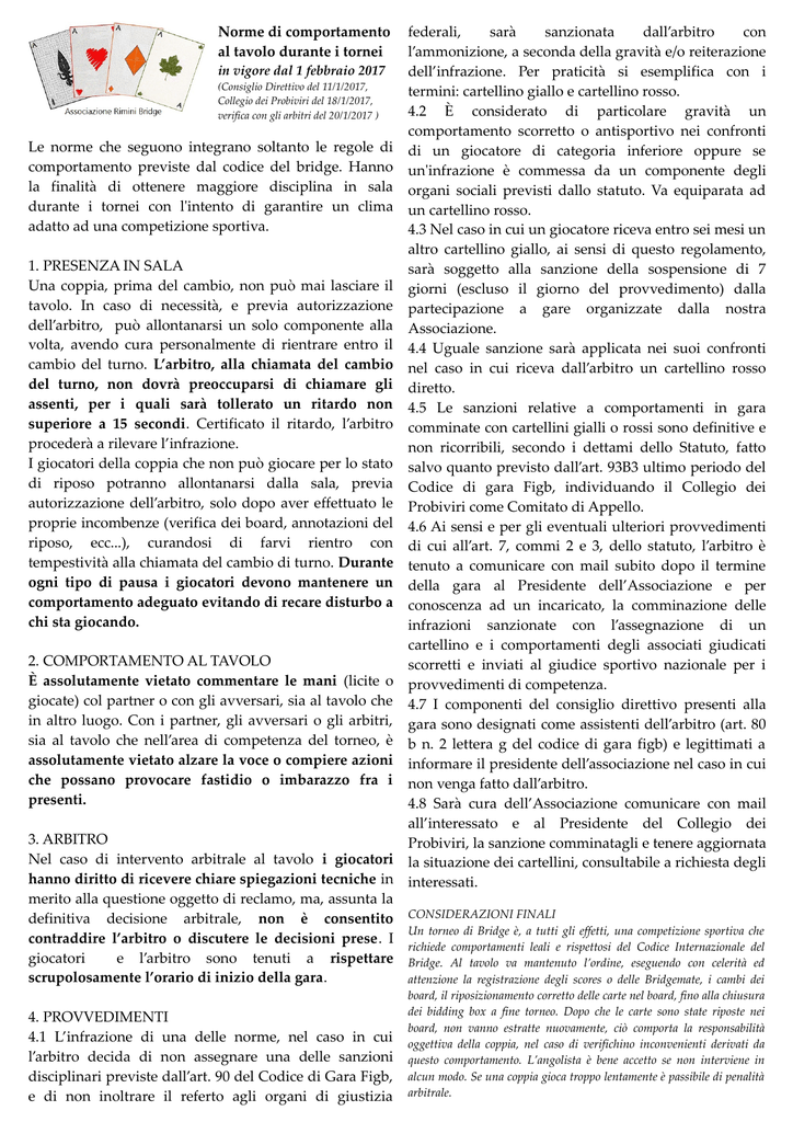 Norme di comportamento al tavolo durante i tornei in vigore dal 1 febbraio 2017 (Consiglio Direttivo del 11/1/2017, Collegio dei Probiviri del 18/1/2017, verifica con gli arbitri del 20/1/2017 ) Le norme che seguono integrano soltanto le regole di comportamento previste dal codice del bridge. Hanno la finalità di ottenere maggiore disciplina in sala durante i tornei con l'intento di garantire un clima adatto ad una competizione sportiva. 1. PRESENZA IN SALA Una coppia, prima del cambio, non può mai lasciare il tavolo. In caso di necessità, e previa autorizzazione dell’arbitro, può allontanarsi un solo componente alla volta, avendo cura personalmente di rientrare entro il cambio del turno. L’arbitro, alla chiamata del cambio del turno, non dovrà preoccuparsi di chiamare gli assenti, per i quali sarà tollerato un ritardo non superiore a 15 secondi. Certificato il ritardo, l’arbitro procederà a rilevare l’infrazione. I giocatori della coppia che non può giocare per lo stato di riposo potranno allontanarsi dalla sala, previa autorizzazione dell’arbitro, solo dopo aver effettuato le proprie incombenze (verifica dei board, annotazioni del riposo, ecc...), curandosi di farvi rientro con tempestività alla chiamata del cambio di turno. Durante ogni tipo di pausa i giocatori devono mantenere un comportamento adeguato evitando di recare disturbo a chi sta giocando. 2. COMPORTAMENTO AL TAVOLO È assolutamente vietato commentare le mani (licite o giocate) col partner o con gli avversari, sia al tavolo che in altro luogo. Con i partner, gli avversari o gli arbitri, sia al tavolo che nell’area di competenza del torneo, è assolutamente vietato alzare la voce o compiere azioni che possano provocare fastidio o imbarazzo fra i presenti. 3. ARBITRO Nel caso di intervento arbitrale al tavolo i giocatori hanno diritto di ricevere chiare spiegazioni tecniche in merito alla questione oggetto di reclamo, ma, assunta la definitiva decisione arbitrale, non è consentito contraddire l’arbitro o discutere le decisioni prese. I giocatori e l’arbitro sono tenuti a rispettare scrupolosamente l’orario di inizio della gara. 4. PROVVEDIMENTI 4.1 L’infrazione di una delle norme, nel caso in cui l’arbitro decida di non assegnare una delle sanzioni disciplinari previste dall’art. 90 del Codice di Gara Figb, e di non inoltrare il referto agli organi di giustizia federali, sarà sanzionata dall’arbitro con l’ammonizione, a seconda della gravità e/o reiterazione dell’infrazione. Per praticità si esemplifica con i termini: cartellino giallo e cartellino rosso. 4.2 È considerato di particolare gravità un comportamento scorretto o antisportivo nei confronti di un giocatore di categoria inferiore oppure se un'infrazione è commessa da un componente degli organi sociali previsti dallo statuto. Va equiparata ad un cartellino rosso. 4.3 Nel caso in cui un giocatore riceva entro sei mesi un altro cartellino giallo, ai sensi di questo regolamento, sarà soggetto alla sanzione della sospensione di 7 giorni (escluso il giorno del provvedimento) dalla partecipazione a gare organizzate dalla nostra Associazione. 4.4 Uguale sanzione sarà applicata nei suoi confronti nel caso in cui riceva dall’arbitro un cartellino rosso diretto. 4.5 Le sanzioni relative a comportamenti in gara comminate con cartellini gialli o rossi sono definitive e non ricorribili, secondo i dettami dello Statuto, fatto salvo quanto previsto dall’art. 93B3 ultimo periodo del Codice di gara Figb, individuando il Collegio dei Probiviri come Comitato di Appello. 4.6 Ai sensi e per gli eventuali ulteriori provvedimenti di cui all’art. 7, commi 2 e 3, dello statuto, l’arbitro è tenuto a comunicare con mail subito dopo il termine della gara al Presidente dell’Associazione e per conoscenza ad un incaricato, la comminazione delle infrazioni sanzionate con l’assegnazione di un cartellino e i comportamenti degli associati giudicati scorretti e inviati al giudice sportivo nazionale per i provvedimenti di competenza. 4.7 I componenti del consiglio direttivo presenti alla gara sono designati come assistenti dell’arbitro (art. 80 b n. 2 lettera g del codice di gara figb) e legittimati a informare il presidente dell’associazione nel caso in cui non venga fatto dall’arbitro. 4.8 Sarà cura dell’Associazione comunicare con mail all’interessato e al Presidente del Collegio dei Probiviri, la sanzione comminatagli e tenere aggiornata la situazione dei cartellini, consultabile a richiesta degli interessati. CONSIDERAZIONI FINALI Un torneo di Bridge è, a tutti gli effetti, una competizione sportiva che richiede comportamenti leali e rispettosi del Codice Internazionale del Bridge. Al tavolo va mantenuto l’ordine, eseguendo con celerità ed attenzione la registrazione degli scores o delle Bridgemate, i cambi dei board, il riposizionamento corretto delle carte nel board, fino alla chiusura dei bidding box a fine torneo. Dopo che le carte sono state riposte nei board, non vanno estratte nuovamente, ciò comporta la responsabilità oggettiva della coppia, nel caso di verifichino inconvenienti derivati da questo comportamento. L’angolista è bene accetto se non interviene in alcun modo. Se una coppia gioca troppo lentamente è passibile di penalità arbitrale.