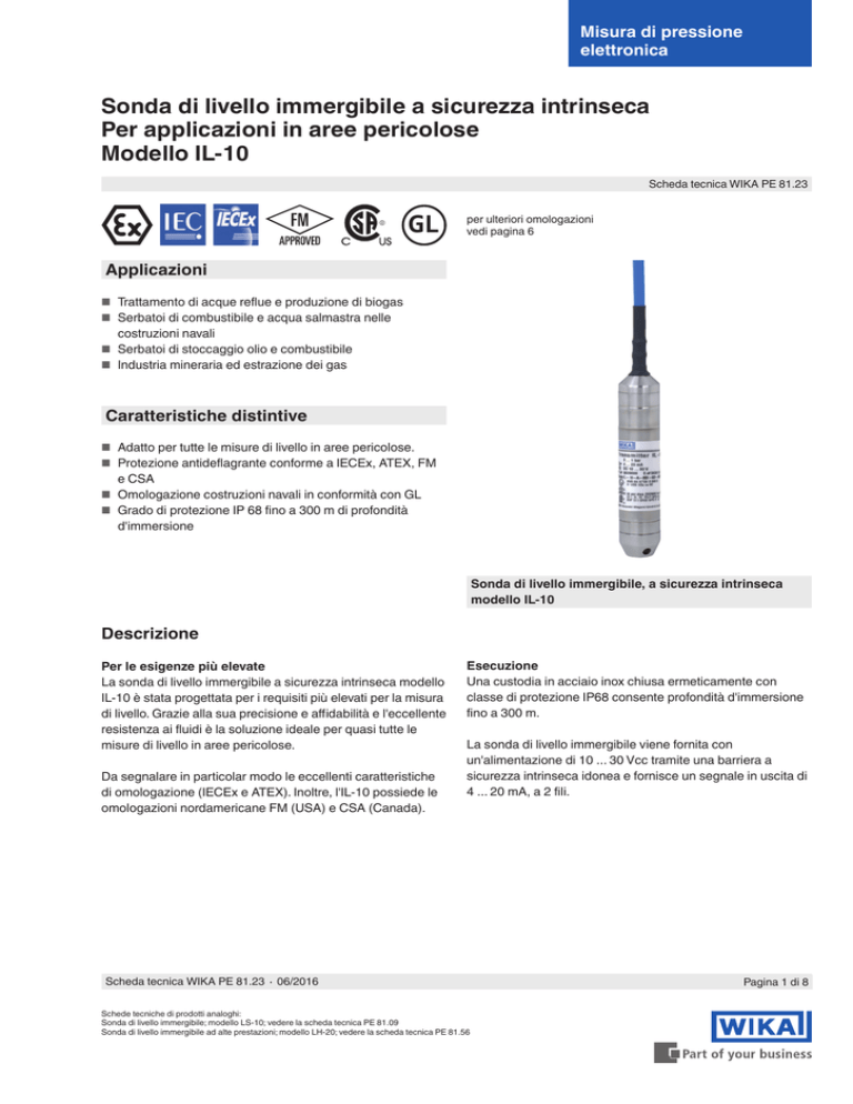 Misura di pressione elettronica Sonda di livello immergibile a sicurezza intrinseca Per applicazioni in aree pericolose Modello IL-10 Scheda tecnica WIKA PE 81.23 GL per ulteriori omologazioni vedi pagina 6 Applicazioni ■■ Trattamento di acque reflue e produzione di biogas ■■ Serbatoi di combustibile e acqua salmastra nelle costruzioni navali ■■ Serbatoi di stoccaggio olio e combustibile ■■ Industria mineraria ed estrazione dei gas Caratteristiche distintive ■■ Adatto per tutte le misure di livello in aree pericolose. ■■ Protezione antideflagrante conforme a IECEx, ATEX, FM e CSA ■■ Omologazione costruzioni navali in conformità con GL ■■ Grado di protezione IP 68 fino a 300 m di profondità d'immersione Sonda di livello immergibile, a sicurezza intrinseca modello IL-10 Descrizione Per le esigenze più elevate La sonda di livello immergibile a sicurezza intrinseca modello IL-10 è stata progettata per i requisiti più elevati per la misura di livello. Grazie alla sua precisione e affidabilità e l'eccellente resistenza ai fluidi è la soluzione ideale per quasi tutte le misure di livello in aree pericolose. Da segnalare in particolar modo le eccellenti caratteristiche di omologazione (IECEx e ATEX). Inoltre, l'IL-10 possiede le omologazioni nordamericane FM (USA) e CSA (Canada). Esecuzione Una custodia in acciaio inox chiusa ermeticamente con classe di protezione IP68 consente profondità d'immersione fino a 300 m. La sonda di livello immergibile viene fornita con un'alimentazione di 10 ... 30 Vcc tramite una barriera a sicurezza intrinseca idonea e fornisce un segnale in uscita di 4 ... 20 mA, a 2 fili. Scheda tecnica WIKA PE 81.23 ∙ 06/2016 Schede tecniche di prodotti analoghi: Sonda di livello immergibile; modello LS-10; vedere la scheda tecnica PE 81.09 Sonda di livello immergibile ad alte prestazioni; modello LH-20; vedere la scheda tecnica PE 81.56 Pagina 1 di 8 Campi di misura Pressione relativa bar Campo di misura Sovrapressione di sicurezza Campo di misura psi 0 ... 0,25 0 ...0.4 1 0 ... 1,6 0 ... 2,5 8 Campo di misura 0 ... 10 0 ... 16 0 ... 25 Campo di misura Sovrapressione di sicurezza 0 ... 50 400 0 ... 100 0 ... 150 0 ... 250 Campo di misura 0 ... 5 0 ... 10 0 ... 15 0 ... 25 25 400 1.600 1.600 55 55 55 115 0 ... 100 0 ... 160 0 ... 200 0 ... 300 Campo di misura 0 ... 1 0 ... 1,6 0 ... 2,5 0 ... 4 Campo di misura 10 0 ... 10 360 360 10 0 ... 16 80 80 Campo di misura 0 ... 100 0 ... 160 0 ... 250 250 250 275 0 ...6 40 0 ... 25 40 0 ... 50 360 10 Sovrapressione di sicurezza Sovrapressione di sicurezza 25 30 Sovrapressione di sicurezza Sovrapressione di sicurezza 0 ... 6 19 Campo di misura 360 4 0 ... 4 8 25 0 ... 0,6 4 4 Sovrapressione di sicurezza mH2O 0 ... 1 0 ... 0,16 1 Sovrapressione di sicurezza Sovrapressione di sicurezza inWC 0 ... 0,1 1 40 0 .. 40 0 ... 60 190 250 300 Per la scelta del cavo FEP, sono disponibili campi di misura fino a 0 ...10 bar, 0 ... 150 psi e 0 ... 100 mH2O. I campi di misura indicati sono disponibili anche in mbar, kPa e MPa. Segnale di uscita Specifiche della precisione Segnale 4 ... 20 mA, 2 fili Precisione alle condizioni di riferimento Carico in Ω ≤ (alimentazione - 10 Vcc) / 0,02 A (lunghezza del cavo in m x 0,14 Ω) Tensione di alimentazione Alimentazione 10 ... 30 Vcc Alimentazione: Pagina 2 di 8 Standard Opzione ≤ ±0,50 % dello span ≤ ± 0,25 % dello span 1) 1) Solo per campi di misura fino ≥ 0,25 bar (3,6 psi) Include non linearità, isteresi, deviazione di zero e di fondo scala (corrisponde all'errore di misura secondo IEC 61298-2). Non linearità (IEC 61298-2) ≤ ±0,2 % dello span Non ripetibilità ≤ ±0,1 % dello span Condizioni di riferimento Temperatura: Pressione atmosferica: Umidità: Posizione di montaggio: Versioni selezionabili 15 ... 25 °C (59 ... 77 °F) 860 ... 1.060 mbar (12,5 ... 15,4 psi) 45 ... 75 % u. r. Calibrato in posizione di montaggio verticale con attacco al processo verso il basso. 24 Vcc Errore di temperatura entro 0 ... 50 °C ■■ Coefficiente medio per lo zero Campi di misura ≤ 0,25 bar (3,6 psi): Campi di misura > 0,25 bar (3,6 psi): ≤ ±0,4 % dello span/10 K ≤ ±0,2 % dello span/10 K ■■ Coefficiente medio per il fondo scala ≤ ±0,2 % dello span/10 K Stabilità a lungo termine alle condizioni di riferimento ≤ ±0,2 % dello span/anno Scheda tecnica WIKA PE 81.23 ∙ 06/2016 Condizioni operative Grado di protezione (secondo IEC 60529) IP68 Profondità d'immersione Sonda di livello immergibile con cavo FEP: Sonda di livello immergibile con cavo PUR: Peso Sonda di livello immergibile: Cavo: fino a 100 m (328 ft) fino a 300 m (984 ft) ca. 200 g (0,44 lbs) ca. 80 g/m (0,18 lbs) Massima forza di trazione del cavo Cavo FEP: 350 N senza pressacavo 500 N con pressacavo Cavo PUR: 350 N senza pressacavo 1.000 N con pressacavo Campi di temperatura ammessi Utilizzo sicuro: Funzionamento in conformità alle specifiche indicate nelle schede tecniche: Stoccaggio: vedi pagina 4 -10 ... +60°C (-10 ... +85°C con cavo FEP) 14 ... 140 °F (14 ... 185 °F con cavo FEP) -10 ... +60 °C (14 ... 140 °F) Valori di sicurezza max. per ATEX e IECEx Tensione Ui: 30 Vcc 100 mA Corrente Ii: 1W Potenza Pi: Segnale di corrente Ii: 4 ... 20 mA Capacità interna effettiva Ci (a seconda della lunghezza del cavo): 16,5 nF + 0,1 nF/m Induttanza interna effettiva Li (a seconda della lunghezza del cavo): 0 μH + 1 μH/m Per ulteriori condizioni di impiego e dati relativi alla sicurezza, fare riferimento al certificato CE prove di tipo sul sito www.wika.it Scheda tecnica WIKA PE 81.23 ∙ 06/2016 Pagina 3 di 8 Campo di temperatura ambiente, correlazione alla categoria dello strumento, classe di temperatura (ATEX e IECEx) Modello EPL Modello IL-10, con cavo PUR Ma -30 ... +80 °C non applicabile Ga, Ga/Gb, Gb -30 ... +60 °C T6 -30 ... +80 °C T5 -30 ... +80 °C T4 -30 ... +40 °C (750 mW) 120 °C -30 ... +70 °C (650 mW) 120 °C -30 ... +80 °C (550 mW) 120 °C Ma -30 ... +105 °C n