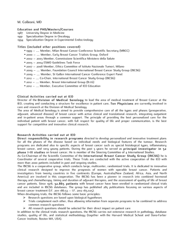 M. Colleoni, MD Education and PHD/Masters/Courses 1987 University Degree in Medicine 1991 Specialization Degree in Oncology 1994 Specialization Degree in Experimental Endocrinology Titles (included other positions covered) • 1999 – …. Member, Milan Breast Cancer Conference Scientific Secretary (MBCC) • 2000 – …. Member, Early Breast Cancer Trialists Group, Oxford • 2002 – 2003 Member, Commissione Scientifica Ministero della Salute • 2003 – 2004 ESMO Guidelines Task Force • 2007 – 2008 Member, Ethics Committee of Istituto Nazionale Tumori, Milano • 2009 – …. Member, Foundation Council International Breast Cancer Study Group (IBCSG) • 2009 – …. Member, St Gallen International Cancer Conference Expert Panel • 2012 – …. Co-Chair, International Breast Cancer Study Group (IBCSG) • 2012 – …. Member, Breast International Group (B.I.G) • 2012 – …. Member, Executive Committee of IEO Education Clinical Activities carried out at IEO Director of the Division of Medical Senology to lead the area of medical treatment of Breast Cancer at the IEO, creating and conducting a structure for excellence in patient care. Ten Physicians are currently involved in care and research at the Division of Medical Senology. The area of Medical Senology is aimed to provide comprehensive care of all the types and phases (preoperative, adjuvant, advanced disease) of breast cancer with active clinical and translational research, integrating outpatient and in-patient areas through a common support. The principle of providing the best personalized care for the individual patient with breast cancer, with full respect for quality of life and proper communication, is the best support for competitive and innovative clinical research. Research Activities carried out at IEO Direct responsibility in research programs directed to develop personalized and innovative treatment plans for all the phases of the disease based on individual needs and biological features of the tumour. Research programs are dedicated also to specific aspects of breast cancer such as special histological types, inflammatory breast cancer, and very young patients. During the past 3 years he served as principal investigator in 52 phase I-III studies on breast cancer. He is member of the Steering Committee of 4 International Studies. As Co-Chairman of the Scientific Committee of the International Breast Cancer Study Group (IBCSG) he is Coordinator of several cooperative trials. These Trials are conducted with the active cooperation of the IEO with more than 2000 patients included in past and ongoing studies. The IBCSG is a cooperative group, which conducts large, multicenter, randomized trials. It is dedicated to innovative clinical research designed to improve the prognosis of women with operable breast cancer. Patients and investigators from twenty countries in five continents (Europe, Australia/New Zealand, Africa, Asia, and North America) are involved in this cooperation. The IBCSG has been a pioneer in research into combined hormonal therapy and chemotherapy, timing and duration of adjuvant therapies, and the assessment of quality of life of breast cancer patients. Since 1978, 32.865 patients with breast cancer have been enrolled in randomized clinical trials and are included in IBCSG databases. The group has published 285 publications focusing on various aspects of breast cancer treatment (I.F. 2011 186.53 – I.F. 2012 165.025). When developing trials, the IBCSG follows some basic principles: Ø Research questions are based upon biological hypotheses Ø Trials complement each other, thus allowing information from separate programs to be combined to address common research questions Ø All research questions should be selected for their direct impact on patient care In addition to the clinical trials research questions, the IBCSG carries out extensive research in pathology, database studies, quality of life, and statistical methodology (together with the Harvard Medical School and Dana-Farber Cancer Institute, Boston MA, USA). He is author of approximately 300 publications in peer-reviewed journals. Passed Clinical and Research Activities 1987 - 1988 MD visiting fellow at the Division of Medical Oncology of National Cancer Institute of Milan. Clinical and research activity on NHL lymphomas, breast cancer. 1989 – 1991 MD fellow at the Division of Medical Oncology B at National Cancer Institute of Milan. Clinical activity and research activity on gastrointestinal tumors, lymphomas, breast cancer and palliative care. 1991 – 1993 MD Associate researcher at the Division of Medical Oncology B at National Cancer Institute of Milan. Clinical and research activity on gastrointestinal tumors, breast cancer and palliative care. 1993 – 1996 Deputy-director at the Division of Medical Oncology, City Hospital, Castelfranco Veneto. Clinical and research activity on lung cancer, gastrointestinal tumors and breast cancer. 1996 – 1998 Senior Assistant at the Division of Medical Oncology of European Institute of Oncology. Clinical and research activity on systemic treatments of breast cancer. 1998 – 2001 Deputy-Director of the Division of Medical Oncology of European Institute of Oncology. Clinical and research activity on systemic treatments of breast cancer. Responsibilities for patient’s care, improvement of communications between the medical team and patients, development of multidisciplinary activities 2001 – 2005 Co-Director of the Division of Medical Oncology of European Institute of Oncology. Clinical and research activity on breast cancer patients. 2005 – 01/2013 Director of Unit of Research in Medical Senology of European Institute of Oncology. Dedicated to lead the area of medical treatment of Breast Cancer at the IEO. Publications 1. Colleoni M, Goldhirsch A. Neoadjuvant chemotherapy for breast cancer: any progress?. LANCET ONCOL. 2013 Dec; 13: 70584-9. [Epub ahead of print]. 2. Colleoni M, Giob