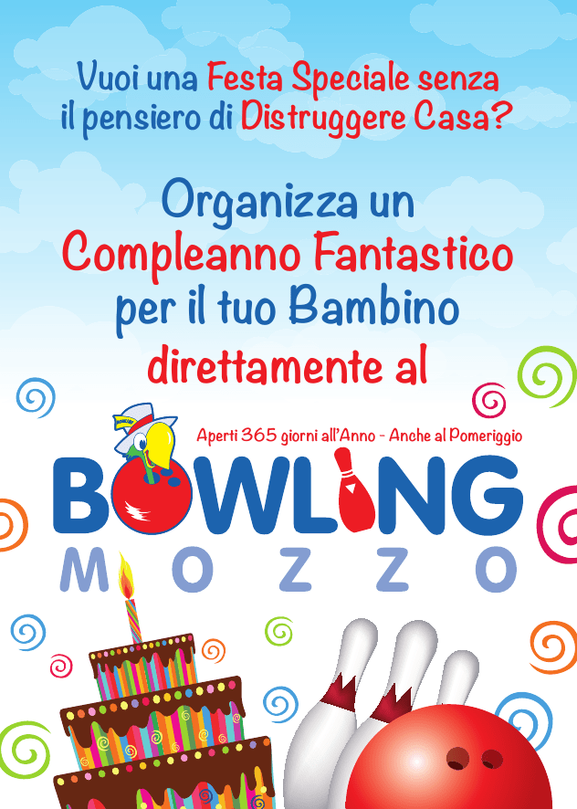 Vuoi una Festa Speciale senza il pensiero di Distruggere Casa? Organizza un Compleanno Fantastico per il tuo Bambino direttamente al Aperti 365 giorni all’Anno - Anche al Pomeriggio Pacchetto compleanni: - Biglietti per invito personalizzati - 2 Partite Bowling - 10 Gettoni videogiochi + Gadgets - Piste riservate e tavoli a disposizione x Rinfresco e taglio torta ecc. Da Lun a Sab Pomeriggio (Fine Festa entro 20:00) € 12,00 x Persona Da Lun a Ven Sera (dalle 19,00 a chiusura) € 15,00 x Persona Domenica Pom e Sera € 20,00 x Persona Prenotazione obbligatoria Esclusi Festivi e Prefestivi S.P. Dalmine – Villa d’Almè Info 035/462226 - www.bowlingmozzo.it