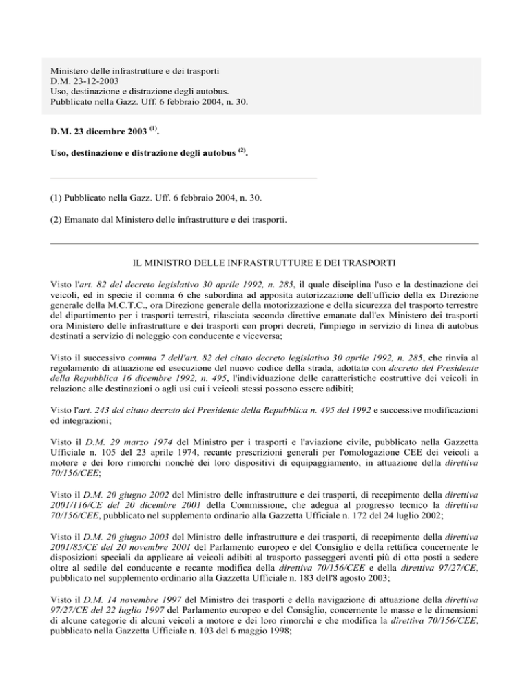 Ministero delle infrastrutture e dei trasporti D.M. 23-12-2003 Uso, destinazione e distrazione degli autobus. Pubblicato nella Gazz. Uff. 6 febbraio 2004, n. 30. D.M. 23 dicembre 2003 (1). Uso, destinazione e distrazione degli autobus (2). (1) Pubblicato nella Gazz. Uff. 6 febbraio 2004, n. 30. (2) Emanato dal Ministero delle infrastrutture e dei trasporti. IL MINISTRO DELLE INFRASTRUTTURE E DEI TRASPORTI Visto l'art. 82 del decreto legislativo 30 aprile 1992, n. 285, il quale disciplina l'uso e la destinazione dei veicoli, ed in specie il comma 6 che subordina ad apposita autorizzazione dell'ufficio della ex Direzione generale della M.C.T.C., ora Direzione generale della motorizzazione e della sicurezza del trasporto terrestre del dipartimento per i trasporti terrestri, rilasciata secondo direttive emanate dall'ex Ministero dei trasporti ora Ministero delle infrastrutture e dei trasporti con propri decreti, l'impiego in servizio di linea di autobus destinati a servizio di noleggio con conducente e viceversa; Visto il successivo comma 7 dell'art. 82 del citato decreto legislativo 30 aprile 1992, n. 285, che rinvia al regolamento di attuazione ed esecuzione del nuovo codice della strada, adottato con decreto del Presidente della Repubblica 16 dicembre 1992, n. 495, l'individuazione delle caratteristiche costruttive dei veicoli in relazione alle destinazioni o agli usi cui i veicoli stessi possono essere adibiti; Visto l'art. 243 del citato decreto del Presidente della Repubblica n. 495 del 1992 e successive modificazioni ed integrazioni; Visto il D.M. 29 marzo 1974 del Ministro per i trasporti e l'aviazione civile, pubblicato nella Gazzetta Ufficiale n. 105 del 23 aprile 1974, recante prescrizioni generali per l'omologazione CEE dei veicoli a motore e dei loro rimorchi nonché dei loro dispositivi di equipaggiamento, in attuazione della direttiva 70/156/CEE; Visto il D.M. 20 giugno 2002 del Ministro delle infrastrutture e dei trasporti, di recepimento della direttiva 2001/116/CE del 20 dicembre 2001 della Commissione, che adegua al progresso tecnico la direttiva 70/156/CEE, pubblicato nel supplemento ordinario alla Gazzetta Ufficiale n. 172 del 24 luglio 2002; Visto il D.M. 20 giugno 2003 del Ministro delle infrastrutture e dei trasporti, di recepimento della direttiva 2001/85/CE del 20 novembre 2001 del Parlamento europeo e del Consiglio e della rettifica concernente le disposizioni speciali da applicare ai veicoli adibiti al trasporto passeggeri aventi più di otto posti a sedere oltre al sedile del conducente e recante modifica della direttiva 70/156/CEE e della direttiva 97/27/CE, pubblicato nel supplemento ordinario alla Gazzetta Ufficiale n. 183 dell'8 agosto 2003; Visto il D.M. 14 novembre 1997 del Ministro dei trasporti e della navigazione di attuazione della direttiva 97/27/CE del 22 luglio 1997 del Parlamento europeo e del Consiglio, concernente le masse e le dimensioni di alcune categorie di alcuni veicoli a motore e dei loro rimorchi e che modifica la direttiva 70/156/CEE, pubblicato nella Gazzetta Ufficiale n. 103 del 6 maggio 1998; Visto il D.M. 18 aprile 1977 del Ministro per i trasporti recante «Caratteristiche costruttive degli autobus», pubblicato nella Gazzetta Ufficiale n. 135 del 19 maggio 1977; Vista la sentenza della Corte costituzionale 8-16 maggio 1997, n. 135, pubblicata nella serie speciale della Gazzetta Ufficiale n. 21 del 21 maggio 1997; Visto il D.M. 27 febbraio 1998 del Ministro dei trasporti e della navigazione, recante «Distrazione degli autobus dal servizio di linea al servizio di noleggio con conducente», pubblicato nella Gazzetta Ufficiale n. 60 del 13 marzo 1998 e i successivi decreti ministeriali di proroga dei termini di validità e, in particolare, il D.M. 20 febbraio 2003 del Ministro delle infrastrutture e dei trasporti, pubblicato nella Gazzetta Ufficiale n. 58 dell'11 marzo 2003; Visto il decreto legislativo 19 novembre 1997, n. 422, recante «Conferimento alle regioni ed agli enti locali di funzioni e compiti in materia di trasporto pubblico locale, a norma dell'art. 4, comma 4, della legge 15 marzo 1997, n. 59» e successive modificazioni ed integrazioni; Vista la legge 11 agosto 2003, n. 218, recante «Disciplina dell'attività di trasporto di viaggiatori effettuata mediante noleggio di autobus con conducente». Vista la circolare 15 ottobre 2003, n. 3868-MOT2/C relativa all'applicazione del D.M. 20 giugno 2003 per il rilascio di omologazioni nazionali o di omologazioni limitate per piccola serie; Considerata la necessità di disciplinare la destinazione ed uso degli autobus in base alle caratteristiche costruttive degli stessi stabilite dalle norme comunitarie recepite con i decreti ministeriali citati in premessa; Considerato che è presupposto indispensabile per dettare direttive concernenti gli aspetti tecnici connessi all'utilizzo di autobus per un uso o una destinazione diversa da quella riconosciuta idonea in sede di immatricolazione, aver prima individuato i limiti delle possibili destinazioni ed usi che gli autobus omologati in base alle nuove norme tecniche devono avere; Considerato che il rilascio dell'autorizzazione prevista dall'art. 82, comma 6, del decreto legislativo n. 285 del 1992, che attiene al mutamento di destinazione di autobus da servizio di noleggio con conducente a servizio di linea, e viceversa, implica una valutazione, conformemente a quanto statuito dalla Corte costituzionale con la richiamata sentenza n. 135 del 1997, che si fonda esclusivamente su criteri d'ordine tecnico riguardanti la sicurezza dei trasporti; Considerato che il decreto ministeriale 27 febbraio 1998, emanato a seguito della citata sentenza della Corte costituzionale n. 135 del 1997, ha dettato disposizioni transitorie in materia di distrazione di autobus da servizio di linea a servizio di noleggio con conducente e viceversa, prorogate con successivi decreti ministeriali l'ultimo dei quali proroga al 14 marzo 2004 il termine finale di valid