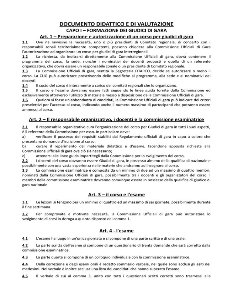 DOCUMENTO DIDATTICO E DI VALUTAZIONE CAPO I – FORMAZIONE DEI GIUDICI DI GARA Art. 1 – Preparazione e autorizzazione di un corso per giudici di gara 1.1 Ove ne ravvisino la necessità, uno o più presidenti di Comitato regionale, di concerto con i responsabili zonali territorialmente competenti, possono chiedere alla Commissione Ufficiali di Gara l'autorizzazione ad organizzare un corso per giudici di gara interregionali. 1.2 La richiesta, da inoltrarsi direttamente alla Commissione Ufficiali di gara, dovrà contenere il programma del corso, la sede, nonché i nominativi dei docenti proposti e quello di un referente organizzativo, che dovrà essere un responsabile zonale o un presidente di Comitato regionale. 1.3 La Commissione Ufficiali di gara, sentita la Segreteria FITARCO, decide se autorizzare o meno il corso. La CUG può autorizzare prescrivendo delle modifiche al programma, alla sede e ai nominativi dei docenti. 1.4 Il costo del corso è interamente a carico dei comitati regionali che lo organizzano. 1.5 Il corso e l'esame dovranno essere fatti seguendo le linee guida fornite dalla Commissione ed esclusivamente attraverso l'utilizzo di materiale messo a disposizione dalla Commissione Ufficiali di gara. 1.6 Qualora vi fosse un'abbondanza di candidati, la Commissione Ufficiali di gara può indicare dei criteri preselettivi per l'accesso al corso, indicando anche il numero massimo di partecipanti che potranno essere ammessi al corso. Art. 2 – Il responsabile organizzativo, i docenti e la commissione esaminatrice 2.1 Il responsabile organizzativo cura l'organizzazione del corso per Giudici di gara in tutti i suoi aspetti, è il referente della Commissione per esso. In particolare deve: a) verificare il possesso dei requisiti stabiliti dal Regolamento ufficiali di gara in capo a coloro che presentano domanda d'iscrizione al corso; b) curare il reperimento del materiale didattico e d'esame, facendone apposita richiesta alla Commissione Ufficiali di gara ove ciò sia necessario; c) attenersi alle linee guida impartitegli dalla Commissione per lo svolgimento del corso. 2.2 I docenti del corso dovranno essere Giudici di gara, in possesso almeno della qualifica di nazionale e possibilmente con una vasta esperienza nelle materie che andranno ad insegnare al corso. 2.3 La commissione esaminatrice è composta da un minimo di due ed un massimo di quattro membri, nominati dalla Commissione Ufficiali di gara, possibilmente tra i docenti e gli organizzatori del corso. I membri della commissione esaminatrice dovranno comunque essere in possesso della qualifica di giudice di gara nazionale. Art. 3 – il corso e l'esame 3.1 Le lezioni si tengono per un minimo di quattro ed un massimo di sei giornate, possibilmente durante il fine settimana. 3.2 Per comprovate e motivate necessità, la Commissione Ufficiali di gara può autorizzare lo svolgimento di corsi in deroga a quanto disposto dal comma 1. Art. 4 - l'esame 4.1 L'esame ha luogo in un'unica giornata e si compone di una parte scritta e di una orale. 4.2 La parte scritta dell'esame si compone di un questionario di trenta domande che sarà corretto dalla commissione esaminatrice. 4.3 La parte quarta si compone di un colloquio individuale con la commissione esaminatrice. 4.4 Della correzione e degli esami orali è redatto sommario verbale, nel quale sono acclusi gli esiti dei medesimi. Nel verbale è inoltre acclusa una lista dei candidati che hanno superato l'esame. 4.5 Il verbale di cui al comma 3, unito con tutti i questionari scritti corretti sono trasmessi alla Commissione Ufficiali di gara. Il verbale è anticipato a mezzo posta elettronica. 4.6 La Commissione Ufficiali di gara comunica la lista dei candidati che hanno superato l'esame all'Ufficio Tecnico FITARCO, affinché lo stesso lo trasmetta al Consiglio Federale per i relativi provvedimenti. Art. 5 – il tirocinio 5.1 Qualora il candidato abbia superato l'esame di cui all'articolo 4, egli dovrà effettuare un tirocinio, affiancando un altro Giudice di gara in almeno quattro gare di calendario. 5.2 Qualora il tirocinio si svolga durante la stagione estiva, ove possibile, una gara dovrà essere di tipo Campagna e una di tipo 3D. 5.3 Se il tirocinio si svolge durante gare di calendario nazionale o comunque in gare in cui è richiesta la presenza di più di un Giudice di gara, il candidato può essere designato come parte della giuria, a condizione che egli sia già stato iscritto nell'elenco di cui alla lettera A) del comma 2 dell'articolo 42 del Regolamento Ufficiali di gara. 5.4 Ove il corso si svolga con le modalità di cui all'articolo 3 comma 2, la Commissione Ufficiali di gara può disporre che il tirocinio si svolga prima dell'esame. CAPO II – PERMANENZA E PROGRESSIONE Art. 6 – formazione permanente 6.1 La Commissione Ufficiali di gara assicura la costante ed omogenea fornitura di materiale aggiornato per la formazione permanente dei giudici di gara. La formazione permanente dei giudici di cara sarà curata dai rispettivi responsabili zonali. 6.2 La Commissione Ufficiali di gara assicura anche la formazione specifica di alcuni giudici di gara in specifiche aree regolamentari per fornire una migliore prestazione sui campi di gara. Art. 7 – i casi studio 7.1 La Commissione Ufficiali di gara comunica a tutti i giudici di gara, con cadenza quadrimestrale, due casi studio ai quali dev'essere data risposta scritta secondo le istruzioni della Commissione. 7.2 Le risposte ai casi studio sono archiviate ad opera della Commissione e formano, unitamente a quanto scritto sulle schede di valutazione semestrale ed eventuali richiami o provvedimenti disciplinari, il cinquanta per cento della valutazione di permanenza o progressione di un giudice di gara. 7.3 La mancata risposta ai casi studio è considerata come una risposta totalmente insufficiente ai fini della valutazione. 7.4 I Giudici di gara in possesso della qualifica della federazione continentale o internazionale sono esentati d