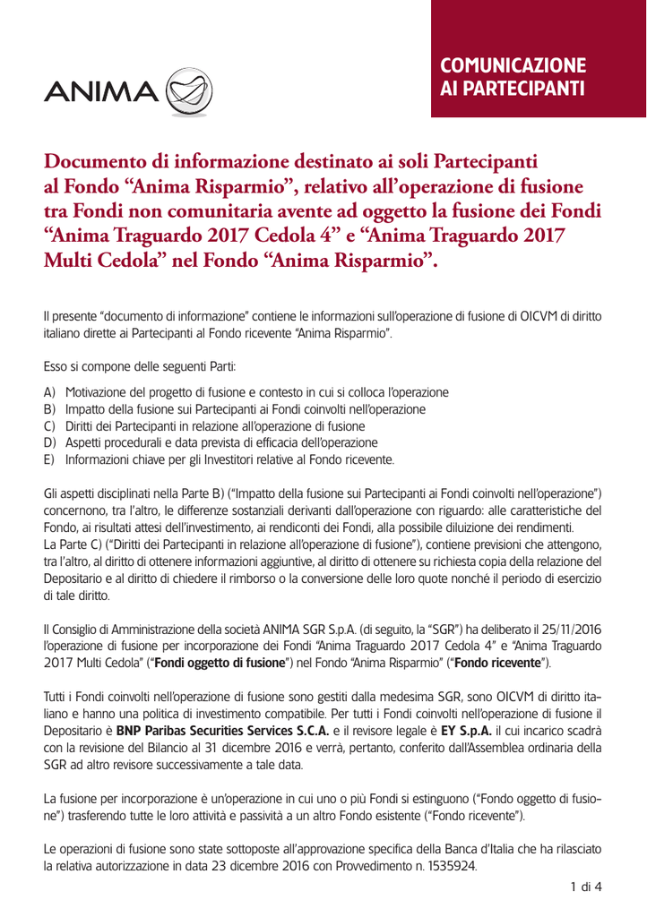COMUNICAZIONE AI PARTECIPANTI Documento di informazione destinato ai soli Partecipanti al Fondo “Anima Risparmio”, relativo all’operazione di fusione tra Fondi non comunitaria avente ad oggetto la fusione dei Fondi “Anima Traguardo 2017 Cedola 4” e “Anima Traguardo 2017 Multi Cedola” nel Fondo “Anima Risparmio”. Il presente “documento di informazione” contiene le informazioni sull’operazione di fusione di OICVM di diritto italiano dirette ai Partecipanti al Fondo ricevente “Anima Risparmio”. Esso si compone delle seguenti Parti: A) B) C) D) E) Motivazione del progetto di fusione e contesto in cui si colloca l’operazione Impatto della fusione sui Partecipanti ai Fondi coinvolti nell’operazione Diritti dei Partecipanti in relazione all’operazione di fusione Aspetti procedurali e data prevista di efficacia dell’operazione Informazioni chiave per gli Investitori relative al Fondo ricevente. Gli aspetti disciplinati nella Parte B) (“Impatto della fusione sui Partecipanti ai Fondi coinvolti nell’operazione”) concernono, tra l’altro, le differenze sostanziali derivanti dall’operazione con riguardo: alle caratteristiche del Fondo, ai risultati attesi dell’investimento, ai rendiconti dei Fondi, alla possibile diluizione dei rendimenti. La Parte C) (“Diritti dei Partecipanti in relazione all’operazione di fusione”), contiene previsioni che attengono, tra l’altro, al diritto di ottenere informazioni aggiuntive, al diritto di ottenere su richiesta copia della relazione del Depositario e al diritto di chiedere il rimborso o la conversione delle loro quote nonché il periodo di esercizio di tale diritto. Il Consiglio di Amministrazione della società ANIMA SGR S.p.A. (di seguito, la “SGR”) ha deliberato il 25/11/2016 l’operazione di fusione per incorporazione dei Fondi “Anima Traguardo 2017 Cedola 4” e “Anima Traguardo 2017 Multi Cedola” (“Fondi oggetto di fusione”) nel Fondo “Anima Risparmio” (“Fondo ricevente”). Tutti i Fondi coinvolti nell’operazione di fusione sono gestiti dalla medesima SGR, sono OICVM di diritto italiano e hanno una politica di investimento compatibile. Per tutti i Fondi coinvolti nell’operazione di fusione il Depositario è BNP Paribas Securities Services S.C.A. e il revisore legale è EY S.p.A. il cui incarico scadrà con la revisione del Bilancio al 31 dicembre 2016 e verrà, pertanto, conferito dall’Assemblea ordinaria della SGR ad altro revisore successivamente a tale data. La fusione per incorporazione è un’operazione in cui uno o più Fondi si estinguono (“Fondo oggetto di fusione”) trasferendo tutte le loro attività e passività a un altro Fondo esistente (“Fondo ricevente”). Le operazioni di fusione sono state sottoposte all’approvazione specifica della Banca d’Italia che ha rilasciato la relativa autorizzazione in data 23 dicembre 2016 con Provvedimento n. 1535924. 1 di 4 Documento Informativo Parte A) - Motivazione del progetto di fusione e contesto in cui si colloca l’operazione Le operazioni di fusione per incorporazione dei Fondi “Anima Traguardo 2017 Cedola 4” e “Anima Traguardo 2017 Multi Cedola” nel Fondo “Anima Risparmio - Classe A” conseguono a quanto previsto dai vigenti Regolamenti di gestione di ciascun Fondo oggetto di fusione. In particolare, l’art. 1, comma 8, del Regolamento di gestione del Fondo “Anima Traguardo 2017 Cedola 4” e l’art. 1, comma 9, del Regolamento di gestione del Fondo “Anima Traguardo 2017 Multi Cedola”. Tenuto conto che nel corso del 2017 saranno raggiunte le rispettive scadenze (30 giugno 2017 per il Fondo “Anima Traguardo 2017 Cedola 4” e 29 dicembre 2017 per il Fondo “Anima Traguardo 2017 Multi Cedola”) si è reso necessario deliberare le relative operazioni di fusione al fine di procedere, nel rispetto dei termini indicati per ciascun Fondo, alla fusione dei Fondi “Anima Traguardo 2017 Cedola 4” e “Anima Traguardo 2017 Multi Cedola” in quello di destinazione già individuato nei vigenti Regolamenti (“Anima Risparmio”). Parte B) - Impatto della fusione sui Partecipanti ai Fondi coinvolti nell’operazione Il Fondo ricevente non subirà alcuna variazione per effetto e in coincidenza dell’efficacia dell’operazione di fusione. B.1.) Risultati attesi dall’investimento Invariato. B.2.) Oggetto, politica di investimento e altre caratteristiche Invariato. B.3.) Indicatore sintetico di rischio e rendimento del Fondo e rischi rilevanti non rappresentati dall’indicatore Invariato. B.4.) Regime dei proventi Invariato. B.5.) Regime delle spese Invariato. B.6.) Rendiconti dei Fondi Invariato. B.7.) Differenze nei diritti dei Partecipanti a seguito del perfezionamento dell’operazione Invariato. 2 di 4 Documento Informativo B.8.) Possibile diluizione dei rendimenti Si ritiene che le operazioni di fusione non produrranno impatti sui Partecipanti in termini di diluizione dei rendimenti in considerazione della tendenziale omogeneità dei portafogli e della ridotta dimensione del patrimonio di entrambi i Fondi oggetto di fusione rispetto al patrimonio del Fondo ricevente. B.9.) Regime fiscale applicabile L’operazione di fusione non produrrà impatti sul regime fiscale applicabile ai Partecipanti ai Fondi coinvolti nell’operazione. B.10.) Informazioni specifiche per i Partecipanti al Fondo ricevente (“Anima Risparmio”) Poiché le politiche d’investimento dei Fondi coinvolti nell’operazione di fusione sono tra loro tendenzialmente omogenee, la SGR non si aspetta che la fusione abbia un impatto sostanziale sul portafoglio del Fondo ricevente. A seguito della fusione, la SGR non ha deliberato di apportare al Regolamento del Fondo ricevente modifiche regolamentari. Parte C) - Diritti dei Partecipanti in relazione all’operazione di fusione I Partecipanti al Fondo ricevente hanno il diritto di chiedere, senza spese diverse da quelle strettamente inerenti ai costi di disinvestimento, il 