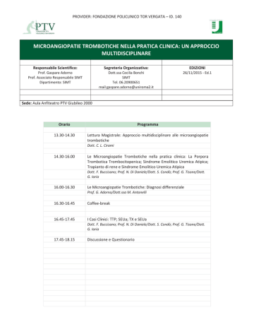 PROVIDER:FONDAZIONEPOLICLINICOTORVERGATA–ID.140 MICROANGIOPATIETROMBOTICHENELLAPRATICACLINICA:UNAPPROCCIO MULTIDISCIPLINARE ResponsabileScientifico: EDIZIONI SegreteriaOrganizzativa: Prof.GaspareAdorno Prof.AssociatoResponsabileSIMT Dipartimento:SIMT Dott.ssaCeciliaBonchi SIMT Tel.06.20900651 mail:[email protected] 26/11/2015ͲEd.1 Sede:AulaAnfiteatroPTVGiubileo2000 Orario 13.30Ͳ14.30 Programma Lettura Magistrale: Approccio multidisciplinare alle microangiopatie trombotiche 14.30Ͳ16.00 Dott.C.L.Cirami 16.00Ͳ16.30 16.30Ͳ16.45 16.45Ͳ17.45 17.45Ͳ18.15 Le Microangiopatie Trombotiche nella pratica clinica: La Porpora Trombotica Trombocitopenica;SindromeEmoliticoUremica Atipica; TrapiantodireneeSindromeEmoliticoUremicaAtipica Dott.F.Buccisano;Prof.N.DiDaniele/Dott.S.Condò;Prof.G.Tisone/Dott. G.Iaria LeMicroangiopatieTrombotiche:Diagnosidifferenziale Prof.G.Adorno/Dott.ssaM.Antonelli CoffeeͲbreak ICasiClinici:TTP;SEUa;TXeSEUa Dott.F.Buccisano;Prof.N.DiDaniele/Dott.S.Condò;Prof.G.Tisone/Dott. G.Iaria DiscussioneeQuestionario PROVIDER:FONDAZIONEPOLICLINICOTORVERGATA–ID.140 Destinatari:Medici(5,13,15,19,30,34,35,47,53);Infermieri(85);Tecnici(93);Biologi(68)(vediallegatoG) CREDITIE.C.M.:4CreditiE.C.M. ModalitàdiPartecipazione:Iscrizionetramitemail([email protected])otelefonandoaln°0620900651 Obiettivoformativo:(18) Areaformativa:(barrareunasolavoce) X Ͳ Obiettivotecnico–professionale Ͳ Obiettivodiprocesso Ͳ Obiettivodisistema &XUULFXOXP9LWDH (XURSDVV ,QIRUPD]LRQLSHUVRQDOL 1RPHL&RJQRPHL *$63$5($'2512 ,QGLUL]]RL 1XPHURFLYLFRYLDFRGLFHSRVWDOHFLWWjQD]LRQH)DFROWDWLYRYLVWUX]LRQL 7HOHIRQRL )DFROWDWLYRYLVWUX]LRQL &HOOXODUH )DFROWDWLYRYLVWUX]LRQL )D[ )DFROWDWLYRYLVWUX]LRQL (PDLO )DFROWDWLYRYLVWUX]LRQL &LWWDGLQDQ]D ,WDOLDQD 'DWDGLQDVFLWD 1DWRD6RODULQR6LUDFXVDLO 6HVVR 0DVFKLOH 2FFXSD]LRQH )DFROWDWLYRYLVWUX]LRQL GHVLGHUDWD6HWWRUH SURIHVVLRQDOH (VSHULHQ]DSURIHVVLRQDOH 1RPLQDWR3URIHVVRUH$VVRFLDWRFRQIHUPDWRSHULOVHWWRUHVFLHQWLILFRGLVFLSOLQDUH)*0DODWWLHGHO 6DQJXHGDODVHJXLWRGLLGRQHLWjFRQVHJXLWDQHOFRUVRGHOODWHU]DWRUQDWDGHLJLXGL]LGL LGRQHLWjDSURIHVVRUHGLUXRORIDVFLDGHJOLDVVRFLDWLSHULOJUXSSRGLGLVFLSOLQHQ±&OLQLFD 0HGLFD*HQHUDOHH7HUDSLD0HGLFDKDVYROWRHIXQ]LRQLDVVLVWHQ]LDOLGL'LULJHQWH0HGLFR,OLYHOORH[ $LXWRRVSHGDOLHURGDOSUHVVROD'LYLVLRQHGL(PDWRORJLDGHOO¶2VSHGDOH6(XJHQLR 'DOSUHVWDVHUYL]LRSUHVVRODVWUXWWXUDGL0HGLFLQD7UDVIXVLRQDOHGHO3ROLFOLQLFR7RU9HUJDWD GDOULFRSUHO¶LQFDULFRSURYYLVRULRGLUHIHUHQWHD]LHQGDOHSHULO6,07GHO3ROLFOLQLFR7RU 9HUJDWD ,QTXDOLWD GLPHGLFRWUDVIXVLRQLVWDGDODOSUHVVRLO&HQWUR7UDVIXVLRQDOH8QLYHUVLWDULR DIIHUHQWHDOOD&DWWHGUDGL(PDWRORJLDGHOO 8QLYHUVLWD /D6DSLHQ]DVLH RFFXSDWRGHLYDULDVSHWWLGHOOD WHUDSLDGLVXSSRUWRFRQHPRFRPSRQHQWLQHLSD]LHQWLHPRSDWLFLLQSDUWLFRODUHTXHOOLVRWWRSRVWLD WUDSLDQWRGLPLGROORRVVHRHIIHWWXDQGRSHULRGLGLVWXGLRDOO HVWHURSUHVVRLO&HQWUH'HSDUWHPHQWDOGH 7UDQVIXVLRQ6DQJXLQHGX9DOGH0DUQH+RSLWDO+0RQGRU&UHWHLO3DULJLHLO&HQWUDO/DERUDWRU\RIWKH 1HWKHUODQGV5HG&URVV%ORRG7UDQVIXVLRQ6HUYLFHGL$PVWHUGDP 6XFFHVVLYDPHQWHGDOSUHVVROD&DWWHGUDGL(PDWRORJLDGHOO 8QLYHUVLWD 7RU9HUJDWDKD SDUWHFLSDWRDOODUHDOL]]D]LRQHGHLYDULSURWRFROOLWHUDSHXWLFLUHODWLYLDOWUDSLDQWRGLFHOOXOHVWDPLQDOLGHO VDQJXHSHULIHULFRRFFXSDQGRVLGHJOLDVSHWWLGLUDFFROWDPDQLSROD]LRQHHFULRSUHVHUYD]LRQHHG HIIHWWXDQGRDWDOILQHXQVRJJLRUQRGLVWXGLRSUHVVROD5XSHUFKW.DUOV8QLYHUVLWDWGL+HLGHOEHUJ +DSDUWHFLSDWRLQTXDOLWD GLUHODWRUHDQXPHURVL&RQJUHVVL1D]LRQDOLHG,QWHUQD]LRQDOL (¶VWDWRLPSHJQDWRLQXQSURJUDPPDQD]LRQDOHGLUDFFROWDGLFHOOXOHVWDPLQDOLGHOFRUGRQHRPEHOLFDOH QHOO DPELWRGHOODFUHD]LRQHGLXQD%DQFD,WDOLDQDGHO6DQJXH3ODFHQWDUHFRRUGLQDWDGDO&HQWUR 7UDVIXVLRQDOHHGL,PPXQRORJLDGHL7UDSLDQWLGHOO 2VSHGDOH0DJJLRUHGL0LODQR 3DJLQD&XUULFXOXPYLWDHGL 3HUPDJJLRULLQIRUPD]LRQLVX(XURSDVVKWWSHXURSDVVFHGHIRSHXURSDHX &RJQRPHL1RPHL 8QLRQHHXURSHD ,VWUX]LRQHHIRUPD]LRQH +DFRQVHJXLWROD0DWXULWD &ODVVLFDSUHVVRLO/LFHR)9LYRQDGL5RPDFRQYRWLLO ,VFULWWRDOFRUVRGLODXUHDLQ0HGLFLQDH&KLUXUJLDSUHVVRO 8QLYHUVLWD /D6DSLHQ]DGL5RPDKD FRQVHJXLWRLO'LSORPDGL/DXUHDLOFRQYRWLHORGH +DFRQVHJXLWRLO'LSORPDGL6SHFLDOLVWDLQ(PDWRORJLD&OLQLFDHGL/DERUDWRULRSUHVVRODVWHVVD 8QLYHUVLWD LQGDWDFRQYRWLHORGHHLO'LSORPDGL6SHFLDOL]]D]LRQHLQ ,PPXQRHPDWRORJLDSUHVVRO 8QLYHUVLWD GHJOL6WXGLGL3LVDLQGDWDFRQYRWL 9LQFLWRUHGLFRQFRUVRSHUWHFQLFRODXUHDWRSUHVVRO¶8QLYHUVLWjGHJOL6WXGL7RU9HUJDWDGL5RPDKDSUHVR VHUYL]LRLQGDWDHGDOKDVYROWRIXQ]LRQLGL'LULJHQWH0HGLFR,OLYHOORSUHVVROD 'LYLVLRQHGL(PDWRORJLDGHOO¶2VSHGDOH6(XJHQLRVWUXWWXUDFRQYHQ]LRQDWDFRQO¶8QLYHUVLWjGL DSSDUWHQHQ]D &DSDFLWjHFRPSHWHQ]H SHUVRQDOL 0DGUHOLQJXDH 3UHFLVDUHPDGUHOLQJXDH $OWUDHOLQJXDH $XWRYDOXWD]LRQH /LYHOORHXURSHR /LQJXD /LQJXD &RPSUHQVLRQH $VFROWR 3DUODWR /HWWXUD ,QWHUD]LRQHRUDOH 6FULWWR 3URGX]LRQHRUDOH 4XDGURFRPXQHHXURSHRGLULIHULPHQWRSHUOHOLQJXH &DSDFLWjHFRPSHWHQ]HVRFLDOL 'HVFULYHUHWDOLFRPSHWHQ]HHLQGLFDUHGRYHVRQRVWDWHDFTXLVLWHIDFROWDWLYRYLVWUX]LRQL &DSDFLWjHFRPSHWHQ]H 'HVFULYHUHWDOLFRPSHWHQ]HHLQGLFDUHGRYHVRQRVWDWHDFTXLVLWHIDFROWDWLYRYLVWUX]LRQL RUJDQL]]DWLYH &DSDFLWjHFRPSHWHQ]HWHFQLFKH 'HVFULYHUHWDOLFRPSHWHQ]HHLQGLFDUHGRYHVRQRVWDWHDFTXLVLWHIDFROWDWLYRYLVWUX]LRQL &DSDFLWjHFRPSHWHQ]H 'HVFULYHUHWDOLFRPSHWHQ]HHLQGLFDUHGRYHVRQRVWDWHDFTXLVLWHIDFROWDWLYRYLVWUX]LRQL LQIRUPDWLFKH &DSDFLWjHFRPSHWHQ]HDUWLVWLFKH 'HVFULYHUHWDOLFRPSHWHQ]HHLQGLFDUHGRYHVRQRVWDWHDFTXLVLWHIDFROWDWLYRYLVWUX]LRQL $OWUHFDSDFLWjHFRPSHWHQ]H 'HVFULYHUHWDOLFRPSHWHQ]HHLQGLFDUHGRYHVRQRVWDWHDFTXLVLWHIDFROWDWLYRYLVWUX]LRQL 3DWHQWH ,QGLFDUHODHSDWHQWHLGLFXLVLHWHWLWRODULSUHFLVDQGRQHODFDWHJRULDIDFROWDWLYRYLVWUX]LRQL 8OWHULRULLQIRUPD]LRQL ,QVHULUHTXLRJQLDOWUDLQIRUPD]LRQHXWLOHDGHVHPSLRSHUVRQHGLULIHULPHQWRUHIHUHQ]HHFF IDFROWDWLYRYLVWUX]LRQL $OOHJDWL (QXPHUDUHJOLDOOHJDWLDO&9IDFROWDWLYRYLVWUX]LRQL 7UDWWDPHQWRGHLGDWL ,OVRWWRVFULWWRqDFRQRVFHQ]DFKHDLVHQVLGHOO¶DUWGHOODOHJJHOHGLFKLDUD]LRQLPHQGDFLODIDOVLWjQHJOLDWWLHO¶XVRGLDWWL IDOVLVRQRSXQLWLDLVHQVLGHOFRGLFHSHQDOHHGHOOHOHJJLVSHFLDOL,QROWUHLOVRWWRVFULWWRDXWRUL]]DDOWUDWWDPHQWRGHLGDWLSHUVRQDOL VHFRQGRTXDQWRSUHYLVWRGDO'/JV /XRJRHGDWDBBBBBBBBBBBBBBBBBBBBBBBBBBBBBBBBBBBBBBBBBBBBBB 1RPHH&RJQRPH),50$BBBBBBBBBBBBB 3DJLQD&XUULFXOXPYLWDHGL 3HUPDJJLRULLQIRUPD]LRQLVX(XURSDVVKWWSHXURSDVVFHGHIRSHXURSDHX &RJQRPHL