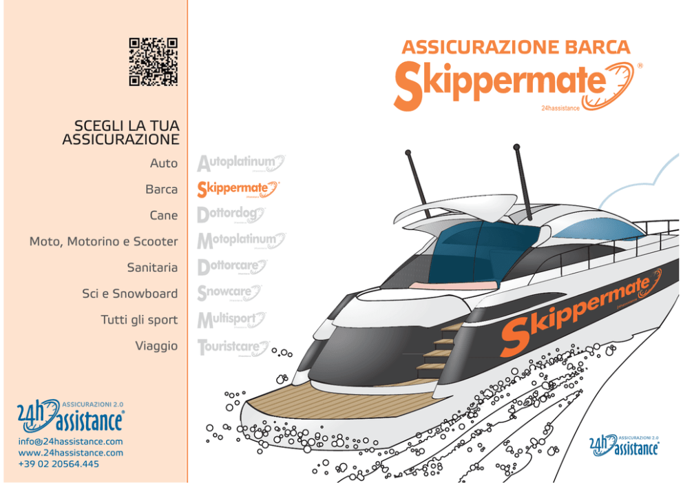 ASSICURAZIONE BARCA SCEGLI LA TUA ASSICURAZIONE Auto Barca Cane Moto, Motorino e Scooter Sanitaria Sci e Snowboard Tutti gli sport Viaggio [email protected] www.24hassistance.com +39 02 20564.445 www.24hassistance.com Il primo ed unico comparatore che ti permette di confrontare i preventivi delle principali compagnie assicurative ed acquistare direttamente online l'assicurazione corpi (kasko) per la tua barca. Skippermate ti fa risparmiare tempo e denaro: ti bastano 2 minuti per inserire i dati dell’imbarcazione e visualizzare in tempo reale le migliori offerte assicurative sul mercato. Dove si acquista Puoi acquistare Skippermate in modo semplice e veloce: online per telefono presso i nostri punti vendita: X MILANO - Via L. Canonica 72 X ROMA - Via C. Sigonio 6 X GENOVA - Sopravento, Molo Ponte Morosini, 15 X PORTO CERVO (OT) - Maxitender, Promenade du Port X PUNTA ALA (GR) - Yacht Diffusion, Loc. Porto X CASTIGLIONE DELLA PESCAIA (GR) - Yacht Diffusion, Molo di Levante X MARINA DI GROSSETO (GR) - Yacht Diffusion, Fronte Porto, 6/7 [email protected] www.24hassistance.com +39 02 20564.445 1 Inserisci i dati della tua barca 2 Confronta i preventivi delle migliori compagnie 3 Scegli l’assicurazione più adatta a te e alla tua barca