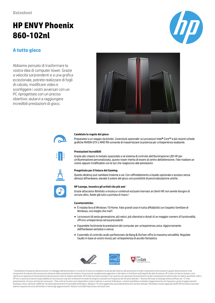 Datasheet HP ENVY Phoenix 860-102nl A tutto gioco Abbiamo pensato di trasformare la vostra idea di computer tower. Grazie a velocità sorprendenti e a una grafica eccezionale, potrete realizzare di fogli di calcolo, modificare video e sconfiggere i vostri avversari con un PC riprogettato con un preciso obiettivo: aiutarvi a raggiungere incredibili prestazioni di gioco. Cambiate le regole del gioco Preparatevi a un viaggio da brivido. L'overclock opzionale1 sui processori Intel® Core™ e più recenti schede grafiche NVIDIA GTX o AMD R9 consente di massimizzare la potenza per un'esperienza esaltante. Prestazioni incredibili Grazie allo chassis in metallo spazzolato e al sistema di controllo dell'illuminazione LED HP per un'illuminazione personalizzata, questo tower merita di essere al centro dell'attenzione. Fate risaltare un colore oppure modificatelo con le luci che reagiscono alle prestazioni. Progettato per il futuro del Gaming Questo desktop può cambiare insieme a voi. Con raffreddamento a liquido opzionale e accesso senza attrezzi all'hardware, elevate il potere del gioco con possibilità di personalizzazione uniche. HP Lounge, incontra gli artisti che più ami Grazie all'accesso illimitato a musica e contenuti esclusivi riservato ai clienti HP, non avrete bisogno di cercare altro. Avete già tutto a portata di mano.2 Caratteristiche: ● È iniziata l'era di Windows 10 Home. Fate grandi cose in tutta affidabilità con l'aspetto familiare di Windows, ora meglio che mai3! ● I processori di sesta generazione, più veloci, più silenziosi e dotati di un maggior numero di funzionalità, offrono un'esperienza senza precedenti. ● Espandete facilmente le prestazioni del computer per un'esperienza unica. Aggiornamento dell'hardware semplice e veloce. ● Il pannello di controllo audio perfezionato da Bang & Olufsen offre la massima versatilità. Regolate l'audio in base al vostro mood, per un'esperienza di ascolto fantastica. Cambiando la frequenza del processore e il voltaggio dell'alimentatore si rischia di: (i) ridurre la stabilità e la durata del sistema, del processore e di altri componenti; (ii) provocare il guasto del processore e dei componenti di sistema; (iii) provocare la riduzione delle prestazioni del sistema; (iv) provocare riscaldamento aggiuntivo o altri danni; e (v) influire sull'integrità dei dati di sistema. HP e Intel non hanno testato e non coprono con garanzia il funzionamento del processore oltre le relative specifiche. HP e Intel non hanno testato e non coprono con garanzia il funzionamento di altri componenti di sistema oltre le relative specifiche. Intel e HP non si assumono alcuna responsabilità se il processore e gli altri componenti di sistema vengono utilizzatii con frequenza e/o tensione alterata. 2 Accesso illimitato al catalogo Universal Music per 12 mesi gratuitamente. Accesso ad internet necessario. 3 Non tutte le funzioni sono disponibili in tutte le edizioni o versioni di Windows. I sistemi potrebbero richiedere l'aggiornamento e/o l'acquisto a parte di aggiornamenti hardware, driver, software o BIOS per sfruttare pienamente le funzionalità di Windows. Windows 10 viene aggiornato automaticamente ed è sempre attivato. Potrebbero essere applicate tariffe ISP ed essere necessari ulteriori requisiti nel corso del tempo in merito agli aggiornamenti. Visitare il sito Web http://www.microsoft.com. 1 Datasheet HP ENVY Phoenix 860-102nl Sistema operativo Windows 10 Home 64 Processore Intel® Core™ i7-6700 con scheda grafica Intel® HD 530 (3,4 GHz, fino a 4 GHz, cache 8 MB, 4 core) Linea di processore: Processore Intel® i7 Core™ Chipset Intel Z170 Memoria DDR4 8 GB (2 x 4 GB); Slot totali: 4 DIMM Memorizzazione dati SSD SATA da 128 GB; SATA da 1 TB (7200 rpm); Masterizzatore SuperMulti DVD vassoio ultra slim Dropbox1 Schermo Monitor LCD acquistabile separatamente. Per ulteriori informazioni, visitare il sito www.hp.com/eur/home-monitors Interfaccia di rete LAN Gigabit Ethernet 10/100/1000 integrata Connettività wireless Combo 802.11a/b/g/n/ac (1x1) e Bluetooth® 4.0 Video integrato: Scheda grafica Intel® HD 530 Dedicata: NVIDIA GeForce GTX 960 (2 GB di GDDR5 dedicata), Basato su architettura NVIDIA Maxwell™, 1 dual-link DVI; 1 HDMI; 3 DisplayPort Audio Bang & Olufsen Accessori inclusi Tastiera nera wireless; Mouse ottico wireless Caratteristiche Landing pad per: 2 USB 2.0; 2 USB 3.0; jack audio e lettore di schede di memoria; Soluzione di raffreddamento ad aria Porte 6 USB 2.0; 4 USB 3.0; 1 combo cuffia/microfono; 1 ingresso audio; 1 uscita audio; 1 ingresso microfono; 1 PCIe x1; 1 PCIe x16; 1 MiniCard; Lettore di schede di memoria 7 in 1; Alloggiamenti unità esterne: Uno occupato; Uno disponibile; Alloggiamenti unità interne: Due occupati; Uno disponibile Corrente Adattatore di alimentazione CA 500 W App HP HP Lounge; HP Phoenix Control Software Evernote; Netflix Assistenza e supporto McAfee LiveSafe™ 2 Ulteriori informazioni P/N: T1J56EA #ABZ UPC/EAN code: 889894923066 Peso 10,52 kg; Imballato: 13,4 kg Dimensioni 42 x 16,5 x 40,1 cm; Imballato: 49,9 x 28,5 x 52,1 cm Colore prodotto Design metallo gun Conformità al risparmio energetico Certificato ENERGY STAR®; Registrato EPEAT® Silver Paese di origine Fabbricata in Repubblica Ceca Garanzia Limitata a 1 anno su parti, manodopera, ritiro e servizio restituzioni; La copertura di garanzia del prodotto può essere prolungata fino a 3 anni; per ulteriori informazioni: www.hp.com/it/estensione-garanzia 25 GB di spazio di memorizzazione online gratis per sei mesi dalla data di registrazione. Per i dettagli completi e le condizioni d'uso, incluse le politiche di annullamento, visitare il sito web all'indirizzo www.dropbox.com. È necessario disporre di un servizio Internet (non incluso). 2 McAfee LiveSafe offerta prova gratuita 30 giorni (accesso a Internet richiesto. Primi 30 giorni inclusi, per gli aggiornamenti successivi è richiesto l'abbonamento). 1 Servizi e accessori compatibili* * Non