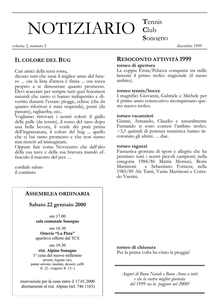 NOTIZIARIO volume 2, numero 2 IL COLORE DEL BUG Cari amici della terra rossa, dicono tutti che sarai il miglior anno del futuro ... ora la lista d'attesa è finita ... ora tocca proprio a te dimostrare quanto promesso. Devi scacciare per sempre tutti quei fenomeni naturali che tanto ci hanno indispettito e divertito durante l’estate: piogge, eclisse (che da quanto riferitoci è stata stupenda), ponti (da passare), tagliaerba, ecc.. Vogliamo ritrovare i nostri colori: il giallo delle palle (da tennis), il rosso del naso dopo una bella bevuta, il verde dei prati prima dell’ingrassatura, il colore del bug ... quello che ci hai tanto promesso e che non siamo mai riusciti ad immaginare. Oppure fare come Novecento che dall’alto della sua nave e della sua bravura mandò affanculo il maestro del jazz … cordiale saluto il comitato Tennis Club Sonogno dicembre 1999 RESOCONTO ATTIVITÀ 1999 torneo di apertura La coppia Ernia/Pelucca conquista tra mille lamenti il primo trofeo stagionale (il meno ambito). torneo tennis/bocce I magnifici Giovanni, Gabriele e Michele per il primo anno consecutivo riconquistano questo nuovo trofeo. torneo vacanzieri Gianni, Armando, Claudio e naturalmente Fernando si sono contesi l’ambito trofeo. ~3,5 quintali di potenza tennistica hanno incoronato gli ultimi … due. torneo ragazzi Fantastica giornata di sport e allegria che ha premiato tutti i nostri piccoli campioni; nella categoria 1984/86 Mattia Morasci, Boris Martinoni e Sebastiano Fornera; nella 1985/89 Ale Tami, Vania Martinoni e Corrado Vaerini. ASSEMBLEA ORDINARIA Sabato 22 gennaio 2000 ore 17.00 sala comunale Sonogno ore 18.30 Osteria “La Pista” aperitivo offerto dal TCS ore 19.30 rist. Alpino Sonogno 1° cena del nuovo millennio torneo di chiusura Per la prima volta ha vinto la pioggia! arrosto, legumi vari, patate arrosto, insalata, dessert, caffé fr. 22.- (ragazzi fr. 15.-) riservazioni per la cena entro il 17.01.2000 direttamente al rist. Alpino (tel. 746 1163) Auguri di Buon Natale e Buon Anno a tutti e che la vostra miglior giornata del 1999 sia la peggiore nel 2000! PROGRAMMA 2000 torneo di apertura singolo R1-R52 8 luglio 2000 (riserva 15.7.2000) torneo tennis/bocce terna fine luglio 2000 torneo vacanzieri doppio sorteggiato 5 agosto 2000 (12.8.2000) torneo ragazzi singolo (max. 132 cm) agosto 2000 torneo notturno a sorpresa agosto 2000 torneo di chiusura sociali a sorpresa 2 settembre 2000 (9.9.2000) IL TCS IN INTERNET Dai primi mesi del 2000, tra le circa 400 milioni di Web pages del Worldwide, troverete anche quelle del TCS. Forse non raggiungeremo quote di 25 milioni di visitatori al mese come sul sito del Football americano Superbowl ma le nostre stupende pagine tratteranno di: · informazioni generali · logistica · storia del club · attività annuali, con scheda personale di ogni socio con foto, dati anagrafici e non · comunicazioni e riservazioni on-line · sponsor e acquisti sponsor del progetto GROTTO REDORTA – SONOGNO fam. Pelucca C. Gilardi C. Martini MG. Foletta 745 4356 / 814 1162 745 4233 746 1355 CORSI DI TENNIS PER TUTTI Il TCS organizzerà anche il prossimo anno dei corsi estivi per ragazzi e adulti. Dopo l’ottima esperienza con il maestro Enea, che ci ha già garantito la sua presenza per il 2000, proporremo: · corsi gratuiti per i nuovi soci (iniziati) · corsi personalizzati (privati/gruppi) · corsi a gruppi TCS: un piccolo club dal grande cuore (EP) COMUNICARE In ogni comunicazione sono presenti due proposizioni, una oggettiva e una relazionale. Spesso questi concetti ci portano ad avere difficoltà con il partner chiunque esso sia, ma quanto più intimo tanto meglio. Supponiamo che una donna chieda al marito: ”Questa minestra l’ho fatta in maniera nuova. Ti piace?”. Se gli piace risponderà: “Sì” e lei sarà contenta. Se invece non gli piace e non teme di deluderla dovrebbe dire “No”, a livello relazionale dovrebbe dire “Sì” per non ferirla. Cosa dirà dunque? La sua risposta non può essere “Ni” perché è solo una battuta scherzosa. Egli risponderà in qualche modo per togliersi dai guai, dicendo magari: “Ha un sapore interessante” nella speranza che lei capisca. Conviene spesso seguire l’esempio di un nostro amico, la cui moglie di ritorno dalla luna di miele, gli mise sul tavolo un bel mattino una scatola di Corn Flakes come prima colazione, supponendo in buona fede (a livello relazionale) ma erroneamente (a livello oggettivo) che il marito li avrebbe mangiati volentieri. Non volendola ferirla, mandò giù quella roba. Da brava moglie, ancor prima che finisse quella scatola ne aveva già comprata un’altra. Oggi, dopo 15 anni, ha abbandonato la speranza di farle capire con tatto che lui li detesta, i Corn Flakes. La reazione della moglie sarebbe inimmaginabile … dedicato a tutti