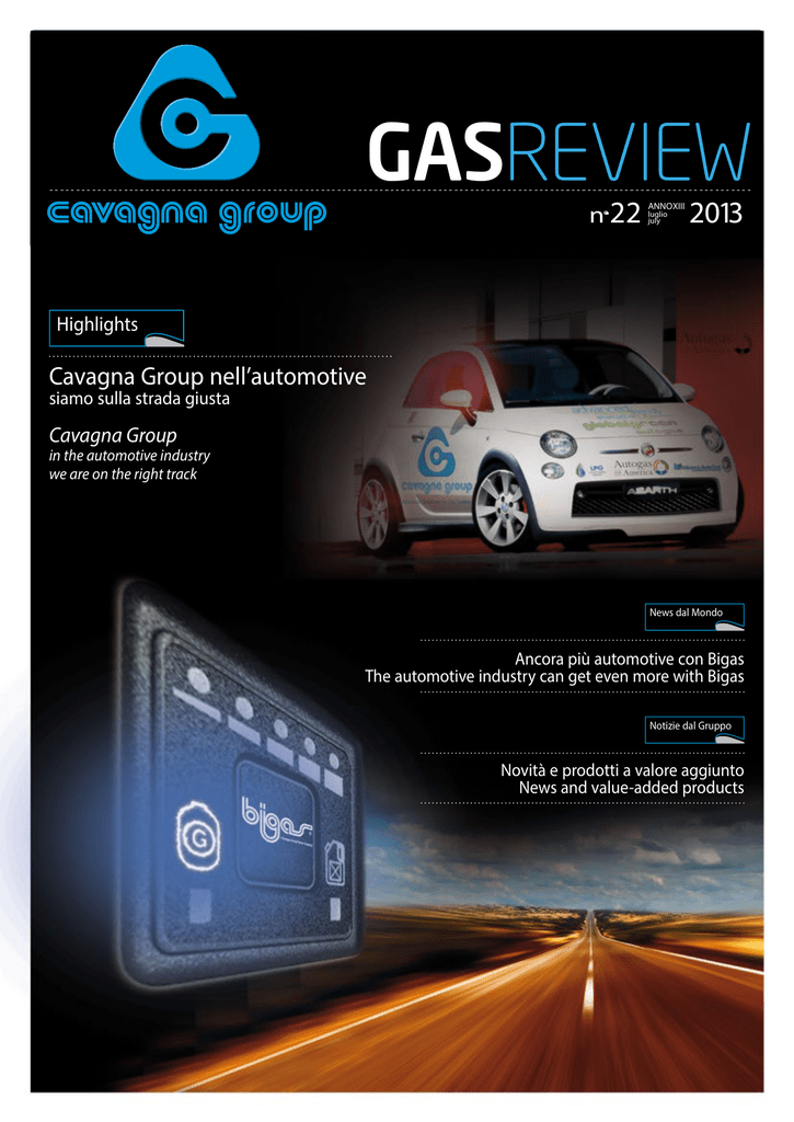 GASREVIEW n° 22 ANNO XIII luglio july 2013 Highlights Cavagna Group nell’automotive siamo sulla strada giusta Cavagna Group in the automotive industry we are on the right track News dal Mondo Ancora più automotive con Bigas The automotive industry can get even more with Bigas Notizie dal Gruppo Novità e prodotti a valore aggiunto News and value-added products Cavagna Group fa notizia! Cavagna Group makes the news! E’ nata la nostra newsletter elettronica: uno strumento dinamico e interattivo che porta on line su PC, tablet e smartphone le informazioni sul Gruppo Cavagna. La Newsletter si affianca a Gasreview, che da questo numero diventa semestrale anziché annuale, per rafforzare ulteriormente il dialogo con tutti i nostri interlocutori: clienti fidelizzati e prospect, rete vendita e distributori, associazioni e istituzioni, centri di ricerca e università. E naturalmente tutti i dipendenti e collaboratori del nostro team. Our electronic newsletter is launched.This dynamic and interactive tool gives information on line about Cavagna Group. Available on pc, tablet and smartphone. The bi-annual newsletter that has recently joined Gasreview, further strengthens communication with all our stakeholders, established customers and prospects, sales managers, suppliers, associations, institutions, research centers, universities and all the employees and collaborators of our team. NEWSLETTER 06/13 With Bigas, we can give the automotive industry even more In February 2013, the Cavagna Group drew up a corporate and business alliance with Bigas. This strategic partnership allows us to provide the automotive market with new highly efficient and competitive products for OEM equipment and converting vehicles to LPG or Natural Gas. Through this alliance, we plan to develop new products that integrate with each other both in terms of technology and marketing. Our aim is to transform this synergy into a new market benchmark. Read More>>> Our Newsletter A communication tool in keeping with the Group’s care and attention towards the market “The Cavagna Group is expanding ever more successfully on international markets. Those markets increasingly more often appreciate the two values that have always guided the Group’s care and attention towards its customers: the high quality of its gas control solutions, and the service it provides, which complies with the same quality standards. The Cavagna Group is expanding and diversifying its offer in its consolidated area of specialization and core business, and is consequently proving to be one of the most dynamic and proactive industrial companies in its sector worldwide. We have therefore created this newsletter to reinforce our dialogue with all the players on our market during this important period of growth. We aim to take stock of all the activities that characterize the Group’s wide-ranging operations. We hope you appreciate this tool for its essential form and practical contents.” Davide Cavagna (CEO) Globalgreen and GreenGear play starring roles in Atlanta The Cavagna Group’s presence at the Southeastern Convention & International Propane Expo in Atlanta from 13 to 15 April confirmed the enormous market interest - in America in particular - in LPG appliances and the products the Group offers to convert vehicles to alternative fuels. The big party the Cavagna Group organized and held at the most important aquarium in the world was an event within the event, which confirmed the Group’s style and prestige. Read More>>> A Video for 100 million Americans The Cavagna Group will star in “21st Century Business”, a television series that presents the case histories of entrepreneurial success stories to the North American public. It targets an audience of over one hundred million viewers, and this number is growing exponentially thanks to an international TV network, which also reaches Europe (about 150 million contacts), and thanks to all the various web and new media channels. “21st Century Business” is also aimed at universities and research centres, and is broadcast on Bloomberg TV, CNBC and the campuses of Princeton, Georgetown, George Tech, New York University, the University of Texas, the University of Florida, Dartmouth College and DePaul. Watch The Video>>> LPG Appliances for a friendlier and greener life The “Green Gear” project introduced by the Cavagna Group only a few years ago, aims to offer consumers and professionals’ alternative, clean and cost effective energy solutions by using LPG powered appliances, preferring them to equipment powered by traditional fuels such as gasoline or diesel. A real “green revolution”, oriented towards low energy consumption and cleaner emissions, to improve the quality of life both indoors and out. Read More>>> www.cavagnagroup.com www.cavagnagroup.com One Billion Users Who is the world’s leading manufacturer in advanced solutions for gas control? There is only one answer: Cavagna Group. Since 1949 our Group has been supplying industries and consumers worldwide, to become today’s leading manufacturer of equipment and fittings for compressed gases, gas storage and control. With eight vertically integrated production units in Italy, seven others spread on five continents and a distribution network covering over 124 countries throughout the world, we offer only the best, most reliable products and dynamic services to our customers. GAS REVIEW 23Via / LUGLIO - JULY Cavagna Group Spa Statale 11,/ 2013 25011 Ponte San Marco, Brescia, Italy Phone +39 0309663111 [email protected] 3 Advanced Solutions for gas control IN PRIMO PIANO Cavagna Group nell’automotive: siamo sulla strada giusta Cavagna Group ha conquistato un posizionamento che lo pone come una delle principali realtà internazionali nel settore, sia per le valvole di prima installazione come nell’aftermarket Da circa cinque anni Cavagna Group ha intensificato il suo impegno nel settore dell’automotive, occupandosi in part