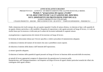 ANNO SCOLASTICO 2014/2015 PROGETTI P.O.F. : ATTIVITA’ DI ORIENTAMENTO PER ALUNNI DI SCUOLA MEDIA Modulo 1: “preparazione del sapone a freddo” D.V.R. (DOCUMENTO DI VALUTAZIONE DEL RISCHIO) D.P.I. (DISPOSITIVI DI PROTEZIONE INDIVIDUALI) ELENCO PRODOTTI DA UTILIZZARE UTILIZZO PRODOTTO – RISCHIO – PRECAUZIONE D’USO - QUANTITA’ – TEMPO DI ESPOSIZIONE – PERIODICITA’ Dalla valutazione dei rischi emerge che, per quanto riguarda il rischio di natura chimica, in relazione al tipo e alle quantità di un agente chimico pericoloso e alle modalità e frequenza di esposizione a tale agente presente sul luogo di lavoro, vi è solo un rischio basso per la sicurezza e irrilevante per la salute dei lavoratori adottando le seguenti misure: a) progettazione e organizzazione dei sistemi di lavorazione sul luogo di lavoro; b) fornitura di attrezzature idonee per il lavoro specifico e relative procedure di manutenzione adeguate; c) riduzione al minimo del numero di lavoratori che sono o potrebbero essere esposti; d) riduzione al minimo della durata e dell’intensità dell’esposizione; e) misure igieniche adeguate; f) riduzione al minimo della quantità di agenti presenti sul luogo di lavoro in funzione delle necessità della lavorazione; g) metodi di lavoro appropriati comprese le disposizioni che garantiscono la sicurezza nella manipolazione, nell’immagazzinamento e nel trasporto sul luogo di lavoro di agenti chimici pericolosi nonché dei rifiuti che contengono detti agenti chimici. 1 a) progettazione e organizzazione dei sistemi di lavorazione sul luogo di lavoro: Il sapone si può preparare dal grasso animale o da oli vegetali; entrambi sono costituiti da TRIGLICERIDI, esteri di acidi carbossilici che hanno un peso molecolare elevato, e contengono glicerolo. Gli acidi principali contenuti nei grassi animali e negli oli vegetali possono essere ricavati dai trigliceridi naturali per idrolisi alcalina. La reazione chimica tra i trigligeridi naturali e l’idrossido di sodio (o di potassio) viene comunemente chiamata reazione di “SAPONIFICAZIONE”; dalla reazione si formano glicerina (o glicerolo) ed i Sali di sodio (o di potassio) degli acidi carbossilici. Quest’ultimi hanno un potere detergente e sgrassante e sono comunemente chiamati “SAPONI”. I principali sono: sale sodico dell’acido oleico (contenuto principalmente nell’olio di oliva), sale sodico dell’acido palmitico (contenuto principalmente nell’olio di palma) sale sodico dell’acido laurico e dell’acido miristico (contenuto principalmente nell’olio di cocco) ecc…. I metodi classici per fare il sapone sono due: a freddo (temperatura di circa 40 °C ) o a caldo (temperatura di ebollizione della miscela di oli utilizzata). Il metodo a caldo è più veloce, ma produce un sapone più rustico ed irregolare, e comporta un RISCHIO di lavorazione più alto: al rischio potenziale di ustione chimica provocabile dalla soda si deve aggiungere il rischio di ustione da possibile proiezione di liquidi bollenti e corrosivi. Perciò è stato scelto Il metodo a freddo che comporta un RISCHIO di lavorazione minore, sostanzialmente limitato al contatto accidentale con la soda. Rischio eliminabile utilizzando una dettagliata procedura di lavorazione e fornendo gli alunni i Dispositivi di protezione Individuali. I gruppi di alunni di scuola media lavoreranno, a turno e saranno suddivisi per un massimo di n° 6 per bancone, dopo avere ricevuto dettagliate informazioni teoriche sulla metodologia di preparazione del sapone, sui rischi potenziali delle lavorazioni da eseguire e sull’uso obbligatorio dei dispositivi di protezione individuali che verranno loro consegnati. Ad ogni gruppo di 6 alunni di scuola media saranno affiancati n° 2 alunni di 3^ A Chimici, già esperti nella preparazione del sapone con tale metodo. 2 Per ogni bancone di lavorazione vigilerà un docente, o l’assistente tecnico, che munito, dei dispositivi di protezione individuali, interverrà nelle fasi di lavorazione più delicate. b) fornitura di attrezzature idonee per il lavoro specifico e relative procedure di manutenzione adeguate: Tutto il materiale necessario per la lavorazione sarà disponibile sul banco di lavoro o fornito al momento dall’assistente tecnico per evitare che gli alunni debbano spostarsi: - D.P.I. : camice di lavoro bianco, con abbottonatura davanti, lungo fino ai ginocchi, e munito di elastico ai polsini, guanti monouso al nitrile, occhiali di protezione; - bilancia tecnica per pesare separatamente, in appositi contenitori, gli oli indicati nella ricetta di preparazione, l’acqua deionizzata e l’idrossido di sodio; - piastra elettrica termostatata per scaldare la miscela di oli a 40 °C; - pentolino in acciaio inox per contenere gli oli e preparare il sapone; - N° 2 termometri per controllare la temperatura degli oli e della soda; - N° 1 becher da 600 mL per pesare l’acqua deionizzata (150 g), e lentamente, poco per volta, sciogliere la soda agitando con un agitatore, indossando camice, guanti e occhiali di protezione; ATTENZIONE: la soda provoca ustioni a contatto della pelle e la dissoluzione è fortemente esotermica (la temperatura del sitema può raggiungere 80 °C); - N° 1 bacinella o cristallizzatore contenente acqua fredda per raffreddare il becher contenente la soluzione di idrossido di sodio fino a quanto la temperatura si porti a 40 ° C; - Un paletta di legno per miscelare gli oli man mano che si versa lentamente, poco per volta, la soluzione di idrossido di sodio; - Un frullatore ad immersione per facilitare la reazione di saponificazione. Il frullatore va appoggiato saldamente sul fondo della pentola contenente la miscela di oli e soda e, solo dopo averlo poggiato al fondo azionare l’interruttore per frullare per circa 15 sec. fermarsi per circa 45 secondi e ripetere l’operazione nello stesso modo. Si smette di frullare dopo circa 20 min. ATTENZIONE: non azionare mai il frullatore in superficie o al di fu