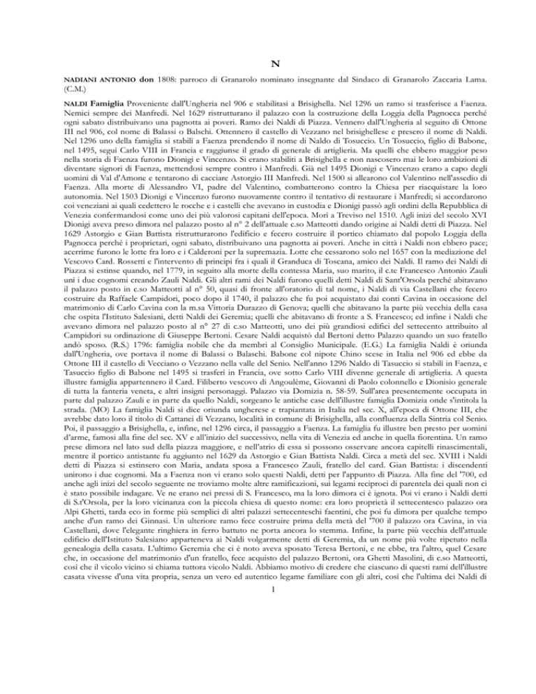 N NADIANI ANTONIO don 1808: parroco di Granarolo nominato insegnante dal Sindaco di Granarolo Zaccaria Lama. (C.M.) Famiglia Proveniente dall'Ungheria nel 906 e stabilitasi a Brisighella. Nel 1296 un ramo si trasferisce a Faenza. Nemici sempre dei Manfredi. Nel 1629 ristrutturano il palazzo con la costruzione della Loggia della Pagnocca perché ogni sabato distribuivano una pagnotta ai poveri. Ramo dei Naldi di Piazza. Vennero dall'Ungheria al seguito di Ottone III nel 906, col nome di Balassi o Balschi. Ottennero il castello di Vezzano nel brisighellese e presero il nome di Naldi. Nel 1296 uno della famiglia si stabilì a Faenza prendendo il nome di Naldo di Tosuccio. Un Tosuccio, figlio di Babone, nel 1495, seguì Carlo VIII in Francia e raggiunse il grado di generale di artiglieria. Ma quelli che ebbero maggior peso nella storia di Faenza furono Dionigi e Vincenzo. Si erano stabiliti a Brisighella e non nascosero mai le loro ambizioni di diventare signori di Faenza, mettendosi sempre contro i Manfredi. Già nel 1495 Dionigi e Vincenzo erano a capo degli uomini di Val d'Amone e tentarono di cacciare Astorgio III Manfredi. Nel 1500 si allearono col Valentino nell'assedio di Faenza. Alla morte di Alessandro VI, padre del Valentino, combatterono contro la Chiesa per riacquistare la loro autonomia. Nel 1503 Dionigi e Vincenzo furono nuovamente contro il tentativo di restaurare i Manfredi; si accordarono coi veneziani ai quali cedettero le rocche e i castelli che avevano in custodia e Dionigi passò agli ordini della Repubblica di Venezia confermandosi come uno dei più valorosi capitani dell'epoca. Morì a Treviso nel 1510. Agli inizi del secolo XVI Dionigi aveva preso dimora nel palazzo posto al n° 2 dell'attuale c.so Matteotti dando origine ai Naldi detti di Piazza. Nel 1629 Astorgio e Gian Battista ristrutturarono l'edificio e fecero costruire il portico chiamato dal popolo Loggia della Pagnocca perché i proprietari, ogni sabato, distribuivano una pagnotta ai poveri. Anche in città i Naldi non ebbero pace; acerrime furono le lotte fra loro e i Calderoni per la supremazia. Lotte che cessarono solo nel 1657 con la mediazione del Vescovo Card. Rossetti e l'intervento di principi fra i quali il Granduca di Toscana, amico dei Naldi. Il ramo dei Naldi di Piazza si estinse quando, nel 1779, in seguito alla morte della contessa Maria, suo marito, il c.te Francesco Antonio Zauli unì i due cognomi creando Zauli Naldi. Gli altri rami dei Naldi furono quelli detti Naldi di Sant'Orsola perché abitavano il palazzo posto in c.so Matteotti al n° 50, quasi di fronte all'oratorio di tal nome, i Naldi di via Castellani che fecero costruire da Raffaele Campidori, poco dopo il 1740, il palazzo che fu poi acquistato dai conti Cavina in occasione del matrimonio di Carlo Cavina con la m.sa Vittoria Durazzo di Genova; quelli che abitavano la parte più vecchia della casa che ospita l'Istituto Salesiani, detti Naldi dei Geremia; quelli che abitavano di fronte a S. Francesco; ed infine i Naldi che avevano dimora nel palazzo posto al n° 27 di c.so Matteotti, uno dei più grandiosi edifici del settecento attribuito al Campidori su ordinazione di Giuseppe Bertoni. Cesare Naldi acquistò dal Bertoni detto Palazzo quando un suo fratello andò sposo. (R.S.) 1796: famiglia nobile che da membri al Consiglio Municipale. (E.G.) La famiglia Naldi è oriunda dall'Ungheria, ove portava il nome di Balassi o Balaschi. Babone col nipote Chino scese in Italia nel 906 ed ebbe da Ottone III il castello di Vecciano o Vezzano nella valle del Senio. Nell'anno 1296 Naldo di Tasuccio si stabilì in Faenza, e Tasuccio figlio di Babone nel 1495 si trasferì in Francia, ove sotto Carlo VIII divenne generale di artiglieria. A questa illustre famiglia appartennero il Card. Filiberto vescovo di Angoulème, Giovanni di Paolo colonnello e Dionisio generale di tutta la fanteria veneta, e altri insigni personaggi. Palazzo via Domizia n. 58-59. Sull'area presentemente occupata in parte dal palazzo Zauli e in parte da quello Naldi, sorgeano le antiche case dell'illustre famiglia Domizia onde s'intitola la strada. (MO) La famiglia Naldi si dice oriunda ungherese e trapiantata in Italia nel sec. X, all'epoca di Ottone III, che avrebbe dato loro il titolo di Cattanei di Vezzano, località in comune di Brisighella, alla confluenza della Sintria col Senio. Poi, il passaggio a Brisighella, e, infine, nel 1296 circa, il passaggio a Faenza. La famiglia fu illustre ben presto per uomini d’arme, famosi alla fine del sec. XV e all’inizio del successivo, nella vita di Venezia ed anche in quella fiorentina. Un ramo prese dimora nel lato sud della piazza maggiore, e nell’atrio di essa si possono osservare ancora capitelli rinascimentali, mentre il portico antistante fu aggiunto nel 1629 da Astorgio e Gian Battista Naldi. Circa a metà del sec. XVIII i Naldi detti di Piazza si estinsero con Maria, andata sposa a Francesco Zauli, fratello del card. Gian Battista: i discendenti unirono i due cognomi. Ma a Faenza non vi erano solo questi Naldi, detti per l'appunto di Piazza. Alla fine del '700, ed anche agli inizi del secolo seguente ne troviamo molte altre ramificazioni, sui legami reciproci di parentela dei quali non ci è stato possibile indagare. Ve ne erano nei pressi di S. Francesco, ma la loro dimora ci è ignota. Poi vi erano i Naldi detti di S.t'Orsola, per la loro vicinanza con la piccola chiesa di questo nome: era loro proprietà il settecentesco palazzo ora Alpi Ghetti, tarda eco in forme più semplici di altri palazzi settecenteschi faentini, che poi fu dimora per qualche tempo anche d'un ramo dei Ginnasi. Un ulteriore ramo fece costruire prima della metà del '700 il palazzo ora Cavina, in via Castellani, dove l'elegante ringhiera in ferro battuto ne porta ancora lo stemma. Infine, la parte più vecchia dell'attuale edificio dell'Istituto Salesiano apparteneva ai Naldi volgarmente detti di Geremia, da un nome più volte ripetuto nella gene