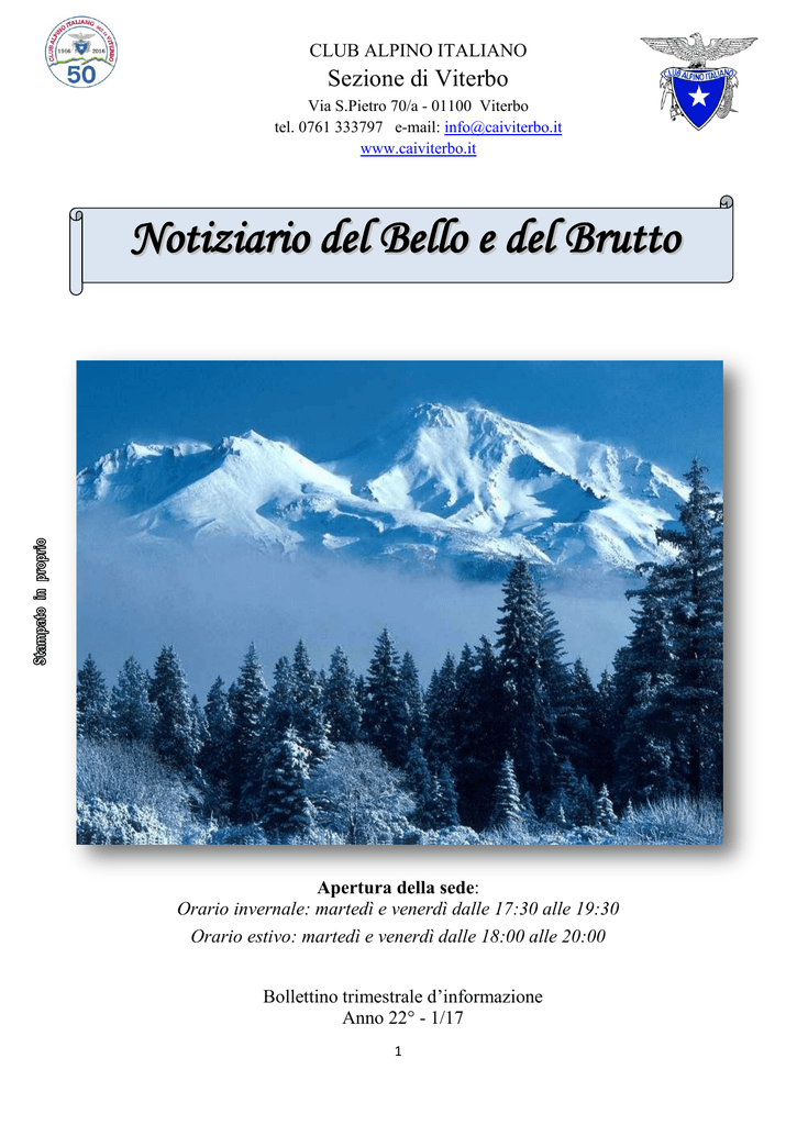 CLUB ALPINO ITALIANO Sezione di Viterbo Via S.Pietro 70/a - 01100 Viterbo tel. 0761 333797 e-mail: [email protected] www.caiviterbo.it Notiziario del Bello e del Brutto Apertura della sede: Orario invernale: martedì e venerdì dalle 17:30 alle 19:30 Orario estivo: martedì e venerdì dalle 18:00 alle 20:00 Bollettino trimestrale d’informazione Anno 22° - 1/17 1 Programma sezionale Escursioni per eventuali aggiornamenti o variazioni consultare sempre il sito web del CAI di Viterbo: www.caiviterbo.it D 08/01/2017 Campo dell’Osso-Campo Secco-Valle dell’Autore (RM) Discesa per la Valle Maiura. Ritorno per la valle dell’Autore e le Vedute fino al punto di partenza. Gita di non particolari difficoltà tecniche anche se abbastanza lunga. Difficoltà EAI (ciaspole/sci escursionismo). Dislivello 450 m circa. Tempo di percorrenza 6,30 ore circa soste escluse. Pranzo al sacco. Partenza da Piazzale Romiti ore 6:30 con mezzi propri (pullman se si raggiunge un numero minimo di partecipanti). Accompagnatori: D.diE. M. Di Carlo (3357125369); ORTAM I. Berni (3488861919); D. di E. A. Costantini (3333260196) D 15/01/2017 Mt. La Torricella - Prato Capito - Campo Felice (AQ) Dal valico della Chiesuola per cresta sotto La Torricella. Sulla base delle condizioni meteo e della neve si deciderà se arrivare in vetta o fare un percorso sui pendii circostanti. Ritorno per la valle del Morretano. Giro semplice con alcuni punti più tecnici. Difficoltà EAI (ciaspole/sci escursionismo). Dislivello 500 m circa. Tempo di percorrenza 6 ore circa soste escluse. Pranzo al sacco. Partenza da Piazzale Romiti ore 6:30 con mezzi propri (pullman se si raggiunge un numero minimo di partecipanti). Accompagnatori: D.diE. M. Di Carlo (3357125369); ORTAM A. Di Grottole (3473459355); D.diE. M. Fanelli (3491060544) S 21/01/2017 Castel d’Asso (VT) Passeggiata a velocità controllata con passaggio a fianco della necropoli rupestre su sterrati battuti bassa difficoltà. Percorso ad anello. Difficoltà TC/TC. Dislivello m ca. 350/450, Km ca. 35/45, tempo 3.30 h circa escluse le soste. Pranzo al sacco. Partenza Bar Cinema Lux (stazione Porta Fiorentina) ore 8.30. Casco obbligatorio. Accompagnatori: D.di CE. G. Sisti (3288922384); D.di CE. D. Meschini (3297922653) D 22/01/2017 Pigelleto e miniere del Siele (GR) L'escursione si snoda all'interno della Riserva Naturale del Pigelleto che comprende la parte più alta di una antica foresta di abeti. Il percorso inizia ad una quota di 810 mt, sale fino a toccare Poggio Pampagliano ( 947 mt ), la cima più alta del rilievo, poi riscende fino al sito minerario del Siele (una 2 delle più importanti miniere di mercurio, oggi chiusa) a 690 mt. Dopo aver visitato la miniera il percorso risale fino al Poggio Roccone ( 794 mt ) e poi scende fino ad arrivare alla zona più ricca di abeti ed infine alla direzione della miniera. Oltre alla foresta, sono importanti i panorami sulla Valle del Paglia, l'Amiata e i monti di Castell'Azzara. Difficoltà E, Dislivello m ca. 350, tempo 5 h circa escluse le soste, pranzo al sacco. Partenza Piazzale Romiti ore 8.00, con mezzi propri (pullman se si raggiunge un numero minimo di partecipanti). Accompagnatori: AE M. Olimpieri (333.5345224); ORTAM A. Di Grottole (3473459355); A.D.di E. Olivieri Annamaria D 29/01/2017 Monte di Cambio (RI) Da Fonte Nova per il Rif. Maiolica e quindi alla vetta. Itinerario abbastanza semplice con primo tratto ripido nel bosco e successivamente ampi pendii aperti e non esposti. La parte finale, fin su la croce, in caso di presenza di ghiaccio, percorribile solo con ramponi al seguito. Difficoltà EAI (ciaspole/sci escursionismo). Dislivello 600 m circa. Tempo di percorrenza 6 ore circa soste escluse. Pranzo al sacco. Partenza da Piazzale Romiti ore 6:30 con mezzi propri (pullman se si raggiunge un numero minimo di partecipanti). Accompagnatori: D.di E. M. Di Carlo (3357125369); D.di E. P. Pickl (3338128438); D.di E. G. Ranelli (3286677629) D 05/02/2017 Campaegli (RM) Escursione semplice, ad anello nel bellissimi boschi dei Simbruini. Dal piazzale di Campaegli, percorso su strada forestale fino al Vallone della Lepre; si risale il Vallone fino a Campo Buffone. Ritorno sulla sterrata della valle di Campaegli. Difficoltà EAI (ciaspole/sci escursionismo). Dislivello 400 m circa. Tempo di percorrenza 5 ore circa soste escluse. Pranzo al sacco. Partenza da Piazzale Romiti ore 6:30 con mezzi propri (pullman se si raggiunge un numero minimo di partecipanti). Accompagnatori: ORTAM A. Di Grottole (3473459355); ORTAM I. Berni (3488861919); D.di E. A. Costantini (3333260196) S 18/02/2017 Corviano e Monte Casoli (VT) Passeggiata a velocità controllata a agglomerato etrusco di Corviano con la possibilità di arrivare alla Riserva Naturale di Monte Casoli seguendo parte del sentiero CAI n° 125. Percorso ad anello. Difficoltà MC/MC, Dislivello m ca. 850, Km ca. 41, tempo 3.30 h circa escluse le soste. Pranzo al sacco. Partenza Bar Cinema Lux (stazione Porta Fiorentina) ore 8.30. Casco obbligatorio. Accompagnatori: D.di CE. G. Sisti (3288922384); D.di CE. S. Moretti (3472547715) . 3 D 19/02/2017 Da Monteromano a Tarquinia (VT) Si parte dal paese di Monteromano e si scende passando per l’Università Agraria ed il rudere del Castellaccio fino a costeggiare la valle del Marta e la diga. Si sale fino alla Civita con visita all’Ara della Regina e quindi la Chiesa rupestre di Santa Reparata. Si scende al Fosso San Savino e si risale fino all’acquedotto medievale alle porte di Tarquinia. Difficoltà E. Dislivello 400 m circa. Percorso di circa 20 km. Tempo di percorrenza 7 ore circa soste escluse. Partenza da Piazzale Romiti ore 7:00 con mezzi propri (pullman se si raggiunge un numero minimo di partecipanti). Pranzo al sacco. Accompagnatori: ASE A. Selbmann (3277566476); D.di E. M. Fanelli (3491060544); A.D.di E. S. Pestelli (3807122718) D 26/02/2017 Castelluccio di Norcia Escursione ad anello, semplice e piacevole in un luogo bellissimo. D