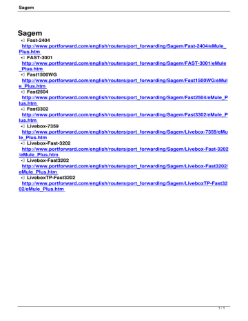 Sagem Sagem • Fast-2404 http://www.portforward.com/english/routers/port_forwarding/Sagem/Fast-2404/eMule_ Plus.htm • FAST-3001 http://www.portforward.com/english/routers/port_forwarding/Sagem/FAST-3001/eMule _Plus.htm • Fast1500WG http://www.portforward.com/english/routers/port_forwarding/Sagem/Fast1500WG/eMul e_Plus.htm • Fast2504 http://www.portforward.com/english/routers/port_forwarding/Sagem/Fast2504/eMule_P lus.htm • Fast3302 http://www.portforward.com/english/routers/port_forwarding/Sagem/Fast3302/eMule_P lus.htm • Livebox-7359 http://www.portforward.com/english/routers/port_forwarding/Sagem/Livebox-7359/eMu le_Plus.htm • Livebox-Fast-3202 http://www.portforward.com/english/routers/port_forwarding/Sagem/Livebox-Fast-3202 /eMule_Plus.htm • Livebox-Fast3202 http://www.portforward.com/english/routers/port_forwarding/Sagem/Livebox-Fast3202/ eMule_Plus.htm • LiveboxTP-Fast3202 http://www.portforward.com/english/routers/port_forwarding/Sagem/LiveboxTP-Fast32 02/eMule_Plus.htm 1/1