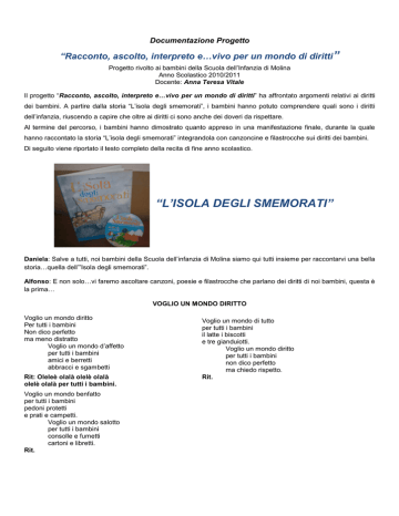 Documentazione Progetto “Racconto, ascolto, interpreto e…vivo per un mondo di diritti” Progetto rivolto ai bambini della Scuola dell’Infanzia di Molina Anno Scolastico 2010/2011 Docente: Anna Teresa Vitale Il progetto “Racconto, ascolto, interpreto e…vivo per un mondo di diritti” ha affrontato argomenti relativi ai diritti dei bambini. A partire dalla storia “L’isola degli smemorati”, i bambini hanno potuto comprendere quali sono i diritti dell’infanzia, riuscendo a capire che oltre ai diritti ci sono anche dei doveri da rispettare. Al termine del percorso, i bambini hanno dimostrato quanto appreso in una manifestazione finale, durante la quale hanno raccontato la storia “L’isola degli smemorati” integrandola con canzoncine e filastrocche sui diritti dei bambini. Di seguito viene riportato il testo completo della recita di fine anno scolastico. “L’ISOLA DEGLI SMEMORATI” Daniela: Salve a tutti, noi bambini della Scuola dell’infanzia di Molina siamo qui tutti insieme per raccontarvi una bella storia…quella dell’”Isola degli smemorati”. Alfonso: E non solo…vi faremo ascoltare canzoni, poesie e filastrocche che parlano dei diritti di noi bambini, questa è la prima… VOGLIO UN MONDO DIRITTO Voglio un mondo diritto Per tutti i bambini Non dico perfetto ma meno distratto Voglio un mondo d’affetto per tutti i bambini amici e berretti abbracci e sgambetti Rit: Oleleè olalà olelè olalà olelè olalà per tutti i bambini. Voglio un mondo benfatto per tutti i bambini pedoni protetti e prati e campetti. Voglio un mondo salotto per tutti i bambini consolle e fumetti cartoni e libretti. Rit. Voglio un mondo di tutto per tutti i bambini il latte i biscotti e tre gianduiotti. Voglio un mondo diritto per tutti i bambini non dico perfetto ma chiedo rispetto. Rit. Gaia: C’era una volta un’isola deserta in mezzo al mare… Francesca: Su questa isola c’erano tante piante e tanti animali: volpi, lepri, cerbiatti, farfalle, api e bruchi… Gabriele: Ma un giorno sull’isola arrivarono nove vecchietti, scappati dal loro Paese perché c’era la guerra. Alfonso: C’era Lenzo il pescatore e Racna la tessitrice… Chrystian: Farin il mugnaio e Trappo il cacciatore… Vincenzo D.: Chiodo il falegname e Solco il contadino… Miriam: Greta che impastava l’argilla e Latha che pascolava le capre. Daniela: Ci siamo dimenticati la persona più importante…il grande mago Lucanor. Aldo: Aspettate!...mancano ancora: il gabbiano Uà, il cane Corricorri e il pesce Splash. Alfonso: Una notte Lucanor fece un brutto sogno: il mare era in tempesta e c’erano dei bambini in pericolo. Gaia: Si alzò dal letto, il cuore gli batteva forte forte… Francesca: Guardò dalla finestra, ma tutto era tranquillo. Poi chiamò Corricorri, Uà e Splash per andare a vedere se davvero c’erano dei bambini in pericolo da aiutare. Chrystian: Il gabbiano Uà e il pesce Splash di corsa andarono a vedere cosa stava succedendo…c’era davvero la tempesta e dei bambini in pericolo. Daniela: Il capitano, per mettere in salvo i bambini, li fece salire su una piccola barca… Gabriele: Ma i genitori erano preoccupati, non volevano mandarli da soli…ma sulla barca non c’era spazio per nessun altro… Vincenzo D.: …nemmeno per uno spillo! Aldo: I bambini più grandi di sarebbero presi cura dei bambini più piccoli. Miriam: Ad un certo punto la piccola Maria vide il pesce Splash… Vincenzo D.: …e Nico vide il gabbiano Uà. Alfonso: Sapete cosa stavano facendo Uà e Splash?...avevano preso le funi della barchetta per portare i bambini sull’isola. Gaia: Intanto Lucanor e Corricorri guardavano all’orizzonte e ad un certo punto videro una barchetta con sopra dei bambini. Francesca: Allora Lucanor mandò Corricorri ad avvisare gli abitanti dell’isola per andare ad accogliere i bambini e lui, ormai tranquillo, se ne andò a riposare. Daniela: Il mago Lucanor si addormentò e sognò tutto quello che devono fare i bambini. Alfonso: Lo potete capire ascoltando questa canzone. AM BLUM BLEM Rit. Am blum blem sicut erem blem Am blum blem sicut erem blem Am blum blem sicut erem blem Am blum blem sicut erem blem Tutte le voci Tutte le voci del verbo giocare Tutte le voci Tutte le voci io voglio cantare. Saltare lanciare cliccare rotolare Nascondersi correre fare raccontare Tutte le voci Tutte le voci io voglio cantare. Rit. Tutte le voci Tutte le voci del verbo creare Tutte le voci Tutte le voci io voglio cantare. Sognare inventare poetare immaginare Volare dipingere e fantasticare Tutte le voci Tutte le voci io voglio cantare. Rit. Tutte le voci Tutte le voci del verbo abbracciare Tutte le voci Tutte le voci io voglio cantare. Sorridere amare ballare accarezzare Baciare salutare e mai dimenticare Tutte le voci Tutte le voci io voglio cantare. Rit. Daniela: I bambini arrivarono sull’isola con l’aiuto di Splash e di Uà. Alfonso: Lì c’erano otto vecchietti sulla spiaggia che cercavano di capire cosa stava succedendo. Chrystian: Quando gli smemorati videro i bambini non sapevano cosa fossero…alcuni pensavano che erano degli animali… Miriam: Delle strane scimmiette… Gabriele: I bambini non riuscivano a capire perché quei vecchietti, simili ai loro nonni, stavano lì fermi senza fare niente. Daniela: Ve lo dico io il perché…quei vecchietti non si ricordavano nulla, nemmeno di essere stati bambini…erano degli smemorati! Alfonso: Allora decisero di chiedere aiuto a Lucanor…Corricorri arrivò di corsa, con le orecchie al vento, e disse agli smemorati di ospitare i piccoli bambini… Vincenzo D.: …che erano stanchi e avevano fame e sete. Gaia: Gli smemorati iniziarono a scegliere il bambino da ospitare, secondo le loro esigenze. Daniela: Latha decise di prendere Sara, però voleva chiamarla Lulù come il suo cane. Miriam: Ma la bambina iniziò a piangere, perché non voleva essere chiamata così. Chrystian: Ogni bambino ha il diritto ad avere un nome e un’identità, ma gli sm
