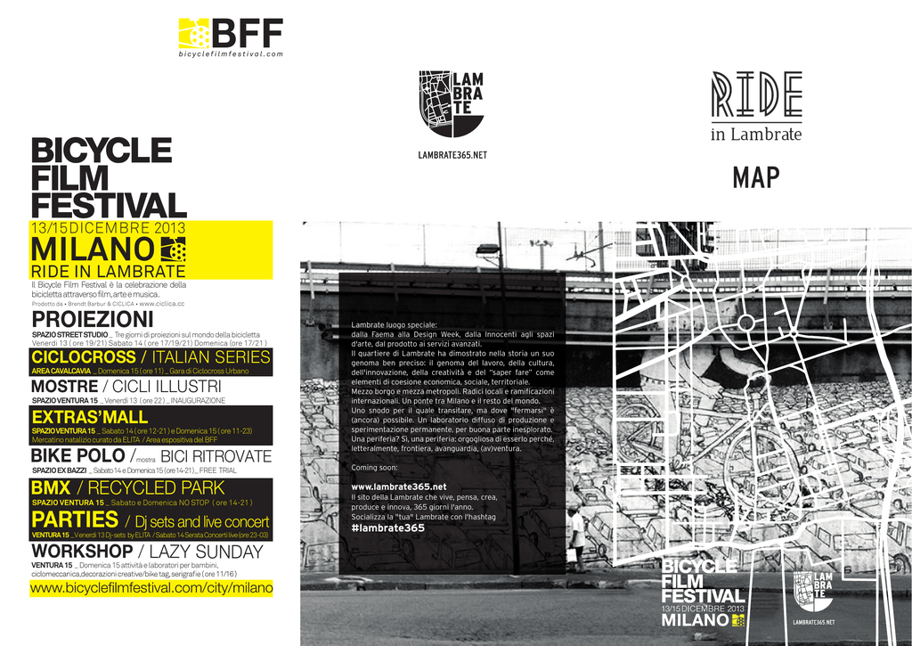 BFF bicyclefilmfestival.com 13/15 DICEMBRE 2013 MILANO RIDE IN LAMBRATE Il Bicycle Film Festival è la celebrazione della bicicletta attraverso film,arte e musica. Prodotto da • Brendt Barbur & CICLICA • www.ciclica.cc PROIEZIONI SPAZIO STREET STUDIO _ Tre giorni di proiezioni sul mondo della bicicletta Venerdi 13 ( ore 19/21) Sabato 14 ( ore 17/19/21) Domenica (ore 17/21 ) CICLOCROSS / ITALIAN SERIES AREA CAVALCAVIA _ Domenica 15 ( ore 11) _ Gara di Ciclocross Urbano MOSTRE / CICLI ILLUSTRI SPAZIO VENTURA 15 _ Venerdì 13 ( ore 22 ) _ INAUGURAZIONE EXTRAS’MALL / CICLOSTILI SPAZIO VENTURA 15 _ Sabato 14 ( ore 12-21 ) e Domenica 15 ( ore 11-23) Mercatino natalizio curato da ELITA / Area espositiva del BFF BIKE POLO / mostra BICI RITROVATE Lambrate luogo speciale: dalla Faema alla Design Week, dalla Innocenti agli spazi d'arte, dal prodotto ai servizi avanzati. Il quartiere di Lambrate ha dimostrato nella storia un suo genoma ben preciso: il genoma del lavoro, della cultura, dell'innovazione, della creatività e del “saper fare” come elementi di coesione economica, sociale, territoriale. Mezzo borgo e mezza metropoli. Radici locali e ramificazioni internazionali. Un ponte tra Milano e il resto del mondo. Uno snodo per il quale transitare, ma dove "fermarsi" è (ancora) possibile. Un laboratorio diffuso di produzione e sperimentazione permanente, per buona parte inesplorato. Una periferia? Sì, una periferia: orgogliosa di esserlo perché, letteralmente, frontiera, avanguardia, (av)ventura. SPAZIO EX BAZZI _ Sabato14 e Domenica15 (ore14-21)_ FREE TRIAL Coming soon: BMX / RECYCLED PARK www.lambrate365.net SPAZIO VENTURA 15 _ Sabato e Domenica NO STOP ( ore 14-21 ) PARTIES / Dj sets and live concert VENTURA 15 _V enerdi 13 Dj-sets by ELITA / Sabato 14 Serata Concerti live (ore 23-03) WORKSHOP / LAZY SUNDAY VENTURA 15 _ Domenica 15 attività e laboratori per bambini, Il sito della Lambrate che vive, pensa, crea, produce e innova, 365 giorni l'anno. Socializza la "tua" Lambrate con l'hashtag #lambrate365 Il Bicycle Film Festival celebra la bicicletta a Lambrate attraverso film, musica e arte. Con RIDE IN LAMBRATE il Bicycle Film Festival approda in alcuni spazi del quartiere di Lambrate di grande valore e storia. Ma non si ferma e, proprio come farebbe un ciclista, intende percorrere le sue strade, conoscerlo meglio, e farsi raccontare le sue storie. Lambrate è stato un quartiere pulsante di grande manifattura, nomi che hanno fatto la storia industriale italiana. Ora questa realtà si è trasformata ed evoluta, ma il quartiere rimane un’area con una vocazione produttiva che ha saputo reinventarsi, con un forte tessuto sociale di residenti, lavoratori, pendolari e studenti. Non manca nulla, soprattutto da quando la forte identità urbanistica del quartiere è stata scoperta anche dal mondo dell’arte e del design. Un quartiere di mani creative e teste produttive. MAP FILM A RIDE in LAMBRATE 1 2 3 FAEMA Via Ventura 15 Per Milano e Lambrate, la Faema è stata un'importante installazione industriale che ha impiegato migliaia di lavoratori. Un marchio identitario per gli operai che producevano macchine del caffè presenti con quel nome nei bar di tutta Italia. Caffè, bar e ciclismo costituiscono elementi importanti della cultura popolare italiana. E infatti, Faema ha dato il nome a una importante squadra ciclistica nella quale tra il 1960 e il 1970 corsero ciclisti di fama come Eddy Merckx, Vittorio Adorni e Charly Gaul. MIRNA CICLI Via Conte Rosso 18 Un negozio di riparazioni, una ciclofficina attivissima che custodisce pezzi di storia e tanti racconti. Come questo: “Faccio biciclette per chiedere e supplicare al mondo che sia migliore. A volte mi riesce; strano, ma mi riesce” (www.mirnacicli.com). 8 9 10 tubi d'acciaio dal 1919, prima di trasferire la sede. Non si scappa, ogni ciclista ha avuto almeno una bicicletta da corsa con la mitica colomba bianca su sfondo rosso del logo Columbus. La ricerca sui materiali dei telai e forche ha portato non pochi record dell'ora. Ma Columbus (che era presente con uno stabilimento anche in via Pestagalli) ha anche fornito le ossature per le Moto Guzzi, per le Maserati e le Ferrari di Fangio, Ascari e Villoresi, e addirittura ai primi velivoli protagonisti delle trasvolate atlantiche di Italo Balbo e Giuseppe de Pinedo. I tubolari in acciaio cromato daranno un contributo significativo alla storia del design del mobile a partire dalle idee progettuali degli architetti razionalisti tra gli anni Trenta e Cinquanta. 11 12 13 STUDIO DI ELIO E LE STORIE TESE Via Folli 34 Una delle band più “milanesi” e più conosciute in Italia (tanto eclettiche da rendere vana ogni descrizione sintetica). Gli “Elii” hanno il loro studio di registrazione nel quartiere di Lambrate. 14 LE CHITARRE DEL BOSS Via Rombon 41 C'è chi come dopo lavoro costruisce chitarre che finiscono tra le mani di Bruce Springsteen. Anche Lou Reed ha fatto tappa nel laboratorio NOAH, in uno scantinato di via Rombon, anche se si tratta di una cantina non da poco, quella della villa settecentesca Busca Serbelloni. Lo studio NOAH, specializzato in chitarre e strumenti musicali in alluminio, nasce dall'amicizia e dalla passione di Renato Ruatti, Gianni Melis e Mauro Mosca. BFF - CICLOCROSS Via Rubattino BFF - Bmx Recycled Park via Ventura, 15 Festival saranno a disposizione degli amanti delle bmx nello spazio Ventura15. 15 19 BICYCLE FILM FESTIVAL - MUSICA Via Ventura 15 BFF GALLERIE D’ARTE LAMBRETTO ART PROJECT Via Cletto Arrighi 19 BLU Via Predil 20 OMAR HASSAN Via Conte Rosso Camminando sui marciapiedi di via Conte Rosso si notano degli indizi: dei punti colorati sull'asfalto, spruzzi dati a spray apparentemente senza troppa logica. Seguendoli all'improvviso esplodono in centinaia di migliaia sui muri del parchetto di questa via. Opera di Omar Hassan, artista che ha voluto rendere omaggio in questo modo al quartiere. 21 TEATRO MARTINITT via Pitteri 58 La storia dei Martinitt na