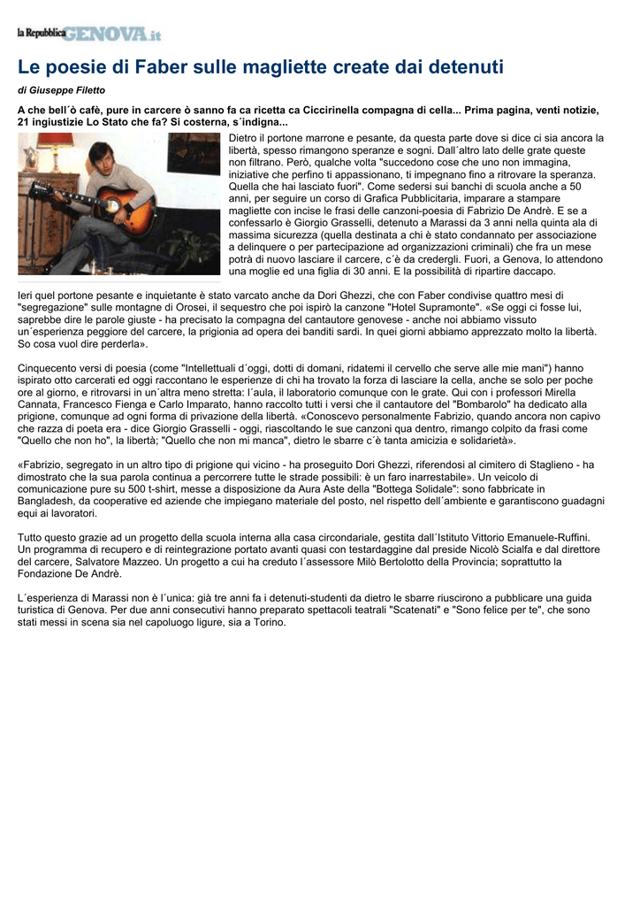 Le poesie di Faber sulle magliette create dai detenuti di Giuseppe Filetto A che bell´ò cafè, pure in carcere ò sanno fa ca ricetta ca Ciccirinella compagna di cella... Prima pagina, venti notizie, 21 ingiustizie Lo Stato che fa? Si costerna, s´indigna... Dietro il portone marrone e pesante, da questa parte dove si dice ci sia ancora la libertà, spesso rimangono speranze e sogni. Dall´altro lato delle grate queste non filtrano. Però, qualche volta "succedono cose che uno non immagina, iniziative che perfino ti appassionano, ti impegnano fino a ritrovare la speranza. Quella che hai lasciato fuori". Come sedersi sui banchi di scuola anche a 50 anni, per seguire un corso di Grafica Pubblicitaria, imparare a stampare magliette con incise le frasi delle canzoni-poesia di Fabrizio De Andrè. E se a confessarlo è Giorgio Grasselli, detenuto a Marassi da 3 anni nella quinta ala di massima sicurezza (quella destinata a chi è stato condannato per associazione a delinquere o per partecipazione ad organizzazioni criminali) che fra un mese potrà di nuovo lasciare il carcere, c´è da credergli. Fuori, a Genova, lo attendono una moglie ed una figlia di 30 anni. E la possibilità di ripartire daccapo. Ieri quel portone pesante e inquietante è stato varcato anche da Dori Ghezzi, che con Faber condivise quattro mesi di "segregazione" sulle montagne di Orosei, il sequestro che poi ispirò la canzone "Hotel Supramonte". «Se oggi ci fosse lui, saprebbe dire le parole giuste - ha precisato la compagna del cantautore genovese - anche noi abbiamo vissuto un´esperienza peggiore del carcere, la prigionia ad opera dei banditi sardi. In quei giorni abbiamo apprezzato molto la libertà. So cosa vuol dire perderla». Cinquecento versi di poesia (come "Intellettuali d´oggi, dotti di domani, ridatemi il cervello che serve alle mie mani") hanno ispirato otto carcerati ed oggi raccontano le esperienze di chi ha trovato la forza di lasciare la cella, anche se solo per poche ore al giorno, e ritrovarsi in un´altra meno stretta: l´aula, il laboratorio comunque con le grate. Qui con i professori Mirella Cannata, Francesco Fienga e Carlo Imparato, hanno raccolto tutti i versi che il cantautore del "Bombarolo" ha dedicato alla prigione, comunque ad ogni forma di privazione della libertà. «Conoscevo personalmente Fabrizio, quando ancora non capivo che razza di poeta era - dice Giorgio Grasselli - oggi, riascoltando le sue canzoni qua dentro, rimango colpito da frasi come "Quello che non ho", la libertà; "Quello che non mi manca", dietro le sbarre c´è tanta amicizia e solidarietà». «Fabrizio, segregato in un altro tipo di prigione qui vicino - ha proseguito Dori Ghezzi, riferendosi al cimitero di Staglieno - ha dimostrato che la sua parola continua a percorrere tutte le strade possibili: è un faro inarrestabile». Un veicolo di comunicazione pure su 500 t-shirt, messe a disposizione da Aura Aste della "Bottega Solidale": sono fabbricate in Bangladesh, da cooperative ed aziende che impiegano materiale del posto, nel rispetto dell´ambiente e garantiscono guadagni equi ai lavoratori. Tutto questo grazie ad un progetto della scuola interna alla casa circondariale, gestita dall´Istituto Vittorio Emanuele-Ruffini. Un programma di recupero e di reintegrazione portato avanti quasi con testardaggine dal preside Nicolò Scialfa e dal direttore del carcere, Salvatore Mazzeo. Un progetto a cui ha creduto l´assessore Milò Bertolotto della Provincia; soprattutto la Fondazione De Andrè. L´esperienza di Marassi non è l´unica: già tre anni fa i detenuti-studenti da dietro le sbarre riuscirono a pubblicare una guida turistica di Genova. Per due anni consecutivi hanno preparato spettacoli teatrali "Scatenati" e "Sono felice per te", che sono stati messi in scena sia nel capoluogo ligure, sia a Torino.