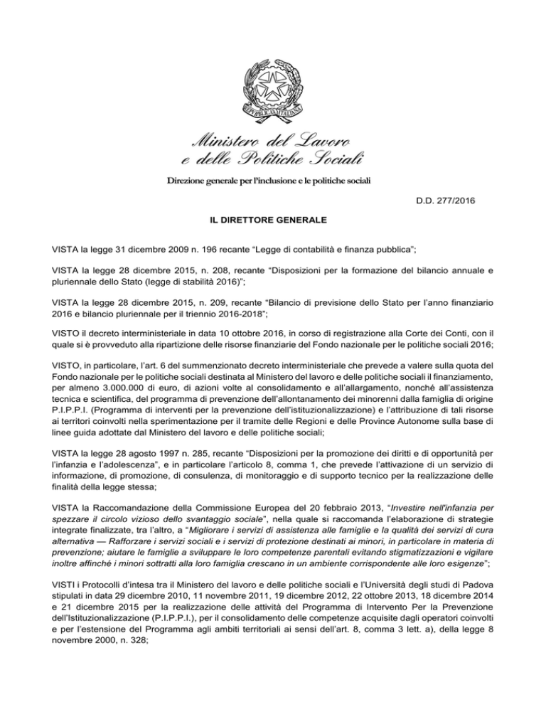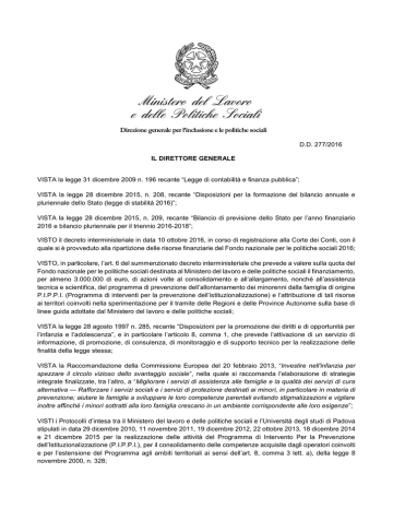 Direzione generale per l’inclusione e le politiche sociali D.D. 277/2016 IL DIRETTORE GENERALE VISTA la legge 31 dicembre 2009 n. 196 recante “Legge di contabilità e finanza pubblica”; VISTA la legge 28 dicembre 2015, n. 208, recante “Disposizioni per la formazione del bilancio annuale e pluriennale dello Stato (legge di stabilità 2016)”; VISTA la legge 28 dicembre 2015, n. 209, recante “Bilancio di previsione dello Stato per l’anno finanziario 2016 e bilancio pluriennale per il triennio 2016-2018”; VISTO il decreto interministeriale in data 10 ottobre 2016, in corso di registrazione alla Corte dei Conti, con il quale si è provveduto alla ripartizione delle risorse finanziarie del Fondo nazionale per le politiche sociali 2016; VISTO, in particolare, l’art. 6 del summenzionato decreto interministeriale che prevede a valere sulla quota del Fondo nazionale per le politiche sociali destinata al Ministero del lavoro e delle politiche sociali il finanziamento, per almeno 3.000.000 di euro, di azioni volte al consolidamento e all’allargamento, nonché all’assistenza tecnica e scientifica, del programma di prevenzione dell’allontanamento dei minorenni dalla famiglia di origine P.I.P.P.I. (Programma di interventi per la prevenzione dell’istituzionalizzazione) e l’attribuzione di tali risorse ai territori coinvolti nella sperimentazione per il tramite delle Regioni e delle Province Autonome sulla base di linee guida adottate dal Ministero del lavoro e delle politiche sociali; VISTA la legge 28 agosto 1997 n. 285, recante “Disposizioni per la promozione dei diritti e di opportunità per l’infanzia e l’adolescenza”, e in particolare l’articolo 8, comma 1, che prevede l’attivazione di un servizio di informazione, di promozione, di consulenza, di monitoraggio e di supporto tecnico per la realizzazione delle finalità della legge stessa; VISTA la Raccomandazione della Commissione Europea del 20 febbraio 2013, “Investire nell'infanzia per spezzare il circolo vizioso dello svantaggio sociale”, nella quale si raccomanda l’elaborazione di strategie integrate finalizzate, tra l’altro, a “Migliorare i servizi di assistenza alle famiglie e la qualità dei servizi di cura alternativa — Rafforzare i servizi sociali e i servizi di protezione destinati ai minori, in particolare in materia di prevenzione; aiutare le famiglie a sviluppare le loro competenze parentali evitando stigmatizzazioni e vigilare inoltre affinché i minori sottratti alla loro famiglia crescano in un ambiente corrispondente alle loro esigenze”; VISTI i Protocolli d’intesa tra il Ministero del lavoro e delle politiche sociali e l’Università degli studi di Padova stipulati in data 29 dicembre 2010, 11 novembre 2011, 19 dicembre 2012, 22 ottobre 2013, 18 dicembre 2014 e 21 dicembre 2015 per la realizzazione delle attività del Programma di Intervento Per la Prevenzione dell’Istituzionalizzazione (P.I.P.P.I.), per il consolidamento delle competenze acquisite dagli operatori coinvolti e per l’estensione del Programma agli ambiti territoriali ai sensi dell’art. 8, comma 3 lett. a), della legge 8 novembre 2000, n. 328; VISTE le Linee guida per la presentazione da parte di Regioni e Province autonome di proposte di adesione alla sperimentazione del modello di intervento P.I.P.P.I. (Programma di Interventi Per la Prevenzione dell’Istituzionalizzazione) adottate in data 22 ottobre 2013, 6 ottobre 2014 e 5 agosto 2015; VISTI i risultati positivi raggiunti nelle precedenti fasi di implementazione del Programma e pubblicati nei numeri 24, 34 e 38 della serie dei “Quaderni della Ricerca Sociale”, disponibili sul sito istituzionale del Ministero del Lavoro e delle Politiche Sociali; CONSIDERATA la necessità di consolidare sempre più il modello di intervento nei territori già aderenti durante le precedenti annualità e/o di estendere la sperimentazione del Programma ad altri territori; ADOTTA le seguenti linee guida per la presentazione da parte di Regioni e Province autonome di proposte di adesione al modello di intervento P.I.P.P.I. (Programma di Interventi Per la Prevenzione dell’Istituzionalizzazione). LINEE GUIDA PER LA PRESENTAZIONE DA PARTE DI REGIONI E PROVINCE AUTONOME DI PROPOSTE DI ADESIONE AL MODELLO DI INTERVENTO P.I.P.P.I. (Programma di Interventi Per la Prevenzione dell’Istituzionalizzazione) 1. CONTESTO Con la Strategia EU2020 l’Unione Europea intende perseguire una crescita intelligente, sostenibile e inclusiva. Con essa si riconosce l’intimo legame tra politiche economiche e politiche sociali, ponendo al centro dell’attenzione del policy maker la lotta alla povertà ed alla esclusione sociale, in particolare fissando un target di riduzione di 20 milioni del numero di persone in condizioni di povertà ed esclusione sociale, entro il 2020 per l’Unione nel suo insieme. In comparazione con la media degli altri paesi europei, la povertà e l’esclusione sociale sono in Italia più diffuse: secondo l’indicatore adottato nella Strategia Europa 2020, nel nostro Paese il 28,7% della popolazione è a rischio di povertà e/o esclusione sociale a fronte del 23,7% della media comunitaria. Ancora maggiore è la distanza dalla media comunitaria nel caso dei minori, collocandosi il nostro Paese tra quelli a più alta incidenza del rischio di povertà e/o esclusone sociale minorile (33,5%, rispetto ad una media UE del 24,9%). Alla alta proporzione di famiglie in condizione di povertà e/o esclusione sociale per il paese nel suo complesso non corrisponde una omogenea distribuzione dei servizi e degli interventi a livello territoriale, tenuto conto dei diversi bisogni; a livello regionale si assiste infatti ad una elevata sperequazione della spesa sociale per gli interventi e servizi dei Comuni, spesa che va dagli oltre 200 euro pro-capite in Valle d’Aosta, nelle Provincie autonome di Trento e di Bolzano, in Friuli Venezia Giulia ed in Sardegna a meno di 25 euro nell