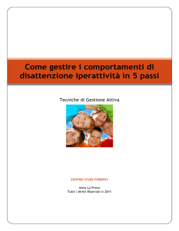 Come gestire i comportamenti di disattenzione iperattività in 5 passi Tecniche di Gestione Attiva CENTRO STUDI FOREPSY Anna La Prova Tutti i diritti Riservati © 2011 Come gestire i comportamenti di disattenzione iperattività in 5 passi Ciao! Mi chiamo Anna La Prova, sono una psicoterapeuta ad orientamento cognitivocomportamentale ed oltre che di psicoterapia, mi occupo di formazione e consulenza per insegnanti e consulenza per le famiglie. Negli ultimi anni, le richieste che mi arrivano sia dal mondo della scuola che dalle famiglie, fanno spesso riferimento alle problematiche legate alla gestione di comportamenti di bambini iperattivi o disattenti, sia bambini a cui è stato diagnosticato un vero e proprio Disturbo da Deficit d’Attenzione Iperattività (ADHD), sia anche bambini molto vivaci. Ho voluto pertanto capire meglio come stavano le cose per questi bambini e così ho iniziato a studiare a fondo questo tipo di disturbo, ma soprattutto ho voluto capire che cosa succedeva in pratica nelle classi e cosa gli insegnanti si trovavano a vivere ogni giorno, così come i genitori. Come gestire i comportamenti di disattenzione iperattività in 5 passi | © 2011 Ed è soprattutto grazie al confronto con loro e alla loro disponibilità a mettere in atto le strategie che io suggerivo, rivedendole, modificandole insieme ogni volta, fino al raggiungimento degli obiettivi prefissati, che oggi mi sento in grado di poterti suggerire quelli che mi piace definire i 5 passi fondamentali (oserei dire indispensabili!) per poter gestire i comportamenti di iperattività e di disattenzione sia in classe che in famiglia. Oggi si parla tanto di ADHD, di suggerimenti e strategie da adottare se ne trovano tantissime, ma ciò che insegnanti e genitori spesso mi chiedono è “da dove partire?” intuendo, infatti, che è importante seguire una sequenza specifica di passi per poter riuscire ad arginare i comportamenti problema e aumentare quelli adattivi e funzionali all’apprendimento, in pratica per ottenere ciò che si vuole è importante non solo sapere cosa fare, ma come e quando metterlo in pratica. In questo breve report, cercherò di spiegarti quale è la migliore sequenza di strategie per poter gestire in modo efficace i comportamenti di disattenzione iperattività, riducendo al minimo lo sforzo e i tempi di attuazione. Prestami un po’ di attenzione e soprattutto OPERA! Osserva Progetta Esegui Rifletti Aggiusta il tiro 1 Primo: OSSERVA “Fermati, aspetta e risparmierai tempo, corri, affannati e non arriverai” (proverbio cinese) Lo so che hai fretta di rispondere subito alle emergenze che spesso certi comportamenti ti portano a dover affrontare e so anche che, se sei un insegnante hai almeno altri 20 bambini in classe da dover gestire oltre al bambino iperattivo, mentre se sei un genitore ti senti esausto, forse frustrato o in colpa perché qualcuno si è permesso di dirti che i problemi di tuo figlio erano colpa tua, so tutto questo e so che proprio per questo l’idea di fermarti ad osservare senza intervenire subito ti mette a disagio, perché hai la sensazione di perdere tempo e soprattutto di perdere il controllo della situazione. Spesso quando siamo di fronte ad un problema, la prima cosa che ci viene da fare è quella di agire subito, fare qualcosa, qualsiasi cosa, pur di tentare di giungere ad una soluzione. Proprio per questo spesso ho sentito insegnanti o genitori dirmi: “Con lui/lei le ho provate davvero tutte: dalla dolcezza alla punizione, dall’indifferenza al rifiuto, al premio”, e ciò che io rispondo è che purtroppo, nonostante le buone intenzioni, è proprio questo il problema, perchè averle provate tutte significa una sola: aver dato al bambino una serie di informazioni contrastanti che non hanno fatto altro che aumentare la sua confusione e il suo bisogno di cercare coerenza e struttura che molto spesso, come vedremo tra poco, si traduce proprio in quei comportamenti problema che si sta cercando di evitare. E’ proprio importante, invece, fermarsi un attimo ed osservare prima di fare qualsiasi altra cosa. Osservare ci serve a capire, capire ci serve ad agire in modo mirato e a non disperdere tempo ed energie. Un primo aspetto di cui divenire consapevoli è questo: ogni bambino agisce e si comporta in un contesto, per cui spesso reagisce a ciò che in quel contesto avviene. Per molti genitori ed insegnanti è stato illuminante rendersi conto che di alcuni comportamenti problematici, era possibile individuare degli eventi antecedenti che si verificavano sempre allo stesso modo e delle conseguenze altrettanto ricorrenti. Ad es: tutte le volte che viene affidato un nuovo compito, Marco si alza dal banco e disturba i compagni o chiede di uscire, la maestra lo punisce, oppure tutte le volte che si esce a fare una passeggiata, Luca insiste perché mamma e papà gli comprino un gioco, insiste così tanto che alla fine loro cedono e lui perde immediatamente interesse per il gioco che aveva tanto insistentemente richiesto. Nel primo caso caso l’antecedente ricorrente è “l’assegnazione di un nuovo compito” e la conseguenza ricorrente è “la maestra lo punisce”. Nel secondo caso, c’è una conseguenza ricorrente che è “tutte le volte che Luca fa una richiesta con insistenza, i genitori cedono per stanchezza, attuando un meccanismo comunicativo del tipo “no, no, no, no, si”, che purtroppo non fa che rinforzare il comportamento. Individuare antecedenti e conseguenze è estremamente utile perché se le cose si verificano sempre allo stesso modo, allora possiamo prevederle e soprattutto possiamo farci qualcosa! Come gestire i comportamenti di disattenzione iperattività in 5 passi | © 2011 In realtà è vero il contrario: quanto più saprai fermarti ad osservare con attenzione, seguendo uno schema specifico di cui sto per dirti, tanto più avrai chiaro cosa fare e risparmierai molto tempo e molte energie, piuttosto che se tu ti buttassi ad affrontare tutto con 