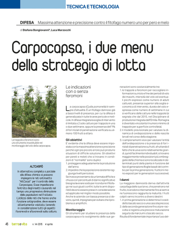 TECNICA E TECNOLOGIA DIFESA Massima attenzione e precisione contro il fitofago numero uno per pero e melo di Stefano Bongiovanni*, Luca Marzocchi Carpocapsa, i due menu della strategia di lotta Le indicazioni con o senza feromoni L a carpocapsa (Cydia pomonella) è sempre d’attualità. È un fitofago dannoso già a bassi livelli di presenza, per cui la difesa è generalizzata in tutte le aree pericole e melicole. In difesa integrata la soglia di intervento è limitata a 2 sole catture per trappola in una o due settimane, oppure la presenza dell’1% di fori iniziali di penetrazione verificata su almeno 100 frutti a ettaro. Le trappole a feromoni sono uno strumento insostituibile nel monitoraggio del volo della carpocapsa. ALTCARPÒ In alternativa completa o parziale alla difesa chimica si possono impiegare le reti antinsetto “AltCarpò” per il controllo della Carpocapsa. Esse impediscono l’entrata degli insetti causando nel tempo una progressiva diminuzione delle popolazioni nel frutteto. L’utilizzo delle reti che hanno anche funzione antigrandine, deve essere attentamente valutato, tenendo in considerazione tutti gli aspetti favorevoli e sfavorevoli sulla coltura. 46 terra vita n. 14-2015 4 aprile Gli obiettivi E’ evidente che la difesa deve essere impostata con la massima attenzione e precisione perché ogni più piccolo errore può produrre situazioni di difficile soluzione. Gli obiettivi per pereti e meleti che si trovano in condizioni di “normalità” sono duplici: 1.proteggere adeguatamente la produzione dell’anno; 2.impedire che la popolazione esistente raggiunga livelli pericolosi. Se invece proveniamo da un’annata difficile e chiusa con percentuali di danno significative bisogna lavorare sodo per ricondurre il fitofago nei suoi giusti confini; tutte le armi disponibili devono essere prese in considerazione ed applicate nel miglior modo possibile. Anche le aziende con bassa presenza si devono, quindi, impegnare per evitare che il problema si amplifichi. Monitoraggio Gli strumenti per studiare la presenza della carpocapsa e lo svolgimento delle sue ge- nerazioni sono sostanzialmente tre: 1.le trappole a feromoni per raccogliere informazioni su inizio e fine dei periodi di volo dei maschi, intensità del volo ed eventuali picchi espressi come numero di adulti catturati, presenze superiori alla soglia economica di intervento, durata del volo espressa come numero di settimane in cui si verificano delle catture nelle trappole (si segnala che dal 2015, nel Disciplinare di produzione integrata dell’Emilia-Romagna è diventato vincolante il numero minimo di trappole per superficie controllata). 2.il modello previsionale per valutare la dinamica di ovideposizione e delle nascite larvali nel corso della stagione; 3.i campionamenti visivi per valutare l’entità dell’ovideposizione o la presenza di fori iniziali di penetrazione su frutti, sfruttando il fatto che le uova sono relativamente grandi, quindi facilmente individuabili, si trovano maggiormente nelle posizioni più ombreggiate della chioma e sono localizzate in determinati punti della pianta in funzione del tipo di generazione (foglie basali del corimbo per la prima generazione, frutticini meno esposti per le generazioni successive). I danni La maggiore dannosità deriva dall’attività carpofaga delle sue larve, che penetrano nel frutto, lo erodono internamente fino ai semi e ne fuoriescono raggiunta la maturità. I frutti colpiti vanno incontro a diversi destini: 1.in prima generazione si determina il cosiddetto bacato secco o una cascola precoce; 2.dalla seconda generazione fino al pre-raccolta si registra una precoce maturazione seguita da marciumi o bacato secco. Risulta di fondamentale importanza l’uso del- Il metodo biologico Adulti di carpocapsa catturati in una trappola a feromoni. Con il metodo biologico, fondamentale è l’impiego di confusione o distrazione così come lo è l’utilizzo del virus della granulosi, anche in miscela con olio minerale estivo, per chiudere poi sulla terza generazione eventualmente con lo spinosad. L’olio bianco estivo permette di ottenere una buona efficacia contro le uova e, in miscela con virus, ne migliora l’efficacia. In post raccolta (da metà settembre a metà ottobre) è poi possibile intervenire con trattamenti a base di nematodi entomopatogeni con l’obiettivo di limitare la consistenza delle popolazioni. Nelle esperienze pluriennali condotte in Emilia Romagna, Steinernema feltiae si è dimostrato il L’INTEGRATA AVANZATA Incrociando i dati raccolti con i vari sistemi di monitoraggio è possibile impostare una strategia di difesa adeguata alle condizioni specifiche di ogni singolo frutteto. E’ altresì importantissimo considerare la storia dell’azienda e dei problemi emersi nelle annate precedenti. La “Difesa Integrata Avanzata” (DIA) della Regione Emilia-Romagna prevede norme tecniche ben precise. I divieti riguardano l’impiego complessivo di esteri fosforici limitato a due interventi complessivi nella stagione, mentre gli obblighi riguardano l’impiego della confusione o disorientamento sessuale, o di 8 interventi di confusione spray, o l’impiego di 3 interventi con il virus della granulosi della carpocapsa. Come appare chiaro, si lavora sempre nell’ottica di limitare e razionalizzare l’impiego della chimica in favore di efficaci mezzi di difesa a minor impatto ambientale. Le contromisure Larva di carpocapsa. le trappole a feromoni sessuali per quantificare efficacemente la diffusione del fitofago nell’azienda e programmare correttamente i trattamenti. Le prime catture (seconda-terza decade di aprile per l’Emilia-Romagna), che possono essere anche molto abbondanti, vanno considerate alla luce di una precisa caratteristica biologica della carpocapsa: la proterandria, ovvero l’inizio anticipato del volo dei maschi rispetto alle femmine. In tal modo le trappole inizialmente catturano molti più individui perché non esiste la co