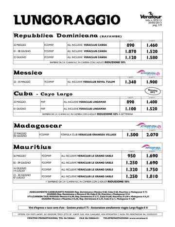 lungoraggio repubblica dominicana Info n. 073/13 20/05/2013 pag. 1/4 (bayahibe) 25 maggio fco/mxp All Inclusive veRAcLUb cANOA 01 - 08 giugno fco/mxp All Inclusive veRAcLUb cANOA 22 giugno fco/mxp All Inclusive veRAcLUb cANOA 7 NOTTI 14 NOTTI 890 1.070 1.120 1.460 1.520 1.580 bambini da 2 a 12 anni n.c. in camera con 2 adulti riduzione 50% Messico 23 - 30 maggio Cuba più all inclusive veRAcLUb royal tulum fco/mxp 7 NOTTI 14 NOTTI 1.340 1.900 Restyling 2012 - Cayo Largo 7 NOTTI 14 NOTTI 25 maggio mxp all inclusive veRAcLUb lindamar 890 1.400 01 giugno mxp all inclusive veRAcLUb lindamar 1.100 1.520 bambini da 2 a 12 anni n.c. in camera con 2 adulti riduzione 50% a settimana Madagascar 27 maggio 03 giugno fco/mxp più formula club veRAcLUb orangea village Mauritius 26 maggio FCO/mxp all inclusive veRAcLUb le grand sable 02 - 09 giugno FCO/mxp all inclusive veRAcLUb le grand sable 16 giugno 14 luglio FCO/mxp all inclusive veRAcLUb le grand sable 23 - 30 giugno 07 luglio FCO/mxp all inclusive veRAcLUb le grand sable 7 NOTTI 14 NOTTI 1.500 2.070 7 NOTTI 14 NOTTI 950 1.250 1.320 1.250 1.690 1.690 1.750 1.810 1° bambino da 2 a 12 anni n.c. in camera con 2 adulti riduzione 50% Adeguamento carburante MAGGIO: Rep. Dominicana e Messico € 68, Cuba € 68, Mauritius e Madagascar € 72 GIUGNO: Rep. Dominicana e Messico € 50, Cuba € 50, Mauritius e Madagascar € 54 ETS (Carbon tax) MAGGIO: Messico € 6,98, Rep. Dominicana € 5,77, Cuba € 6,60, Mauritius € 6,98 e Madagascar € 6,27 GIUGNO: Messico e Mauritius € 6,46, Rep. Dominicana € 5,34, Cuba € 6,11, Madagascar € 5,80 Visti d'ingresso e tasse come d'uso - Gestione pratica € 75 - Assicurazione annullamento viaggio: Lungo Raggio € 41 OFFERTA CON POSTI LIMITATI, NO RIDUZIONE TERZO LETTO NE’ JUNIOR CLUB, NON CUMULABILE, NON RETROATTIVA E VALIDA PER PRENOTAZIONI DAL 20/05/2013 CENTRO PRENOTAZIONI: TEL 06/500661 FAX 06/50066431 TELEPRENOTAZIONI: www.veratour.it