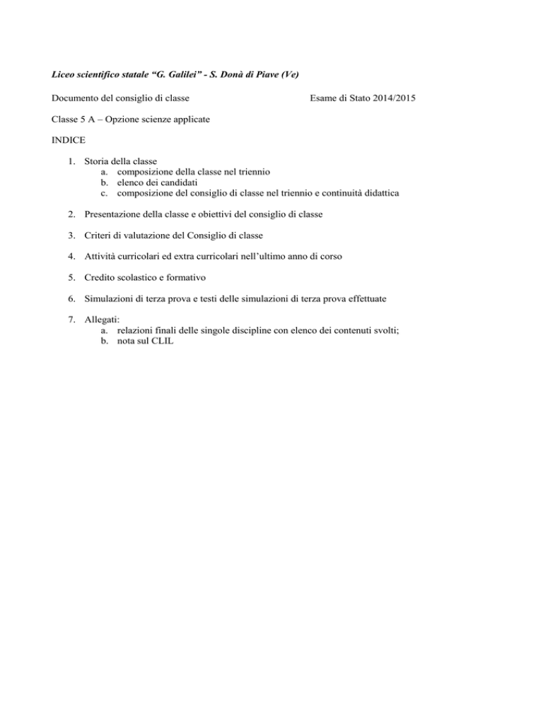 Liceo scientifico statale “G. Galilei” - S. Donà di Piave (Ve) Documento del consiglio di classe Esame di Stato 2014/2015 Classe 5 A – Opzione scienze applicate INDICE 1. Storia della classe a. composizione della classe nel triennio b. elenco dei candidati c. composizione del consiglio di classe nel triennio e continuità didattica 2. Presentazione della classe e obiettivi del consiglio di classe 3. Criteri di valutazione del Consiglio di classe 4. Attività curricolari ed extra curricolari nell’ultimo anno di corso 5. Credito scolastico e formativo 6. Simulazioni di terza prova e testi delle simulazioni di terza prova effettuate 7. Allegati: a. relazioni finali delle singole discipline con elenco dei contenuti svolti; b. nota sul CLIL 1. Storia della classe a) Composizione della classe nel triennio Classe Allievi Promossi frequentanti Terza 25 22 Quarta 23 23 Quinta 23 Trasferiti 2 0 Promossi debito 1 0 con Non promossi 0 0 b) Elenco dei candidati 1. Artusato Ruggero 2. Barbazza Mattia 3. Boccaletto Ilaria 4. Bodi Simone 5. Braga Leonardo 6. Canever Giona 7. Cortello Thomas 8. Dagonfo Ludovico 9. Donà Antonio 10. Fantin Roberto 11. Fiorin Alessandro 12. Franceschi Giovanni 13. Gerotto Carlo 14. Giusto Nicola 15. Midena Federico 16. Panizzo Andrea 17. Pelloia Alberto 18. Pizzol Lorenzo 19. Potlog Violina 20. Striato Alberto 21. Valeri Eleonora 22. Vianello Giulio 23. Zabotto Davide c) Composizione del consiglio di classe e continuità didattica nel triennio Disciplina Italiano Inglese Storia Filosofia Matematica Fisica Scienze Informatica DSA Scienze motorie Religione catt. Classe terza Andrea Longega Emanuela Gentil Stefania Sari Patrizia Drigo Fabrizio Floris Fabrizio Floris Gualtiero Broglio Lodovico Gottardi Angela Tomba Francesca Casano Cristina Nordio Classe quarta Andrea Longega Emanuela Gentil Irene Dante Patrizia Drigo Fabrizio Floris Fabrizio Floris Gualtiero Broglio Lodovico Gottardi Angela Tomba Giuseppina Messina Cristina Nordio Classe quinta Andrea Longega Laura Masiero Patrizia Drigo Patrizia Drigo Fabrizio Floris Fabrizio Floris Gualtiero Broglio Luca Spinelli Angela Tomba Daniela Grandolfo Cristina Nordio Continuità Sì No No Sì Sì Sì Sì No Sì No Sì 2. Presentazione della classe e obiettivi del consiglio di classe La classe risulta composta da 23 allievi, 20 maschi e sole 3 femmine. Sia dal punto di vista disciplinare, sia da quello culturale, per la classe è stata caratterizzante la prevalenza della componente maschile. Soprattutto il comportamento, infatti, benché sempre nei limiti della correttezza, si è rivelato talvolta vivace, a volte a scapito dell'attenzione individuale e generale. La classe, nel corso dell'anno scolastico ha mantenuto, nei confronti di tutte le discipline del corso di studi, nuovo e sperimentale, interpretato fin dall’inizio con decisione, un livello di interesse e di motivazione quasi sempre adeguato, anche se ha dovuto adattarsi a cambi di insegnante relativi a materie importanti come inglese e informatica, avvicendamenti che se non hanno comportato difficoltà di rapporto hanno però costretto a rivedere gli approcci metodologici complicando un quadro già talvolta accidentato a causa delle caratteristiche palesate dagli allievi e di seguito illustrate. Alterna la partecipazione alle sollecitazioni proposte dai docenti. Una parte degli alunni ha mostrato un coinvolgimento attivo nel dialogo educativo e nella partecipazione al lavoro scolastico; altri, hanno evidenziato, principalmente, un atteggiamento più ricettivo che propositivo. Gli allievi, nel complesso, hanno dimostrato attenzione ed impegno accettabile seppure alterno nel lavoro individuale. Non tutti gli allievi sono riusciti a sviluppare un lavoro continuo e capacità di revisione e rielaborazione di quanto studiato. Il percorso compiuto dai ragazzi è stato lungo e articolato, ma essi hanno dimostrato di essere maturati e divenuti sostanzialmente autonomi e consapevoli, soprattutto se confrontati al livello di partenza, che aveva destato qualche preoccupazione nel corpo docente. Il livello di competenze raggiunto nel complesso può dirsi soddisfacente e gli obiettivi indicati dal consiglio di classe possono dirsi sostanzialmente raggiunti. 3. Criteri di valutazione del Consiglio di classe Per quanto attiene i criteri di valutazione del consiglio di classe e la corrispondenza voti-giudizi, tenuto conto delle decisioni deliberate in sede di Collegio dei docenti sia per quanto concerne l’attribuzione dei voti sia in itinere che per le valutazioni quadrimestrali, si è concordato di considerare, quale criterio base, l’andamento dei progressi riferiti alla situazione di partenza e i risultati raggiunti come da indicatori riportati sul POF. Anche in relazione alla tabella di corrispondenza dei voti rispetto agli indicatori sia generali che disciplinari, si fa riferimento a quanto riportato sul POF. 4. Credito scolastico e formativo a) b) c) d) e) f) Per l’attribuzione del credito scolastico e formativo, sulla base dei criteri deliberati in sede di Collegio dei docenti, si valuterà: Media dei voti conseguiti al termine dell’anno scolastico Assiduità nella frequenza Interesse, impegno e partecipazione alle attività curricolari ed extra curricolari organizzate dalla scuola o da enti accreditati e certificati Crediti formativi Credito scolastico attribuito nei due precedenti anni scolastici Per l’attribuzione del credito formativo, ci si atterrà scrupolosamente a quanto deliberato in sede di Collegio dei docenti e come riportato sul POF 5. Attività curricolari ed extra curricolari nell’ultimo anno di corso i) Visita d’istruzione a Vienna; ii) Partecipazione al progetto d’Istituto relativo ad approfondimenti sul tema della grande guerra (spettacolo “Mato de guera” presso l’Auditorium comunale “L. Da Vinci” e recital “La battaglia del Solstizio” presso l’aula magna dell’ITIS Volterra) e visita guidata al museo di Caporetto e al monu