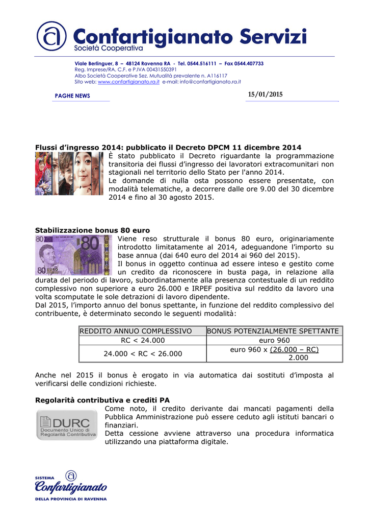 Viale Berlinguer, 8 – 48124 Ravenna RA - Tel. 0544.516111 – Fax 0544.407733 Reg. Imprese/RA, C.F. e P.IVA 00431550391 Albo Società Cooperative Sez. Mutualità prevalente n. A116117 Sito web: www.confartigianato.ra.it e-mail: [email protected] 15/01/2015 PAGHE NEWS Flussi d’ingresso 2014: pubblicato il Decreto DPCM 11 dicembre 2014 È stato pubblicato il Decreto riguardante la programmazione transitoria dei flussi d’ingresso dei lavoratori extracomunitari non stagionali nel territorio dello Stato per l'anno 2014. Le domande di nulla osta possono essere presentate, con modalità telematiche, a decorrere dalle ore 9.00 del 30 dicembre 2014 e fino al 30 agosto 2015. Stabilizzazione bonus 80 euro Viene reso strutturale il bonus 80 euro, originariamente introdotto limitatamente al 2014, adeguandone l’importo su base annua (dai 640 euro del 2014 ai 960 del 2015). Il bonus in oggetto continua ad essere inteso e gestito come un credito da riconoscere in busta paga, in relazione alla durata del periodo di lavoro, subordinatamente alla presenza contestuale di un reddito complessivo non superiore a euro 26.000 e IRPEF positiva sul reddito da lavoro una volta scomputate le sole detrazioni di lavoro dipendente. Dal 2015, l’importo annuo del bonus spettante, in funzione del reddito complessivo del contribuente, è determinato secondo le seguenti modalità: REDDITO ANNUO COMPLESSIVO RC < 24.000 24.000 < RC < 26.000 BONUS POTENZIALMENTE SPETTANTE euro 960 euro 960 x (26.000 – RC) 2.000 Anche nel 2015 il bonus è erogato in via automatica dai sostituti d’imposta al verificarsi delle condizioni richieste. Regolarità contributiva e crediti PA Come noto, il credito derivante dai mancati pagamenti della Pubblica Amministrazione può essere ceduto agli istituti bancari o finanziari. Detta cessione avviene attraverso una procedura informatica utilizzando una piattaforma digitale. La Stabilità 2015 dispone che la regolarità contributiva dell’impresa/cedente sia attestata tramite rilascio di DURC nel momento stesso della cessione del credito tramite piattaforma digitale o comunque acquisita dalla Pubblica Amministrazione ceduta. Deduzione IRAP del costo del lavoro Dal periodo d’imposta 2015, è prevista la deduzione integrale del costo del lavoro a tempo indeterminato dal valore della produzione IRAP. Infatti, sul valore della produzione IRAP viene riconosciuta l’ulteriore deduzione della differenza tra il costo complessivo per il personale dipendente con contratto a tempo indeterminato e le già previste deduzioni relative a premio INAIL, cuneo fiscale, contributi previdenziali, apprendisti, disabili, CFL e addetti alla ricerca e sviluppo; indennità di trasferta autotrasportatori e ancora deduzione di € 1.850 per dipendente e deduzione IRAP per incremento della base occupazionale. L’ulteriore nuova deduzione è applicabile dalle imprese, dai lavoratori autonomi, nonché dagli agricoltori. Subordinata all’autorizzazione della Commissione UE, è stata altresì introdotta la deduzione del costo del lavoro a favore dei produttori agricoli / società agricole per ogni lavoratore dipendente a tempo determinato con contratto triennale che abbia lavorato almeno 150 giornate nel periodo d’imposta agevolato. Sono esclusi dalla fruizione della nuova deduzione gli enti non commerciali che esercitano esclusivamente un’attività istituzionale, la cui base imponibile IRAP è determinata con il metodo retributivo. TFR in busta paga È introdotta, in via sperimentale dal 1° marzo 2015 al 30 giugno 2018, la possibilità, per il lavoratore dipendente, che abbia un rapporto di lavoro in essere da almeno sei mesi presso il medesimo datore di lavoro, di richiedere a quest’ultimo la liquidazione mensile del TFR. La quota di TFR che può essere corrisposta mensilmente in busta paga è quella maturanda di cui all’articolo 2120 c.c., al netto del contributo dello 0,50% Ivs, compresa quella eventualmente destinata ad una forma pensionistica complementare. Per il dipendente si tratta di una facoltà in quanto è libero di decidere in tal senso. Per il datore, invece, nell’ipotesi in cui la predetta facoltà sia esercitata dal lavoratore, l’erogazione mensile del TFR risulta essere un obbligo. La facoltà di richiedere la liquidazione mensile delle quote maturande di TFR è concessa ai lavoratori dipendenti del settore privato fatta eccezione per i lavoratori domestici e quelli del settore agricolo. Rimangono esclusi i dipendenti del settore pubblico, quelli dipendenti da aziende sottoposte a procedure concorsuali e da aziende dichiarate in crisi di cui all’articolo 4, Legge n. 297/1982 (aziende in crisi occupazionale). Il lavoratore potrà esercitare la predetta facoltà entro i termini che saranno definiti con specifico DPCM, insieme alle modalità di attuazione della disposizione in esame. La quota maturanda di TFR liquidata mensilmente al lavoratore costituisce parte integrativa della retribuzione: è assoggettata a tassazione ordinaria mentre non costituisce imponibile previdenziale. Rifinanziamento agevolazioni piccola mobilità Sono stanziati oltre 35 milioni di euro per il finanziamento degli sgravi contributivi a favore dei datori di lavoro che hanno assunto, fino al 31 dicembre 2012, lavoratori iscritti nelle liste della cosiddetta piccola mobilità. Dopo ben due anni di incertezza, si giunge, dunque, alla soluzione del problema della piccola mobilità originatosi nel 2013 a seguito del mancato stanziamento delle risorse destinate al finanziamento delle relative agevolazioni contributive. La Legge di Stabilità per il 2015, infatti, provvede da un lato, a “sanare” il comportamento di quei datori che nei primi mesi del 2013 (gennaio e febbraio) avevano, comunque, usufruito delle agevolazioni contributive in parola per i lavoratori assunti entro il 31 dicembre 2012 e, dall’altro, estende la possibilità di fruire, in relazione alle predette assunzioni, delle agevolazioni sopra in
