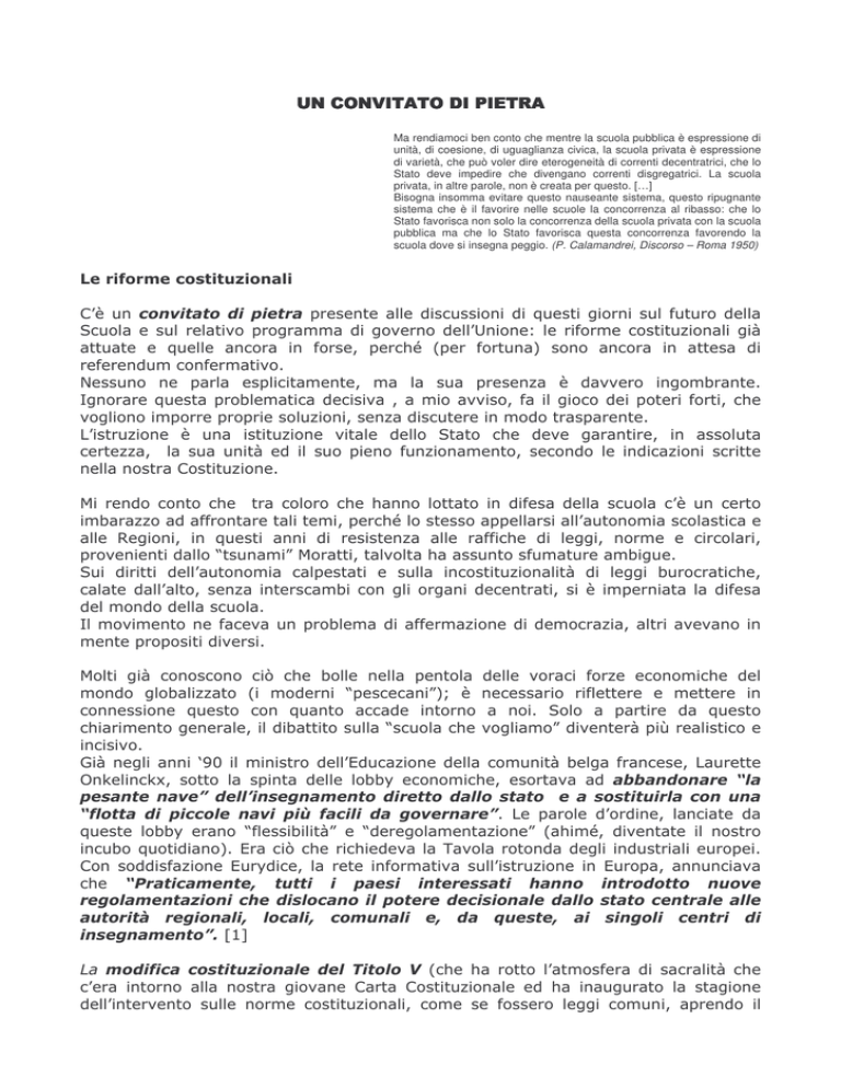 Ma rendiamoci ben conto che mentre la scuola pubblica è espressione di unità, di coesione, di uguaglianza civica, la scuola privata è espressione di varietà, che può voler dire eterogeneità di correnti decentratrici, che lo Stato deve impedire che divengano correnti disgregatrici. La scuola privata, in altre parole, non è creata per questo. […] Bisogna insomma evitare questo nauseante sistema, questo ripugnante sistema che è il favorire nelle scuole la concorrenza al ribasso: che lo Stato favorisca non solo la concorrenza della scuola privata con la scuola pubblica ma che lo Stato favorisca questa concorrenza favorendo la scuola dove si insegna peggio. (P. Calamandrei, Discorso – Roma 1950) ! " $ # ! # ! % ! & # ' ( )& # ! # # ! $ # ! & * # # ( ) + ! # ( ) , ! 2 3 . /0 1 34 # % ##5 !% ##5 # ( # !1 * 1 5 7 89 ) ( ) 6 ! 1 : ! $ # # # !! 7 ;9 ! < * # # ! * " # $ = # > % " # ! % $ ? !- @ A 7 B9 !6 ? ? ! % & ' ! C ' ( ! > > C > !B !BD ! # !BB !D8 !D; ) * + !DB !! !@ 6 ; C ! + !;0 ( E )7 B9 ! % ,# # ! 7 D9 F !" # !" , ## ? ! ' G ' 6 !$ C ! < !& , # ' H ! , $ * % = & " # ! !I & @ H # * !$ !" , * + H ## ! + " ! A * ## 8J ! - % . + ## , $ . / , < $ , ? ## ! ! 8K ! 6 ## !" 8J ! !" ! $ 6 C . ! ) # * ! 6 C !1 # 1 % 2 3 34 # ( ) # ! +! " 1 & ' (% # ! + $ / 0 1 !% ! # !" # !" ## ## / * * ? ! ? # 6 " * C! # ## * # # ! % * $ / 2 + !B !BB !BD ! ! 3 $ % / 0 / 5 , $ 4 $ 4 4 $ - &,5 $' " ! 5 LLLLLLLLLLLLLLLLLLLLLLLLLLLLLLLLL 7 89' # " I http://www.scuolidea.it/didattika/riforme_scolastiche_e_globalizza3.htm 7 ;9 # ! ! & (< ) http://www.didaweb.net/fuoriregistro/leggi.php?a=7412 7 B9M @ M - @ http://www.carovanaperlacostituzione.it/menu/setsr/setrfe 7 D9 F !C C http://www.brianzapopolare.it/sezioni/politica/20051117_riforma_buia.htm (% # )