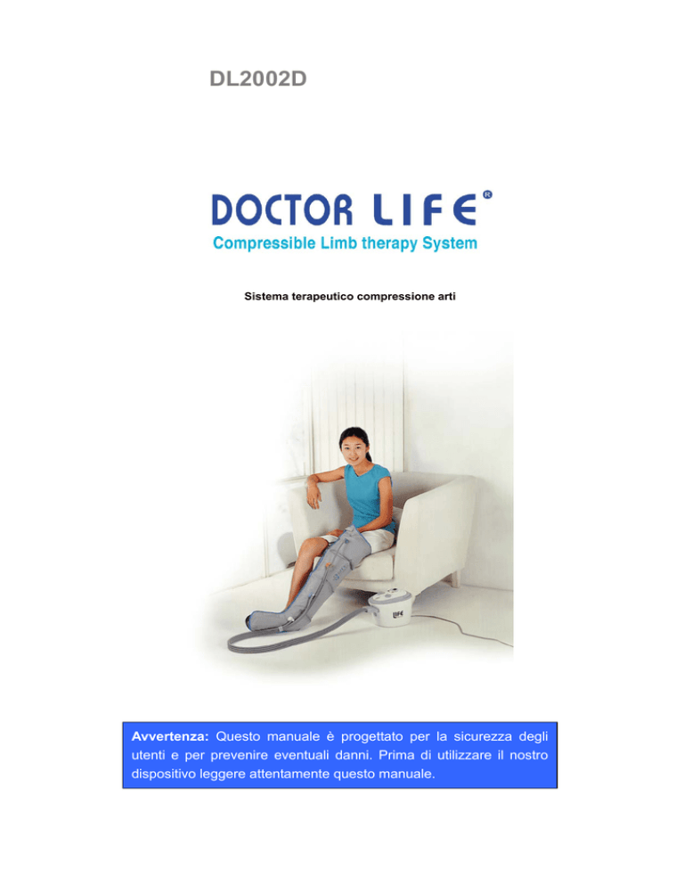 DL2002D Sistema terapeutico compressione arti Avvertenza: Questo manuale è progettato per la sicurezza degli utenti e per prevenire eventuali danni. Prima di utilizzare il nostro dispositivo leggere attentamente questo manuale. Grazie per aver scelto di utilizzare il nostro dispositivo. Utilizzo sicuro del dispositivo ● Prima di utilizzare il nostro dispositivo, si prega di leggere il presente manuale. ● Conservare il presente manuale vicino al dispositivo perchè sia facilmente consultabile. ● Questo manuale illustra il comportamento e le operazioni degli utenti per prevenire danni a persone o cose e per un sicuro utilizzo del dispositivo. Tabella delle indicazioni Morte o gravi ferite possibili nel caso in cui gli utenti non seguano le istruzioni. Pericolo Ferite o danni a cose possibili nel caso in cui vengano ignorate le istruzioni.. Attenzione Istruzione da rispettare scrupolosamente. Istruzione di divieto. DIVIETO Non disconnettere il dispositivo. Divieto di disconnessione del dispositivo INDICE PRINCIPI DI SICUREZZA 1) Sicurezza elettrica (4) 2) Sicurezza dell'utente (5) 3) Uso e manutenzione del dispositivo in sicurezza (6) 4) Utilizzo sicuro dell'unità gonfiabile (7) 5) Pulizia (8) 1. NOMENCLATURA DEGLI ELEMENTI 11 2. NOMENCLATURA E SPIEGAZIONE DEI COMANDI 12 3. SPECIFICHE 12 4. UTILIZZO 1) Caratteristiche del dispositivo 13 2) Precauzioni per chi usa il dispositivo per la prima volta 13 3) Come impostare la pressione 15 4) Utilizzo del timer 15 5) Come impostare la modalità di utilizzo 16 6) Come collegare il tubo alla presa per l'aria 17 7) Come collegare 4 connettori del tubo a un'unità gonfiabile 17 8) Come utilizzare un solo gambale 17 9) Come utilizzare due gambali 18 10) Come utilizzare un gambale e un bracciale contemporaneamente 19 11) Come utilizzare l'unità gonfiabile per il busto 19 12) Cosa fare se l'unità gonfiabile è troppo piccola 20 13) Come avviare/fermare il funzionamento del dispositivo 20 14) Come sostituire un fusibile 21 5. DIAGNOSI 22 Indicazioni per l'utilizzo domestico 24 Indicazioni Mediche 24 1) Sicurezza elettrica Questo dispositivo è per uso privato. Utilizzare il Smettere di usare il dispositivo in caso di odore dispositivo solo dopo aver controllato la tensione durante l'uso. In questo caso, togliere l'energia dell'impianto! elettrica e staccare la spina dalla presa. Informare (possibilità di incendi e scosse elettriche) quindi il centro assistenza. (possibilità di incendi e scosse elettriche) PROHIBITION 금지 Estrarre la spina quando non si usa il dispositivo o Quando si inserisce o stacca la spina, afferrare in caso di temporali. la stessa e non il cavo. 금지 주의 Non inserire o staccare la spina con le mani Non danneggiare, piegare o torcere il cavo di bagnate. (possibilità di scosse elettriche) alimentazione. (possibilità di incendi e scosse elettriche) 금지 금지 2) Sicurezza dell'utente Vietare l'utilizzo del dispositivo da parte dei bambini. Non usare il tubo dell'aria in prossimità di naso, Nel caso in cui si gonfi l'unità gonfiabile mentre è bocca e orecchie. indossata da un bambino, è possibile causargli (possibilità di gravi ferite) gravi ferite. 경고 경고 E' proibito l'uso del dispositivo in caso di dispositivi cardiaci. 경고 E' proibito l'uso del dispositivo per i pazienti protesi artificiali e inserti metallici, ecc. (nocivo per la salute) 경고 E' proibito l'uso del dispositivo per i pazienti con malattie cardiache, ipertensione, pelle infiammata, edema polmonare, tumore maligno, erisipela, disturbi circolatori alle arterie, alta temperatura, ecc. 경고 E' proibito l'uso del dispositivo in caso di cancro delle vene, tromboflebite profonda, flebotrombosi. (i vasi sanguigni possono essere occlusi) 경고 In caso di sintomi anomali durante l'uso del dispositivo, interromperne l'uso e rivolgersi al medico. P R O H IB I T IO N Dopo un intervento chirurgico non utilizzare il dispositivo fino a un totale recupero (soprattutto per operazioni a organi interni, nervi e cervello). (Possibilità di effetti dannosi) 경고 In caso di ubriachezza, non utilizzare il dispositivo fino a Si prega di indossare l'unità gonfiabile con un eliminare l'effetto dell'alcol. abbigliamento leggero e chiudere perfettamente la cerniera. Se così non fosse, durante l'uso la pelle dell'utente può subire ferite a causa della cerniera che potrebbe scendere. 금지 경고 3) Uso e manutenzione del dispositivo in sicurezza Utilizzare il dispositivo all'interno a una temperatura di 0°C - 40°C. Non utilizzare il dispositivo in ambienti con elevata Tenere il dispositivo in ambiente con umidità umidità. inferiore al 60%. (bagno / sauna, ecc) (In caso contrario si può generare pericolo di (Possibilità di incendi o scosse elettriche) danni o incendio) 금지 경고 Non utilizzare o conservare il dispositivo in Tenere lontano dalla portata dei bambini. prossimità di fonti di calore o alla luce diretta del Il dispositivo, se mal gestito da un bambino può sole. causare seri danni. (possibilità di danni, incendio e deformazione) 금지 금지 Nel caso in cui si utilizzi il dispositivo in un altro paese, si prega di controllare la tensione del paese Mantenere il dispositivo orizzontale. (In caso di prima di usare un dispositivo. pendenza, possibilità di pericolo o danni) (Se così non fosse, esiste la possibilità di incendio, scossa elettrica o di guasto) 주의 금지 4) Utilizzo sicuro dell'unità gonfiabile Non utilizzare l'unità gonfiabile indossando accessori Eccetto che per effettuare una prova di funzionamento, non soffiare aria nell'unità di abbigliamento quali orologi, ecc gonfiabile se questa non è indossata (pericolo di danni al dispositivo). (pericolo di danno alla pelle e di rottura dell'unità) 금지 금지 Non tenere l'unità gonfiabile in prossimità di fonti di Non tenere l'unità gonfiabile vicino a oggetti calore quali termosifoni, stufe, sigarette ecc. taglienti come aghi, forbici, ecc. (Pericolo di fuo