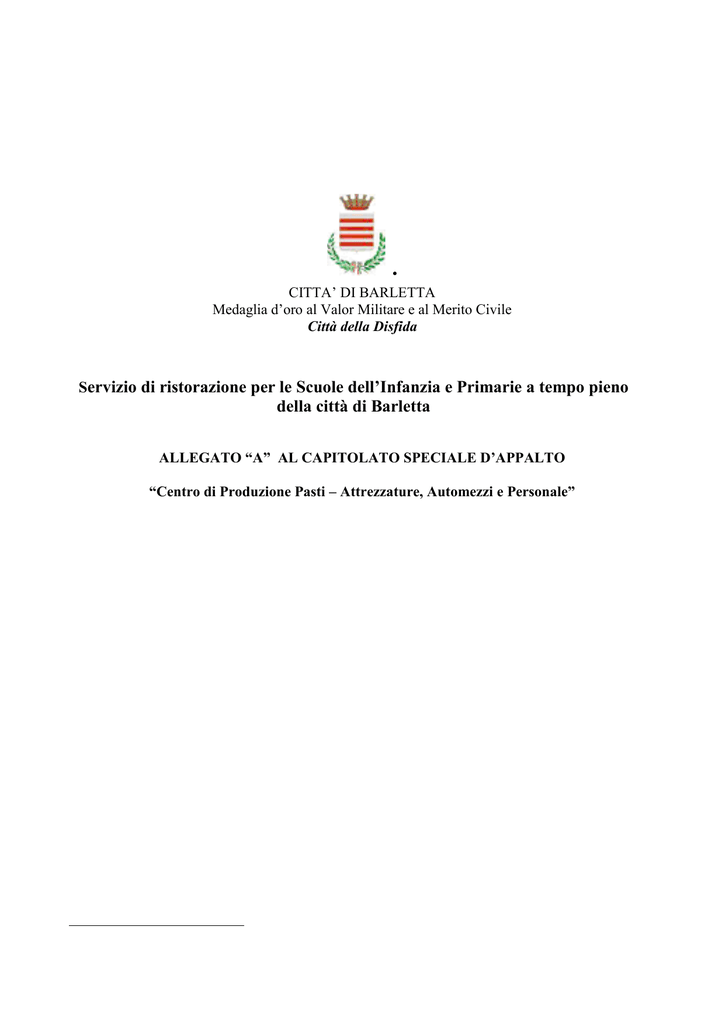 CITTA’ DI BARLETTA Medaglia d’oro al Valor Militare e al Merito Civile Città della Disfida Servizio di ristorazione per le Scuole dell’Infanzia e Primarie a tempo pieno della città di Barletta ALLEGATO “A” AL CAPITOLATO SPECIALE D’APPALTO “Centro di Produzione Pasti – Attrezzature, Automezzi e Personale” INDICE Descrizione Centro di Produzione Pasti Arredi e Attrezzature Centro di Produzione Pasti Automezzi Personale Allegati: Planimetria Centro di Produzione Cartografia della città Allegato “A” al Capitolato speciale d’appalto Centro di Produzione pasti, Attrezzature,Automezzi,Personale 2 DESCRIZIONE CENTRO DI PRODUZIONE VIA DONIZETTI Il Centro di Produzione Pasti messo a disposizione dal Comune di Barletta é situato al piano rialzato della scuola S. Domenico Savio in via Donizetti angolo Via Verdi. I locali sono stati sistemati dall’anno 1999 in poi a cura delle ditte aggiudicatarie delle procedure di gara di affidamento del servizio di refezione, su presentazione di conforme progetto tecnico. I locali risultano idonei ad ospitare un Centro di Cottura per la produzione di oltre 1200 pasti giornalieri. I locali prevedono ingressi separati per derrate e personale addetto alla gestione, un’ampia zona per lo stoccaggio delle derrate secche e refrigerate, n°3 zone distinte per la preparazione delle verdure, delle carni e dei piatti freddi, un’ampia zona cottura distinta per primi e secondi, la zona confezionamento pasti e la zona lavaggio. Le varie zone sono state distribuite per consentire alle derrate un percorso sempre in avanzata senza intersezione dei flussi pulito-sporco. E’ stata inserita inoltre una cella per lo stoccaggio temporaneo dei rifiuti posizionata a ridosso delle zone lavorazione e lavaggio. Nella zona di confezionamento sono presenti n°2 confezionatrici ad una pista con capacità produttiva di 1400 cicli/h in ciclo di termosaldatura. Gli spogliatoi sono distinti per uomini e donne e sono forniti di armadietti individuali lavabili a doppio scomparto per il deposito rispettivamente degli indumenti personali e quelli usati per il lavoro. I locali adibiti a servizi igienici sono dotati di locale antistante con porta a chiusura automatica ed i lavabi con erogazione dell’acqua a comando a pedale e con distributore di sapone liquido e di asciugamani elettrici. ATTREZZATURE Tutte le apparecchiature, installate nel Centro di Produzione Pasti a partire dall’anno 1999, sono realizzate dalle migliori industrie italiane e sono interamente in acciaio inox 18/10. In particolar modo per le apparecchiature di cottura è stato scelto il gruppo Electrolux Zanussi Grandi Impianti da anni leader nel settore delle realizzazioni di attrezzature per grandi cucine e affidabile sotto il profilo tecnico e di assistenza. Le apparecchiature sono costruite interamente in acciaio inox AISI 304 e sono montate su piedini regolabili, il cruscotto è sagomato per alloggiare i comandi senza farli sporgere anteriormente, e le manopole sono facilmente impugnabili e di lettura immediata. Inoltre, sono conformi alle principali normative Europee in materia di sicurezza ed igiene. Per il trasporto dei pasti presso le sedi distaccate, sono attualmente utilizzati n. 3 Ford Transit per trasporto pasti con vano di carico coibentato, conformi alle disposizioni vigenti in materia e casse termiche idonee per il trasporto di vaschette termosigillate monouso. OPERE MURARIE Dal 1999 sono state realizzate tutte le opere murarie necessarie per rendere i locali funzionali al Lay-Out proposto dalla ditta aggiudicataria dell’appalto. In modo particolare sono stati realizzati pavimenti antisdrucciolo, rivestimenti per un’altezza di metri lineari 2,20 zoccolino perimetrale a sguscia, griglia a pavimento in acciaio inox, porte e tramezzature resistenti al fuoco REI 120 e reti antinsetto posizionati sugli infissi esterni ed infine é stata realizzata un’apertura sulla muratura esterna di cmq.5000 così come previsto per le normative antincendio per l’areazione naturale del locale cucina. Nel 2003 è stata realizzata una tettoia all’ingresso del Centro cottura. IMPIANTI Le apparecchiature sono servite da una rete di impianti tecnologici, la cui realizzazione é stata eseguita a regola d’arte secondo le normative vigenti in favore della sicurezza. Per tali impianti é stata rilasciata la Dichiarazione di Conformità dalla Ditta Installatrice che attesta la corrispondenza delle opere impiantistiche alla Legge 46/90. In particolare gli impianti realizzati nel 1999 sono i seguenti: Impianto di aspirazione fumane; Impianto di estrazione bagni; Impianto di termoventilazione invernale e ventilazione estiva; Impianto elettrico (circuito luce-circuito prese e F.M.); Impianto gas; Impianto rilevazione fumi e gas; Impianto acqua calda, fredda e depurata; Impianto scarichi Impianto derattizzazione ad onde elettr. Particolare attenzione é stata dedicata dalla ditta all’impianto di estrazione fumane della cucina. Il buon funzionamento di questo impianto infatti, deve essere sempre assicurato per evacuare rapidamente le fumane prodotte dalle macchine di cottura, per evitare il propagarsi degli odori al di fuori dell’ambiente cucina e per garantire agli operatori della stessa le migliori condizioni ambientali di lavoro (D.Lgs. 81/2008). Il ventilatore di estrazione fumana ed il gruppo di termoventilazione sono stati installati a terrazzo della cucina. Di seguito si riporta in dettaglio ciascuno degli impianti sopra elencati: Impianto di aspirazione fumane, termoventilazione invernale e ventilazione estiva. Allegato “A” al Capitolato speciale d’appalto Centro di Produzione pasti, Attrezzature,Automezzi,Personale 3 L’impianto è stato proporzionato per le condizioni di totale funzionamento delle apparecchiature di cucina, quindi con la massima produzione di vapore acqueo e di fumane. La quantità d’aria da estrarre deriva da un approfondito esame del regime di funzionamento delle ap