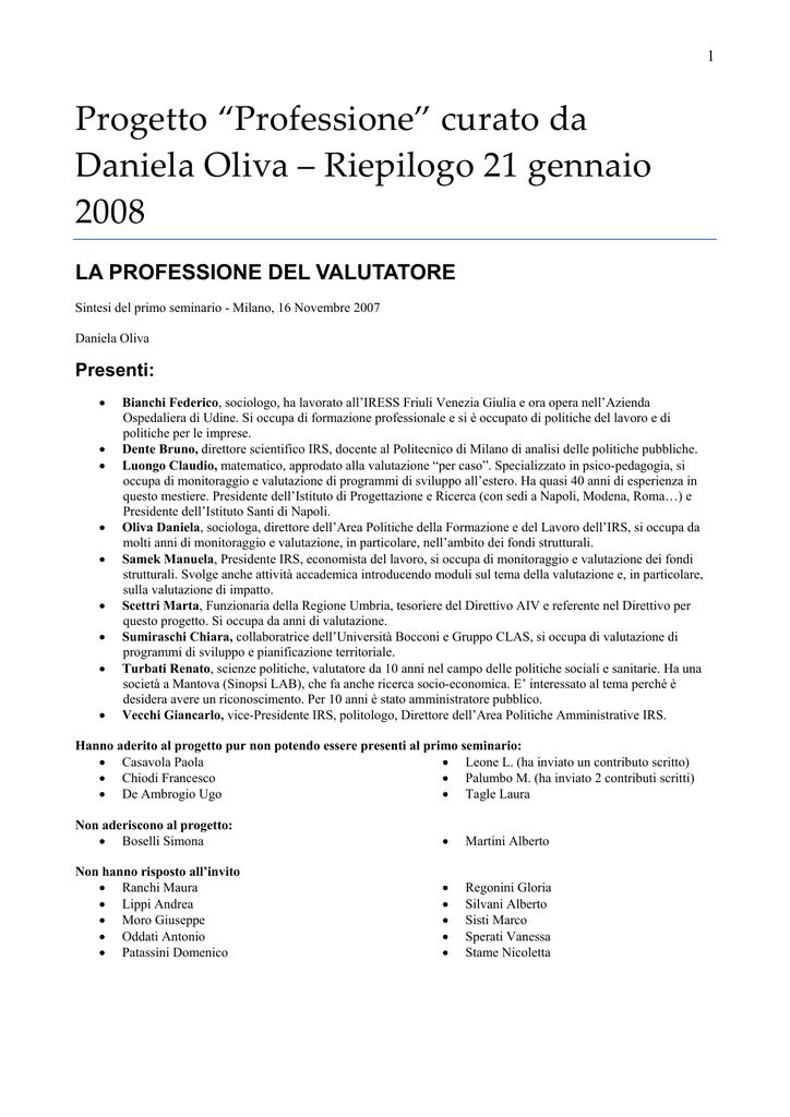 1 Progettoȱ“Professione”ȱcuratoȱdaȱ DanielaȱOlivaȱ–ȱRiepilogoȱ21ȱgennaioȱ 2008ȱ LA PROFESSIONE DEL VALUTATORE Sintesi del primo seminario - Milano, 16 Novembre 2007 Daniela Oliva Presenti: x x x x x x x x x Bianchi Federico, sociologo, ha lavorato all’IRESS Friuli Venezia Giulia e ora opera nell’Azienda Ospedaliera di Udine. Si occupa di formazione professionale e si è occupato di politiche del lavoro e di politiche per le imprese. Dente Bruno, direttore scientifico IRS, docente al Politecnico di Milano di analisi delle politiche pubbliche. Luongo Claudio, matematico, approdato alla valutazione “per caso”. Specializzato in psico-pedagogia, si occupa di monitoraggio e valutazione di programmi di sviluppo all’estero. Ha quasi 40 anni di esperienza in questo mestiere. Presidente dell’Istituto di Progettazione e Ricerca (con sedi a Napoli, Modena, Roma…) e Presidente dell’Istituto Santi di Napoli. Oliva Daniela, sociologa, direttore dell’Area Politiche della Formazione e del Lavoro dell’IRS, si occupa da molti anni di monitoraggio e valutazione, in particolare, nell’ambito dei fondi strutturali. Samek Manuela, Presidente IRS, economista del lavoro, si occupa di monitoraggio e valutazione dei fondi strutturali. Svolge anche attività accademica introducendo moduli sul tema della valutazione e, in particolare, sulla valutazione di impatto. Scettri Marta, Funzionaria della Regione Umbria, tesoriere del Direttivo AIV e referente nel Direttivo per questo progetto. Si occupa da anni di valutazione. Sumiraschi Chiara, collaboratrice dell’Università Bocconi e Gruppo CLAS, si occupa di valutazione di programmi di sviluppo e pianificazione territoriale. Turbati Renato, scienze politiche, valutatore da 10 anni nel campo delle politiche sociali e sanitarie. Ha una società a Mantova (Sinopsi LAB), che fa anche ricerca socio-economica. E’ interessato al tema perché è desidera avere un riconoscimento. Per 10 anni è stato amministratore pubblico. Vecchi Giancarlo, vice-Presidente IRS, politologo, Direttore dell’Area Politiche Amministrative IRS. Hanno aderito al progetto pur non potendo essere presenti al primo seminario: x Casavola Paola x Leone L. (ha inviato un contributo scritto) x Chiodi Francesco x Palumbo M. (ha inviato 2 contributi scritti) x De Ambrogio Ugo x Tagle Laura Non aderiscono al progetto: x Boselli Simona x Martini Alberto Non hanno risposto all’invito x Ranchi Maura x Lippi Andrea x Moro Giuseppe x Oddati Antonio x Patassini Domenico x x x x x Regonini Gloria Silvani Alberto Sisti Marco Sperati Vanessa Stame Nicoletta 2 Traccia utilizzata per il primo seminario: x x x x x x x x x Quella del valutatore è una professione (definizione di professione da condividere) oppure è una serie di competenze che si “innestano” su professioni diverse? (valutatore sociologo/psicologo…., oppure sociologo/psicologo… valutatore?) Qualunque sia la risposta al punto 1 (oppure, in che misura la risposta al punto 1 condiziona le risposte seguenti), che cosa è comporta la valorizzazione di un “valutatore professionista”, piuttosto che di un professionista valutatore? Di cosa di dobbiamo occupare? Formazione di base (certificata e/o esperienziale?) Formazione specialistica (certificata e/o esperienziale?) Rispetto di standard minimi di qualità? Rispetto di una qualità di prodotto certificata dal mercato? (curriculum, gradimento della committenza, ecc.) Riconoscimento di una comunità scientifica? (ad esempio, AIV) Tutela della professione (interventi presso i potenziali committenti in merito a requisiti di qualità, tariffe, ecc.) Altro…………… Una sintesi del dibattito (non rivista dai partecipanti) Il Seminario è stato registrato e, dunque, è possibile ripercorrere in maniera indipendente il ricco dibattito della giornata. La sintesi che segue non si configura, pertanto, come un verbale puntuale della giornata, ma riflette l’interpretazione di Daniela Oliva. In apertura del seminario si ricordano i criteri di scelta dei partecipanti (soci AIV che hanno espresso interesse al tema e/o che sono stati segnalati come tali da altri loro colleghi) e le finalità di questo primo seminario: impostare una prima riflessione sul tema della valutazione come “professione”, da proporre al Consiglio Direttivo che, al momento, non esprime una sua posizione ufficiale sulla questione. TURBATI La valutazione dovrebbe diventare una professione riconosciuta, anche se non è possibile arrivare a forme di riconoscimento come quello delle professioni liberali (avvocati, ecc…). Però bisognerebbe fare in modo che, posta una conoscenza metodologica di base, ci sia la possibilità di riconoscere degli ambiti e dei settori come in altre professioni. Ad esempio, gli avvocati hanno una loro formazione base e poi progressivamente, si specializzano settorialmente. Non si può fare valutazione su tutti i campi e, dunque, bisogna specializzarsi. In tutti i campi di lavoro e, in particolare nella valutazione, è importante avere una conoscenza amministrativa dei settori in cui ci si specializza, ma questa è una competenza che si acquisisce sul campo. La formazione di base dovrebbe essere data dall’Università e poi si potrebbe acquisire una esperienza di valutazione sul campo. Penso che AIV dovrebbe aiutare il professionista ad entrare nel mercato. Ma questo non basandosi su appartenenze ad Enti o altro, ma sulla qualità riconosciuta da un gruppo di pari dell’AIV. Questo gruppo di pari, che dovrebbe ruotare, decide chi può fregiarsi del titolo di valutatore e chi no. I giovani, in particolare, hanno difficoltà ad entrare in questo mercato. Se AIV fosse una comunità che ha interessi ad affermare la professione, per noi sarebbe importante perché noi ci scontriamo quotidianamente con il mercato e non abbiamo coperture da nessuno. Non so se questo valore aggiunto per noi sarebbe la stessa cosa per un accademico, per chi è già sul mercato, ecc. C’è d