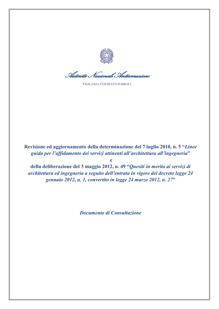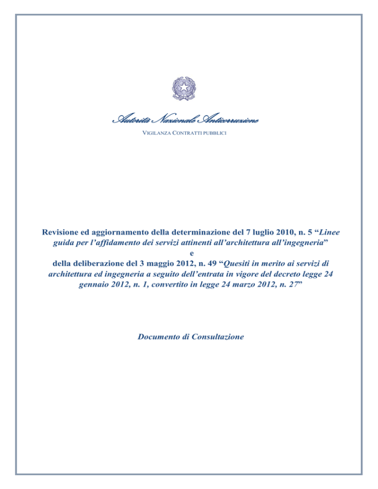 Autorità Nazionale Anticorruzione VIGILANZA CONTRATTI PUBBLICI Revisione ed aggiornamento della determinazione del 7 luglio 2010, n. 5 “Linee guida per l’affidamento dei servizi attinenti all’architettura all’ingegneria” e della deliberazione del 3 maggio 2012, n. 49 “Quesiti in merito ai servizi di architettura ed ingegneria a seguito dell’entrata in vigore del decreto legge 24 gennaio 2012, n. 1, convertito in legge 24 marzo 2012, n. 27” Documento di Consultazione Sommario 1. Inquadramento generale ...................................................................................................................... 1 2. Gli affidamenti di importo inferiore a centomila euro ........................................................................ 5 3. Affidamento dei concorsi di progettazione e di idee ............................................................................ 7 4. I requisiti di partecipazione alla gara .................................................................................................. 9 5. Classi, categorie e tariffe professionali .............................................................................................. 12 6. Le forme di partecipazione alla gara ................................................................................................. 15 7. I criteri di aggiudicazione................................................................................................................... 17 8. Indicazioni sulle modalità di applicazione dell’offerta economicamente più vantaggiosa ............. 20 8.1. La fissazione della soglia e la formula per il prezzo.......................................................................... 20 8.2. Gli elementi di valutazione ed i criteri motivazionali ........................................................................ 24 9. La valutazione di anomalia delle offerte............................................................................................ 28 10. La verifica e validazione della progettazione..................................................................................... 30 2 1. Inquadramento generale L’affidamento dei servizi attinenti all’architettura ed all’ingegneria, anche integrata, nonché gli altri servizi tecnici, è disciplinato dall’art. 91 del d.lgs. 12 aprile 2006, n. 163, (nel seguito, “Codice”), in relazione all’importo dei relativi corrispettivi: inferiore ad euro centomila ovvero pari o superiore a tale ammontare. Per l’affidamento dei servizi di importo superiore a centomila euro sono previste però due diverse forme di pubblicità: per gli appalti fra centomila euro e la soglia comunitaria è prescritta la pubblicità in ambito nazionale, mentre per gli appalti sopra tale soglia è prescritta la pubblicità sia in ambito nazionale che comunitario. L’art. 91 del Codice prevede, infatti, al comma 1, che le attività di progettazione, di coordinamento della sicurezza in fase di progettazione ed in fase di esecuzione, di direzione lavori e di collaudo – attività tutte riconducibili alla categoria 12 dell’elenco dei servizi di cui all’allegato II A del Codice – qualora l’importo sia pari o superiore a centomila euro, sono affidate secondo le disposizioni della parte II, titoli I e II del Codice. Ciò comporta che, per i servizi di ingegneria e architettura di importo compreso fra centomila euro e le soglie di rilevanza comunitaria di cui all’art. 28, comma 1, lett. a) e b), del Codice, si applicano la disciplina comune per i contratti pubblici sotto soglia di cui all’art. 121 e le disposizioni in materia di avvisi e bandi di gara, termini e pubblicità di cui all’art. 124; mentre, per i servizi di ingegneria e architettura di importo superiore alla soglia comunitaria, si applicano le disposizioni della parte II, titolo I per quanto concerne i termini, i bandi, gli avvisi di gara e la pubblicità. La scelta del soggetto avviene, pertanto, a seguito di una procedura aperta, ristretta o negoziata, quest’ultima nei casi tassativamente previsti dal Codice, secondo quanto disciplinato dalla parte II, titolo I del Codice. Si ricorda che, ai sensi dell’art. 62, comma 1, del Codice, la possibilità di limitare il numero dei candidati idonei da invitare (c.d. “forcella”), nel caso dei contratti pubblici di servizi e forniture, è limitata alle sole procedure ristrette e negoziate con pubblicazione di un bando di gara e nel dialogo competitivo. L’art. 62 del Codice prevede, in questo caso, che le stazioni appaltanti indichino nel bando di gara i criteri, oggettivi e non discriminatori, secondo il principio di proporzionalità, che intendono applicare per limitare il numero massimo di partecipanti ammessi. Ai sensi dell’allegato L del Regolamento, tra i criteri rispondenti a tali principi rientrano il fatturato, l’importo dei lavori, il numero medio annuo del personale tecnico. In proposito, l’art. 265, comma 1, del Regolamento, precisa, nel caso delle procedure negoziate con bando e nel dialogo competitivo 1, qualora 1 Poiché la disposizione in esame non la contempla espressamente, si pongono dei dubbi in ordine all’applicazione della forcella al caso delle procedure ristrette che, viceversa, è espressamente consentita dall’art. 62, comma 1, del Codice. Il disallineamento normativo dovrebbe essere risolto nel senso indicato dal suddetto comma 1 dell’art. 62. 1 il numero dei candidati in possesso dei requisiti minimi sia superiore al massimo fissato nel bando di gara, che la scelta dovrà avvenire per metà arrotondata per difetto, sulla base dei criteri di cui al suddetto allegato L, e per metà mediante sorteggio. La scelta deve essere effettuata in seduta pubblica (cfr. art. 265, comma 2). Il medesimo art. 91 stabilisce, al comma 2, che gli incarichi relativi alle suddette attività, il cui importo sia inferiore a centomila euro, possano essere affidati secondo la procedura negoziata senza