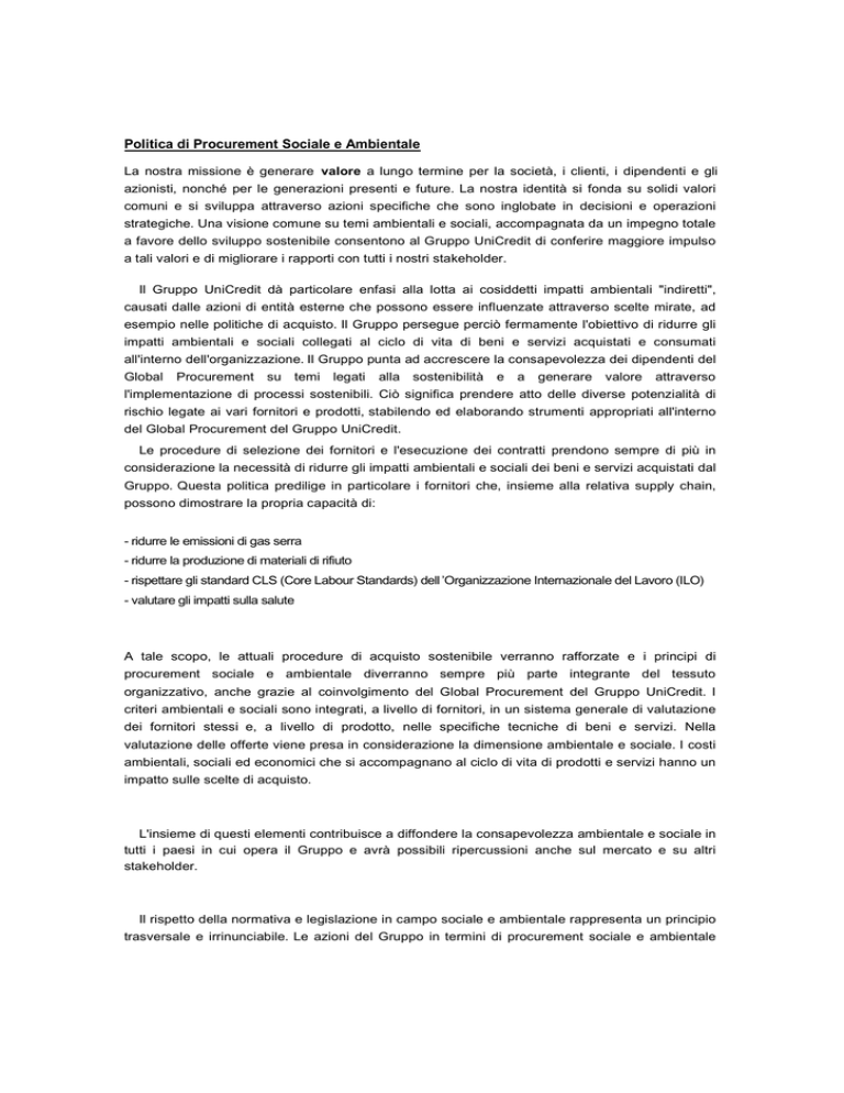 Politica di Procurement Sociale e Ambientale La nostra missione è generare valore a lungo termine per la società, i clienti, i dipendenti e gli azionisti, nonché per le generazioni presenti e future. La nostra identità si fonda su solidi valori comuni e si sviluppa attraverso azioni specifiche che sono inglobate in decisioni e operazioni strategiche. Una visione comune su temi ambientali e sociali, accompagnata da un impegno totale a favore dello sviluppo sostenibile consentono al Gruppo UniCredit di conferire maggiore impulso a tali valori e di migliorare i rapporti con tutti i nostri stakeholder. Il Gruppo UniCredit dà particolare enfasi alla lotta ai cosiddetti impatti ambientali "indiretti", causati dalle azioni di entità esterne che possono essere influenzate attraverso scelte mirate, ad esempio nelle politiche di acquisto. Il Gruppo persegue perciò fermamente l'obiettivo di ridurre gli impatti ambientali e sociali collegati al ciclo di vita di beni e servizi acquistati e consumati all'interno dell'organizzazione. Il Gruppo punta ad accrescere la consapevolezza dei dipendenti del Global Procurement su temi legati alla sostenibilità e a generare valore attraverso l'implementazione di processi sostenibili. Ciò significa prendere atto delle diverse potenzialità di rischio legate ai vari fornitori e prodotti, stabilendo ed elaborando strumenti appropriati all'interno del Global Procurement del Gruppo UniCredit. Le procedure di selezione dei fornitori e l'esecuzione dei contratti prendono sempre di più in considerazione la necessità di ridurre gli impatti ambientali e sociali dei beni e servizi acquistati dal Gruppo. Questa politica predilige in particolare i fornitori che, insieme alla relativa supply chain, possono dimostrare la propria capacità di: - ridurre le emissioni di gas serra - ridurre la produzione di materiali di rifiuto - rispettare gli standard CLS (Core Labour Standards) dell ’Organizzazione Internazionale del Lavoro (ILO) - valutare gli impatti sulla salute A tale scopo, le attuali procedure di acquisto sostenibile verranno rafforzate e i principi di procurement sociale e ambientale diverranno sempre più parte integrante del tessuto organizzativo, anche grazie al coinvolgimento del Global Procurement del Gruppo UniCredit. I criteri ambientali e sociali sono integrati, a livello di fornitori, in un sistema generale di valutazione dei fornitori stessi e, a livello di prodotto, nelle specifiche tecniche di beni e servizi. Nella valutazione delle offerte viene presa in considerazione la dimensione ambientale e sociale. I costi ambientali, sociali ed economici che si accompagnano al ciclo di vita di prodotti e servizi hanno un impatto sulle scelte di acquisto. L'insieme di questi elementi contribuisce a diffondere la consapevolezza ambientale e sociale in tutti i paesi in cui opera il Gruppo e avrà possibili ripercussioni anche sul mercato e su altri stakeholder. Il rispetto della normativa e legislazione in campo sociale e ambientale rappresenta un principio trasversale e irrinunciabile. Le azioni del Gruppo in termini di procurement sociale e ambientale prendono in considerazione politiche e linee guida a livello nazionale e internazionale, con l'intento particolare di dare maggiore vigore alle iniziative europee a sostegno della produzione e del consumo sostenibili. Questa politica di procurement verrà implementata in modo trasparente e graduale, al fine di garantire il rispetto delle regole fondamentali del procurement e assicurare risultati positivi in termini di competitività tra i fornitori di beni e servizi. È necessario trovare un equilibrio ottimale tra i requisiti di tipo socio-ambientale e la capacità dei fornitori europei di soddisfare tali requisiti. La trasparenza in relazione a colleghi, clienti, fornitori, investitori e comunità locali sarà il motore trainante dell'implementazione del procurement sociale e ambientale. Con questa premessa, il personale direttamente coinvolto nel procurement all'interno del Gruppo UniCredit prenderà parte alla definizione di un programma specifico per lo sviluppo del procurement sociale e ambientale in tutta l'organizzazione. Ciò comprende: rafforzamento di iniziative pilota realizzate negli anni precedenti selezione di beni e servizi prioritari per la definizione di criteri ambientali standard da includere nelle procedure di procurement definizione di procedure per l’integrazione di criteri ambientali nell’acquisto di beni e servizi rafforzamento di strumenti utilizzati per comunicare e selezionare i fornitori programmi di sviluppo delle competenze per il personale di procurement del Gruppo e per gli utenti finali e servizi programma di approccio si fornitori All'interno dell'organizzazione verrà dato ampio risalto alla politica di procurement sociale e ambientale, con lo scopo di garantire che l'impegno di tutti i partecipanti alle attività di procurement sia diretto agli stessi obiettivi comuni e di intrecciare legami con altre iniziative di sostenibilità. Paolo Chiaverini Chief Procurement Officer del Gruppo UniCredit Gruppo UniCredit Reparto Global Sourcing Viale Bodio 29 20158 Milano Data del comunicato: 09/2010